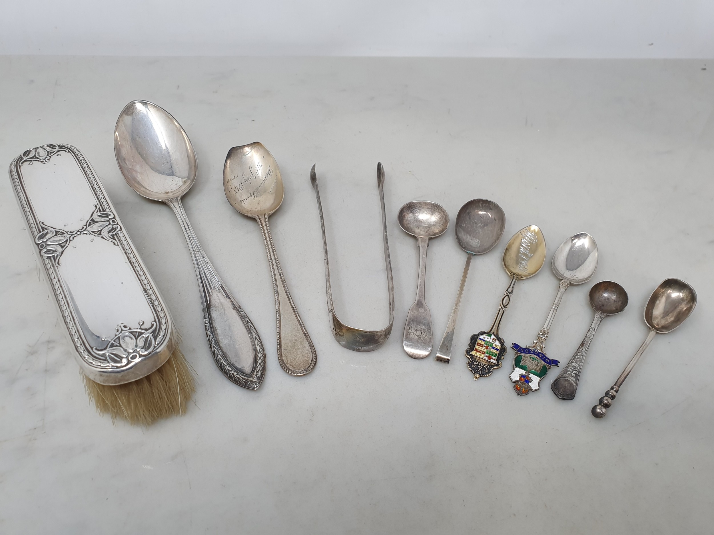 A pair of George III silver bright-cut Sugar Tongs, London 1800, a silver mounted Brush and eight various Spoons