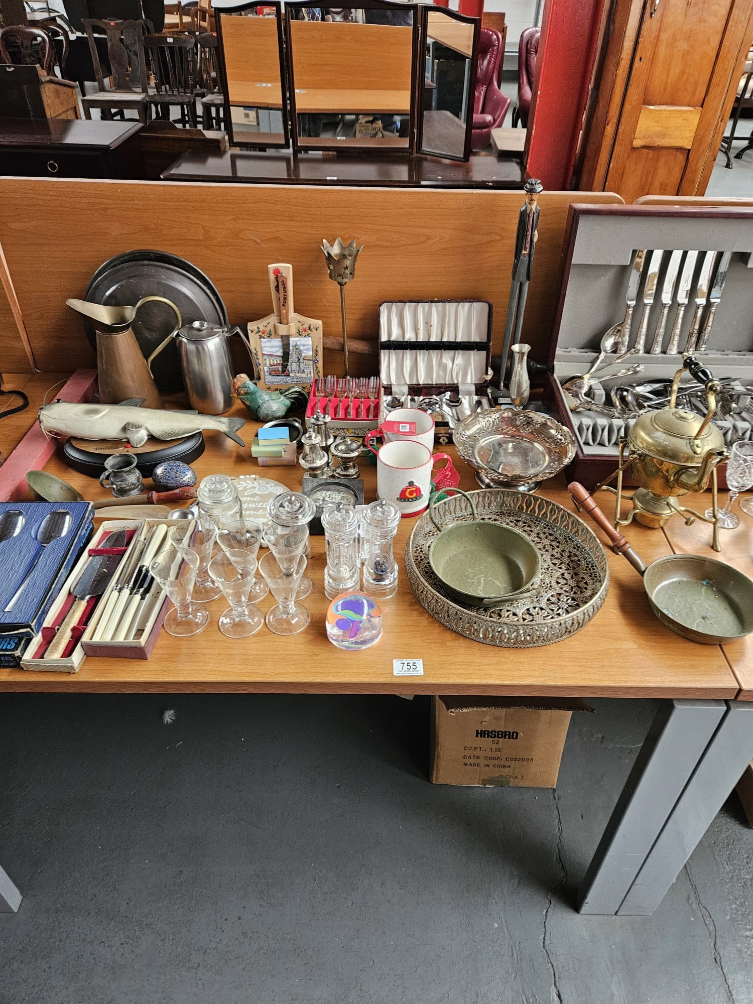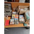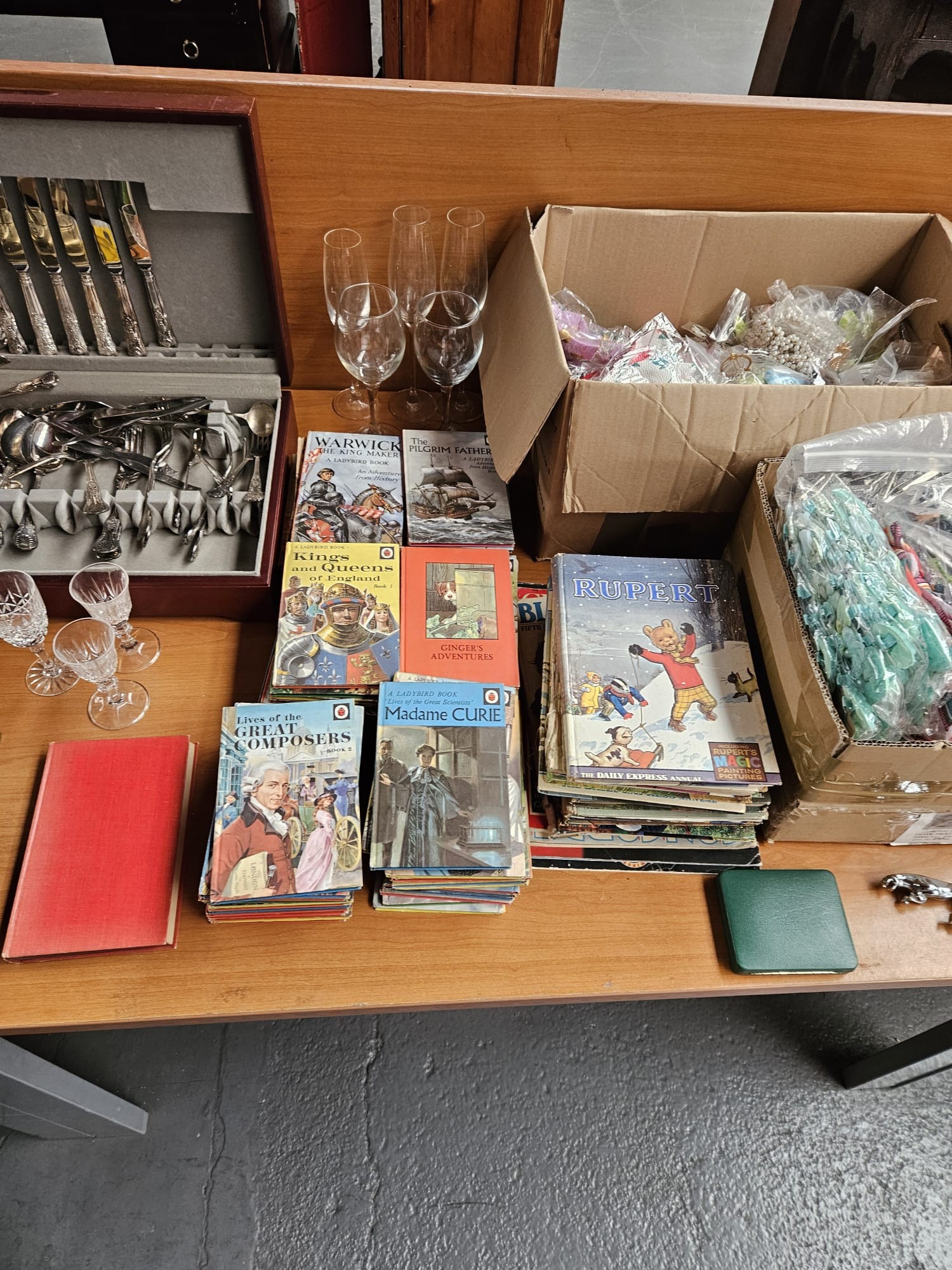 A selection of household items including cutlery sets, Ladybird books, Rupert annuals, crafting items, metalware etc