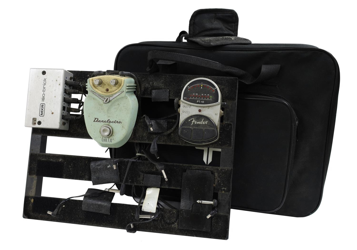 Tourtech guitar pedal board with outer gig bag fitted with an MXR ISO-Brick power supply, Fender PT-10 tuner and a Danelectro Cool Cat guitar pedal