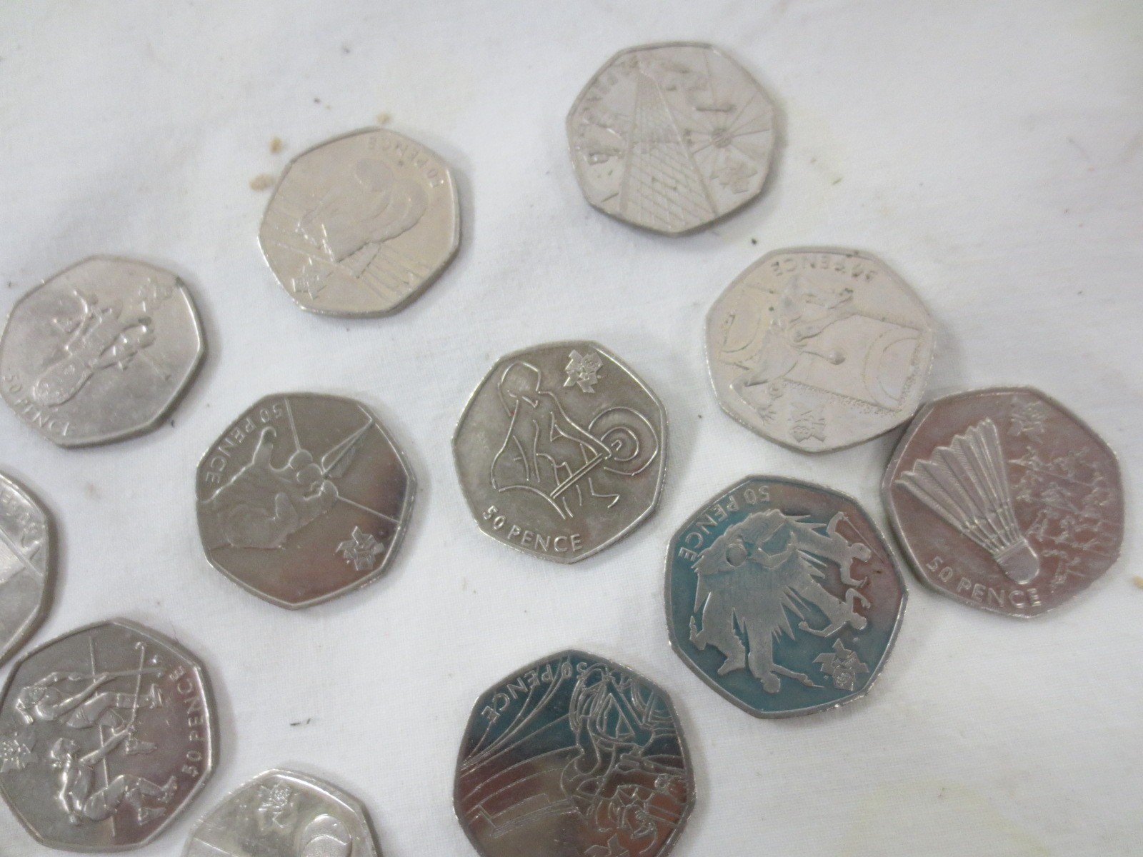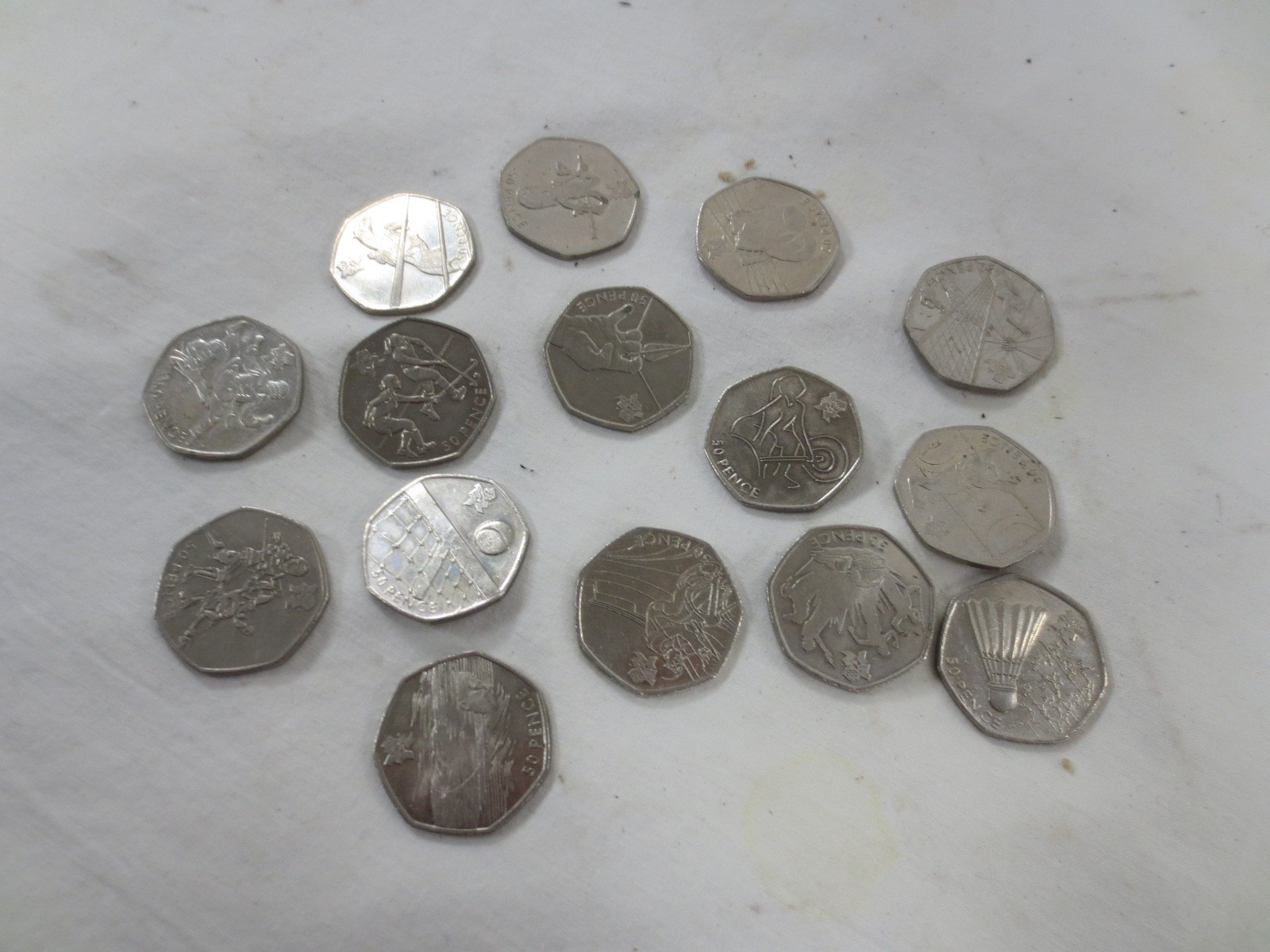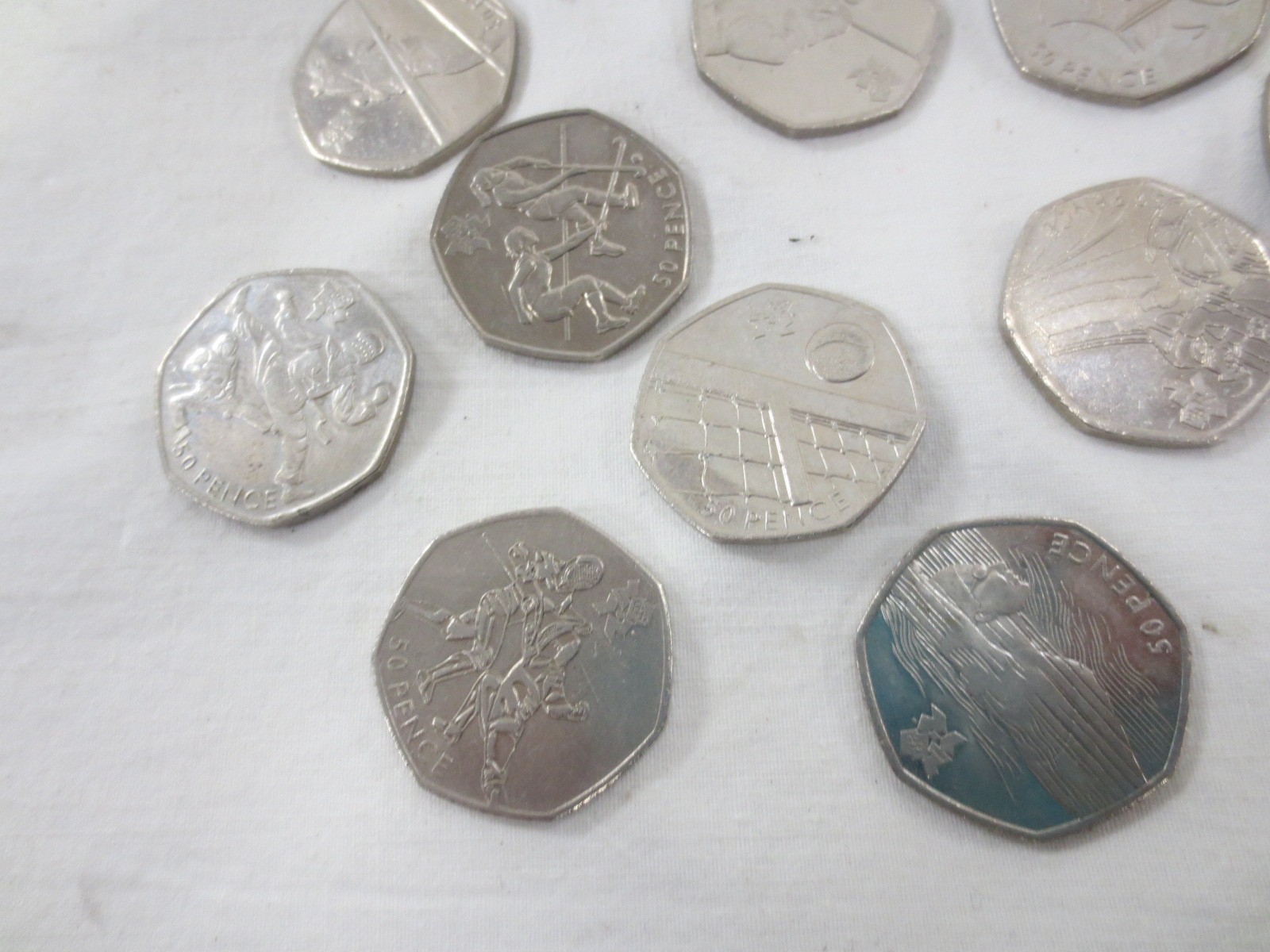 Fifteen 2011 Olympics fifty pence coins, including tennis, fencing, cycling, modern pentathlon