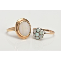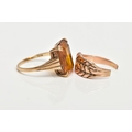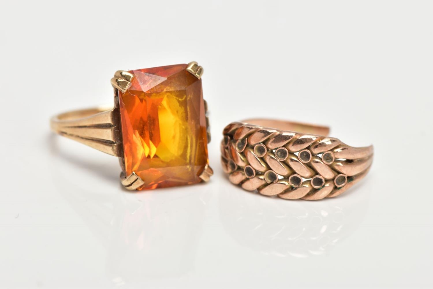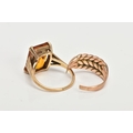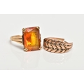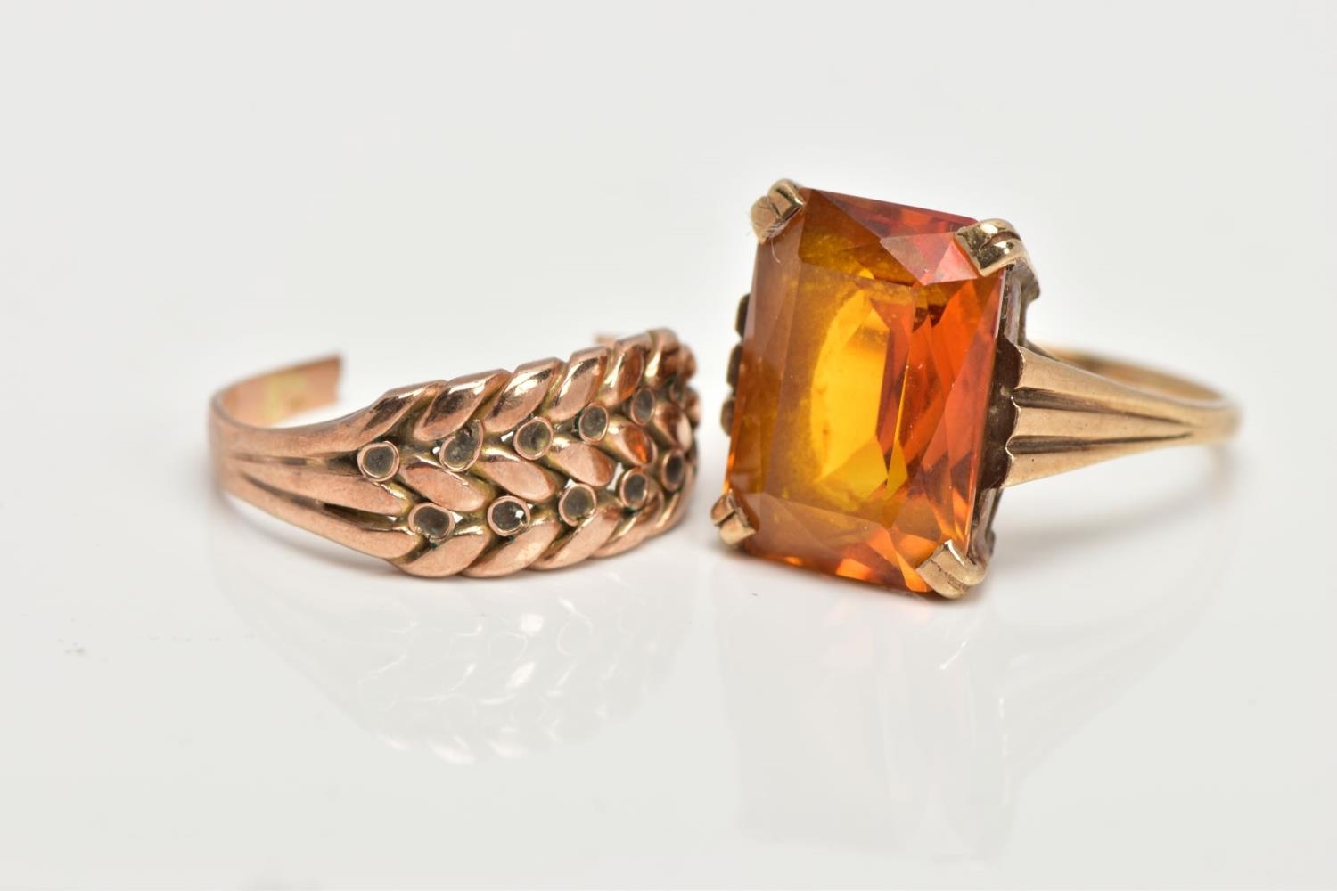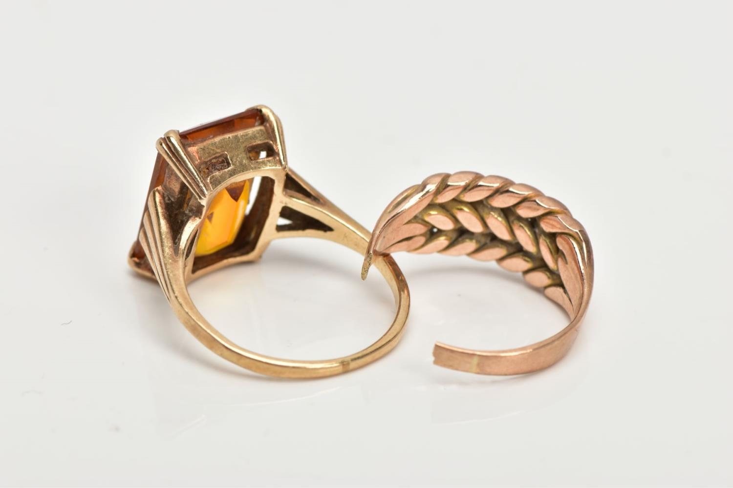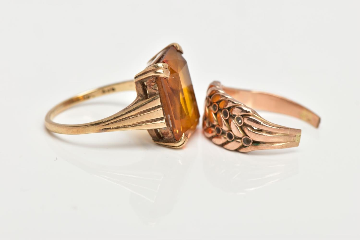 TWO YELLOW METAL RINGS, the first designed with a four claw set, rectangular cut citrine, textured tapered shoulders leading on to a plain polished band, stamped '9ct', ring size L, approximate gross weight 4.5 grams, together with a broken yellow metal keeper ring (missing stones, broken shank and unmarked), approximate gross weight 2.9 grams
