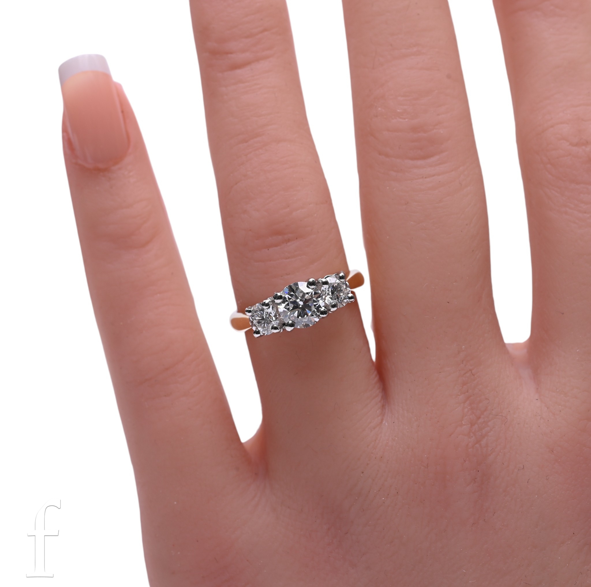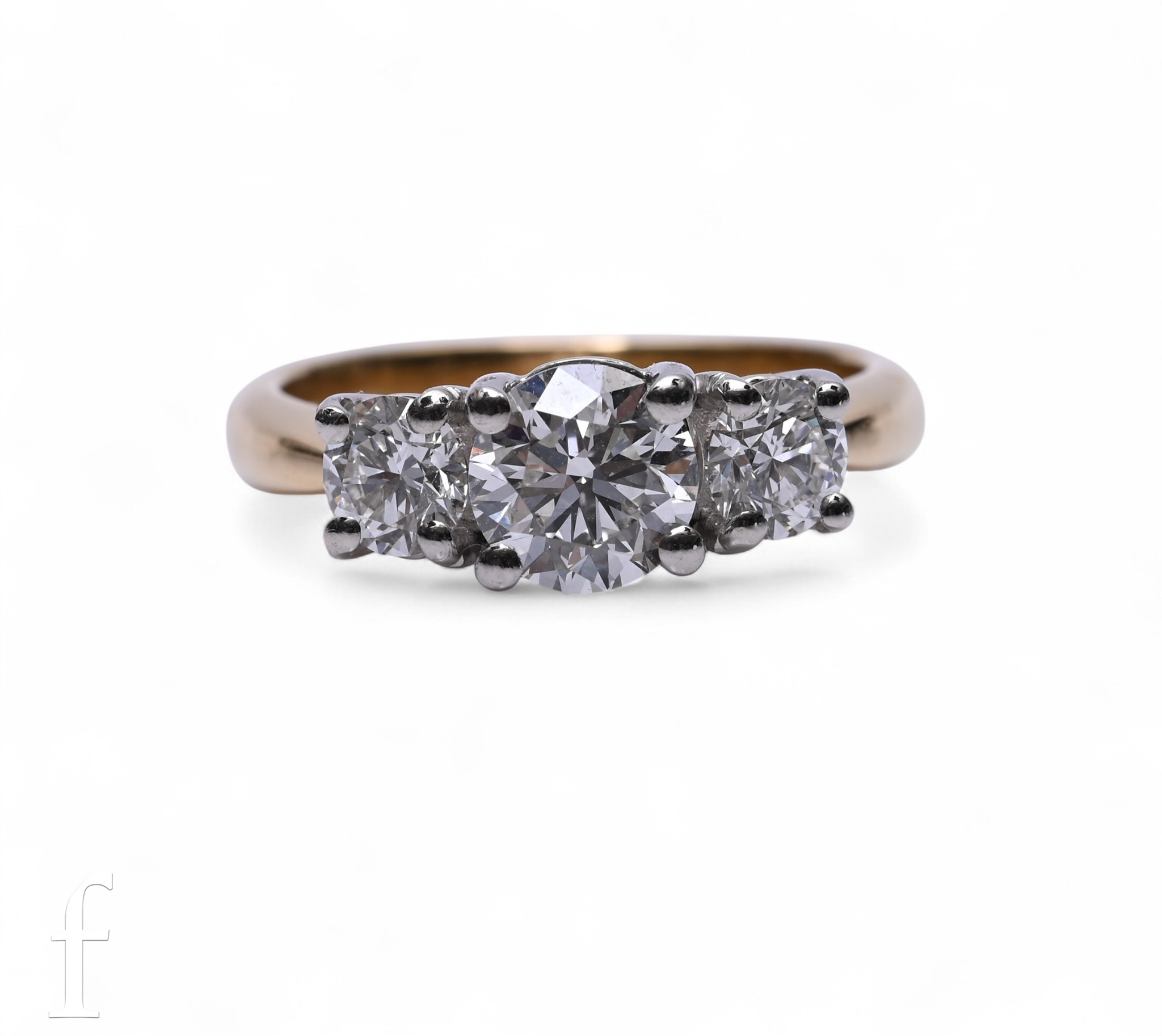 A three stone diamond ring, the central brilliant-cut diamond weighing 1.01 carats, four claw set above two brilliant-cut diamonds weighing 0.35 and 0.36 carats, four claw set in platinum, above an 18 carat yellow gold mount, Makers Mark 'SM', hallmarked, total weight 5.4g, ring size L1/2, originally designed and mounted by Mappin & Webb and accompanied by a presentation box containing a ring box, Product Care Guide And Services and a half bottle of Moet & Chandon Champagne.