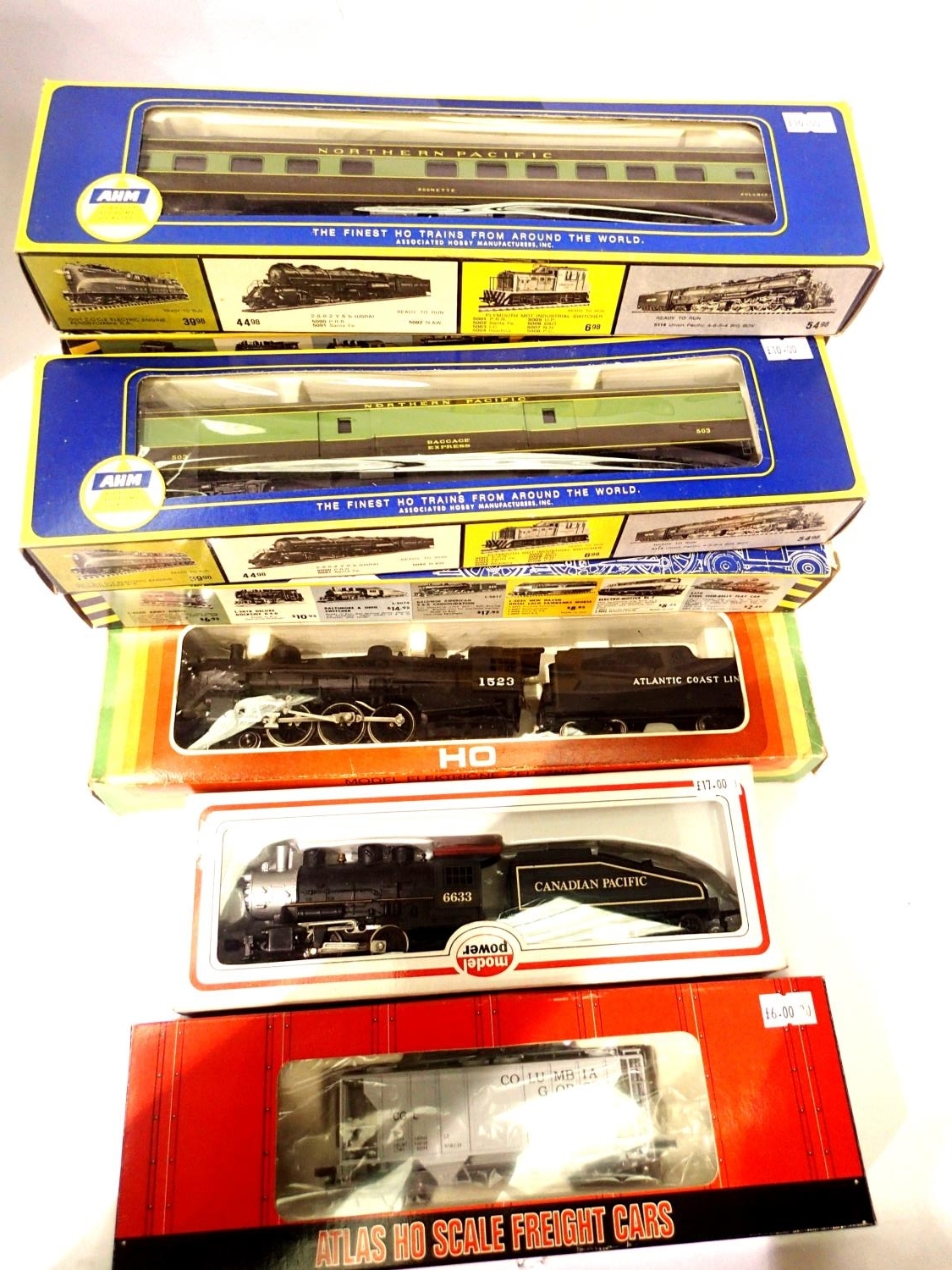 American HO including: Atlas 0.4.0 and tender Canadian Pacific, Mechano 4.6.2 and tender Atlantic Coast, AHM Northern Pacific coaches x7 and an Atlas Hopper. P&P Group 3 (£25+VAT for the first lot and £5+VAT for subsequent lots)