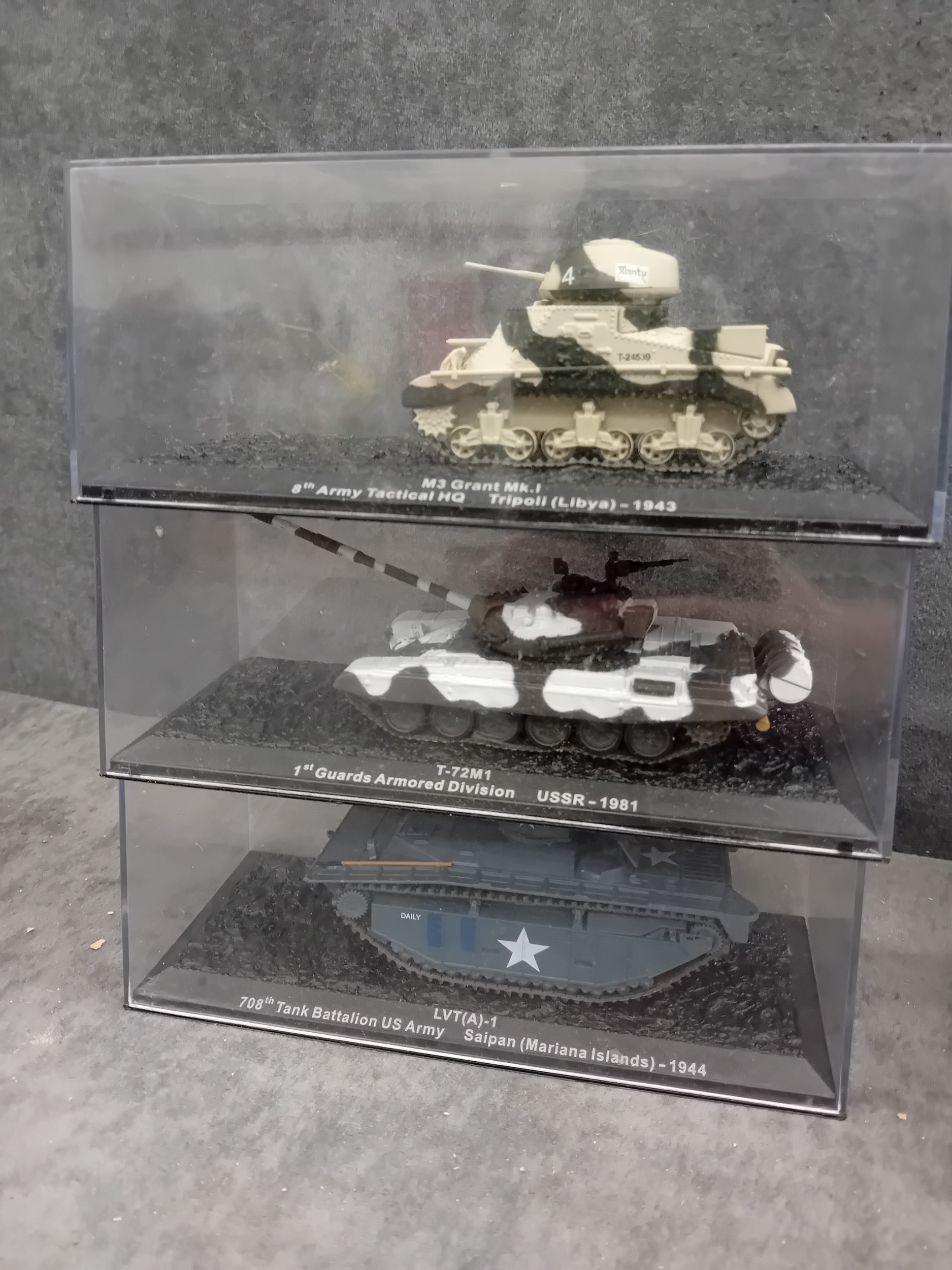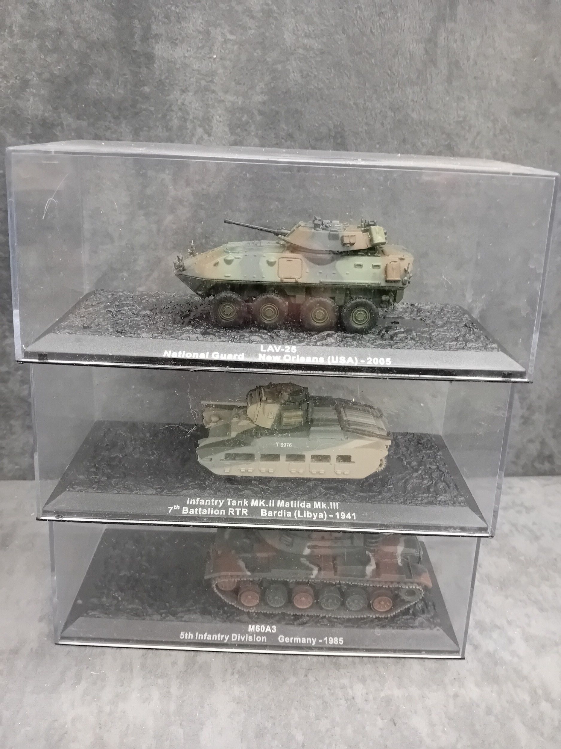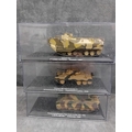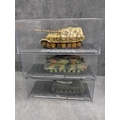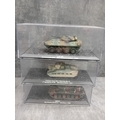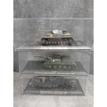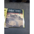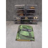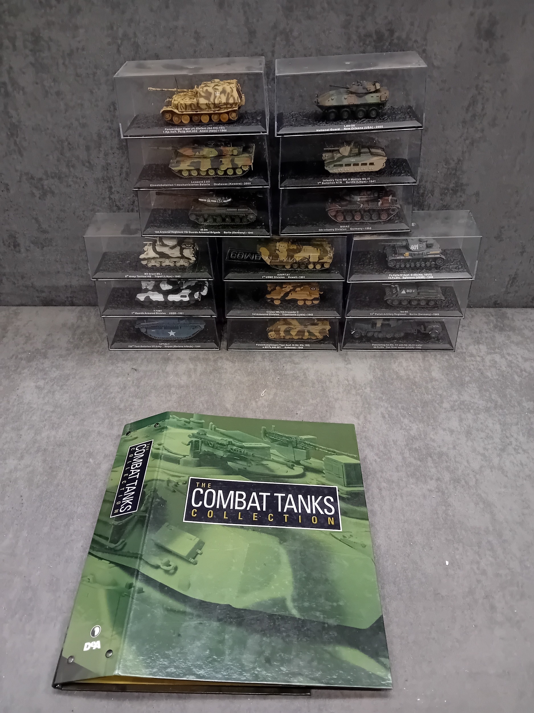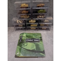 A collection of fifteen DeAgostini 'The Combat Tanks Collection' die-cast or plastic scale models of military vehicles. The lot comprises models predominantly representing tanks and armored personnel carriers, spanning various historical periods from World War II to modern conflicts (c. 1941-2005). Each realistically styled model is presented on a black base within a clear plastic display case, featuring labels that detail the specific vehicle type (e.g., Panzerkampfwagen, M3 Grant Mk.I, T-72M1), its associated unit, and historical deployment context including location and year (e.g., Germany 1944, USSR 1981, Kuwait 1991, Kosovo 2000). Accompanying the models is a 'The Combat Tanks Collection' binder, identified as issue 31, published by D'Agostini, which provides 'Precision Models Military History Technical Data.'