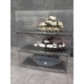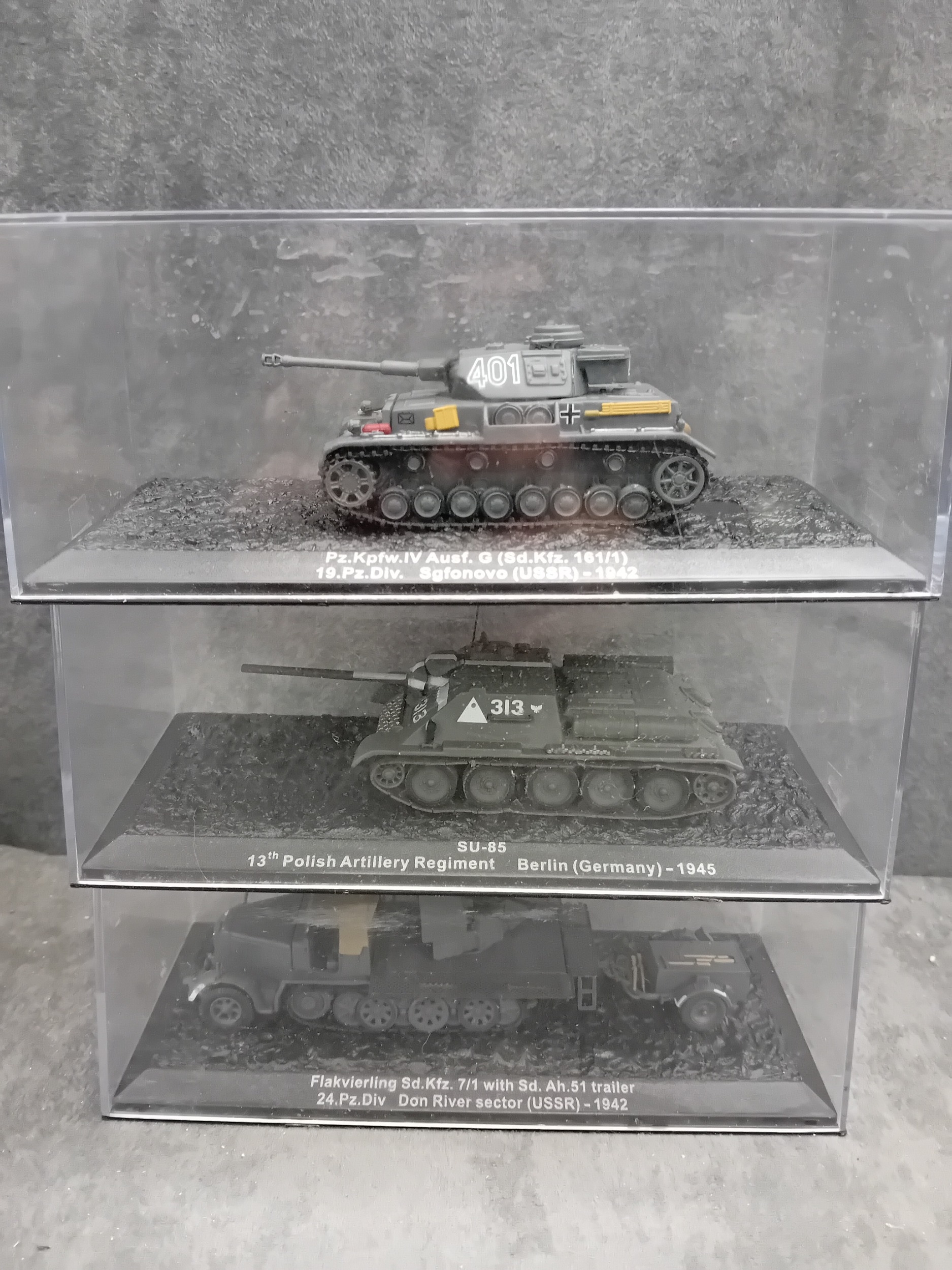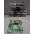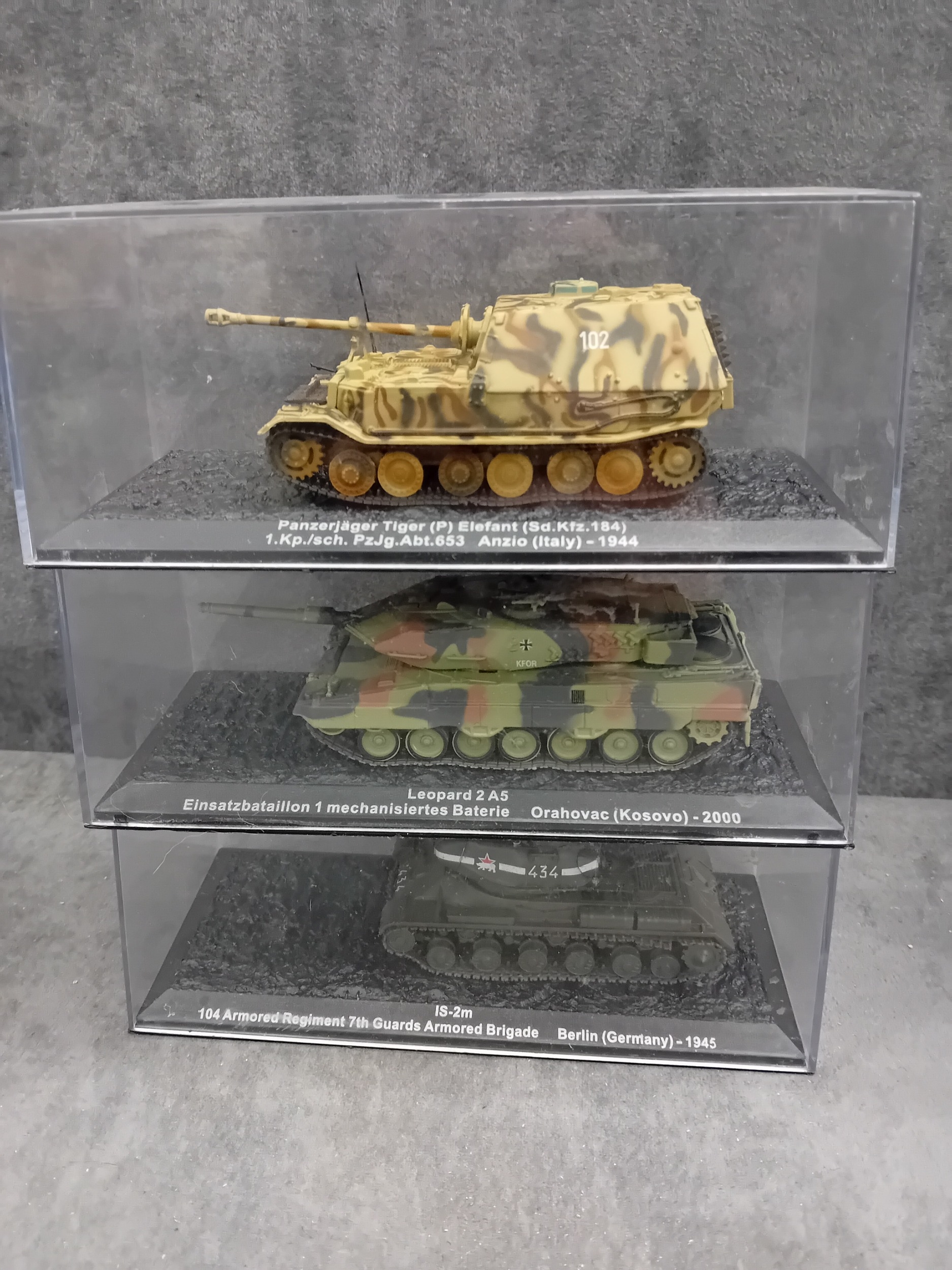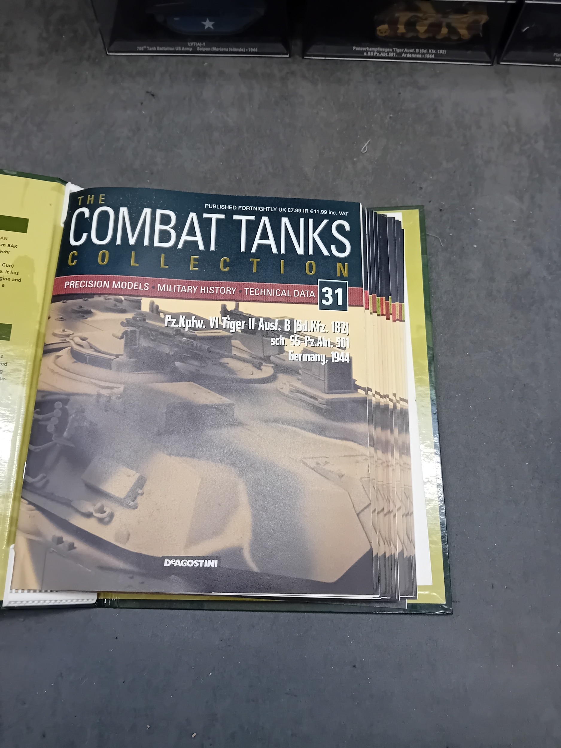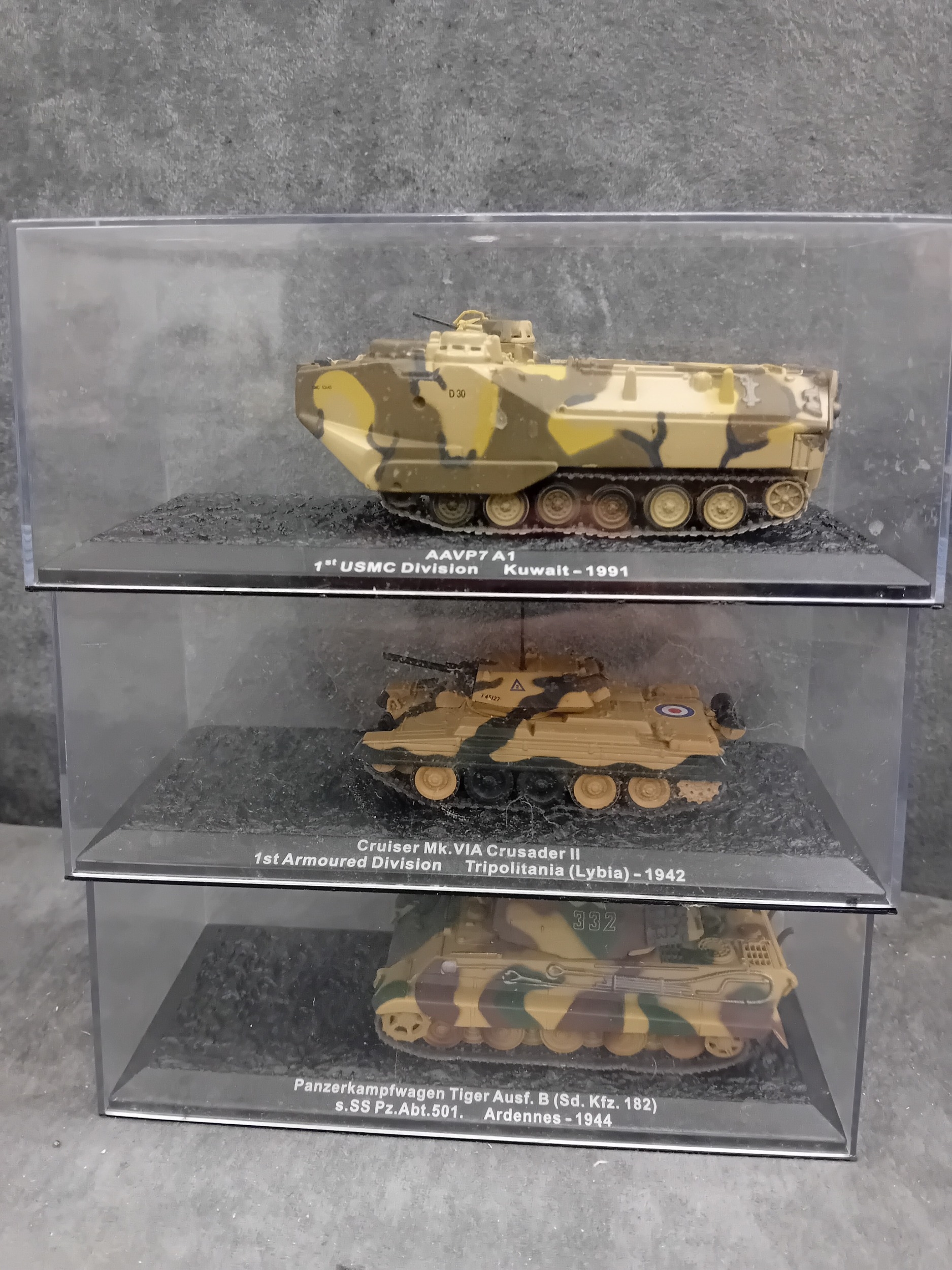 A collection of fifteen DeAgostini 'The Combat Tanks Collection' die-cast or plastic scale models of military vehicles. The lot comprises models predominantly representing tanks and armored personnel carriers, spanning various historical periods from World War II to modern conflicts (c. 1941-2005). Each realistically styled model is presented on a black base within a clear plastic display case, featuring labels that detail the specific vehicle type (e.g., Panzerkampfwagen, M3 Grant Mk.I, T-72M1), its associated unit, and historical deployment context including location and year (e.g., Germany 1944, USSR 1981, Kuwait 1991, Kosovo 2000). Accompanying the models is a 'The Combat Tanks Collection' binder, identified as issue 31, published by D'Agostini, which provides 'Precision Models Military History Technical Data.'