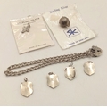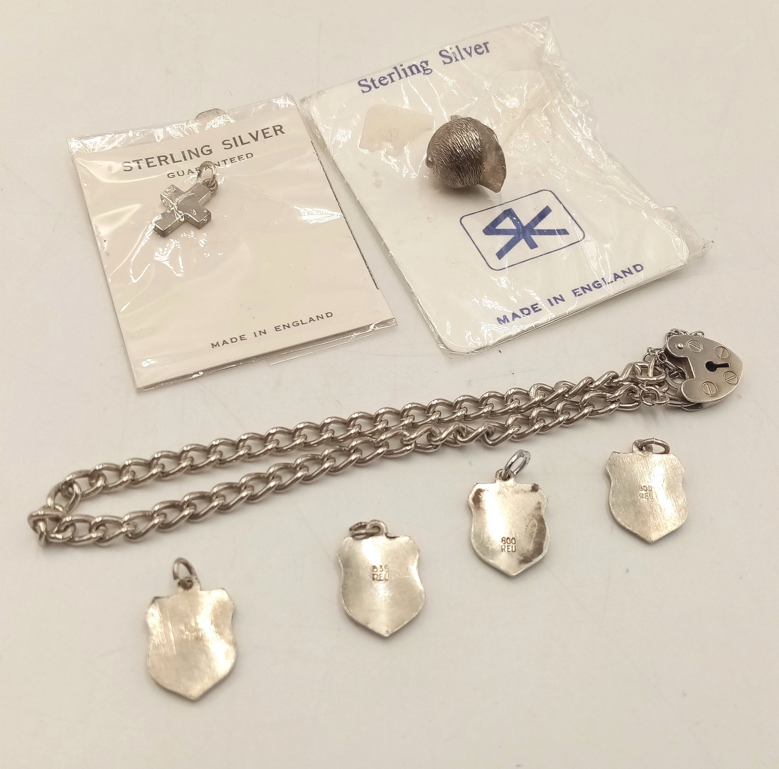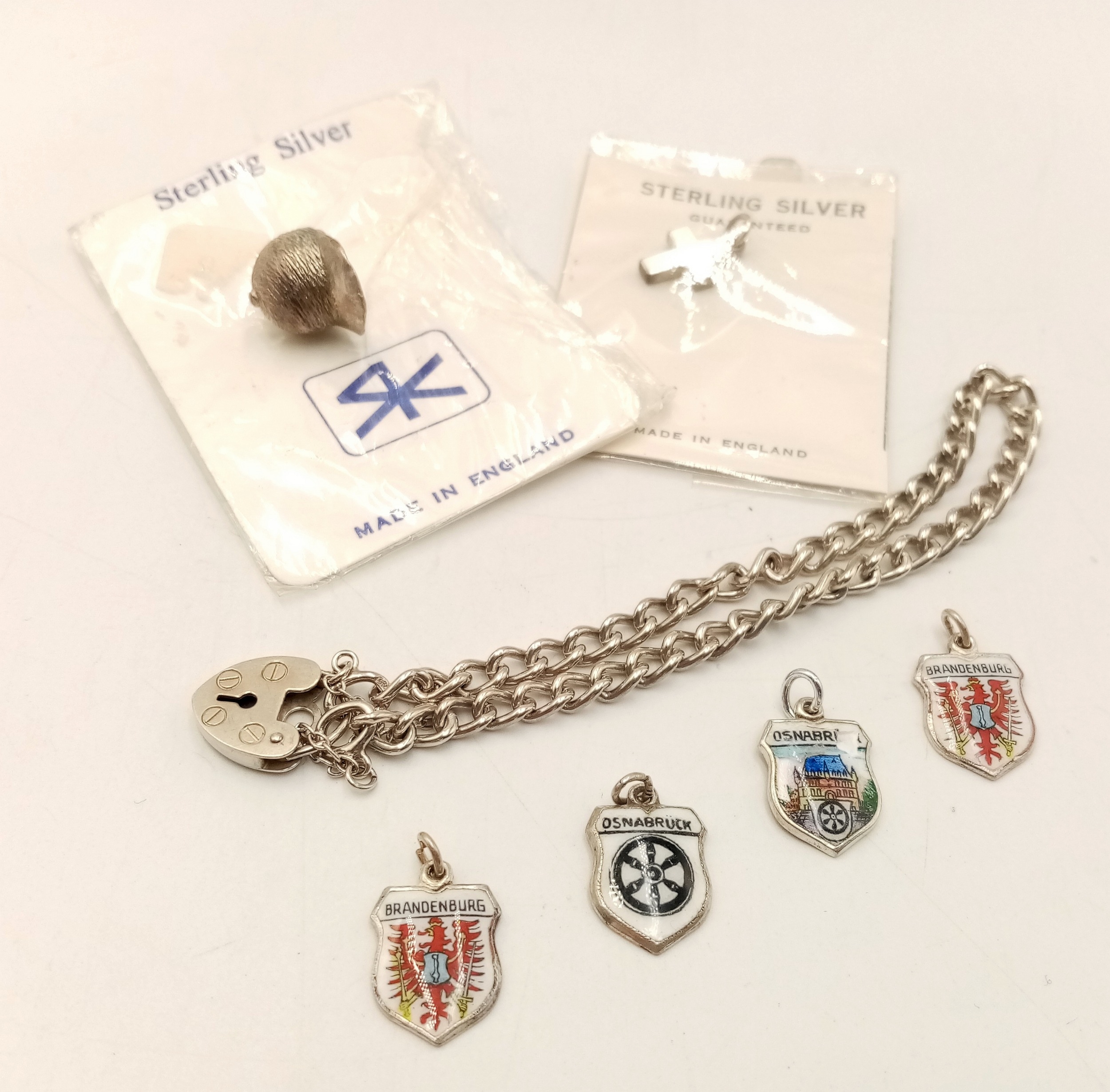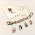 A Sterling Silver Padlock Bracelet for Charms including Six Sterling Silver and Silver Vintage Charms. Bracelet weight alone 8.4 Grams.