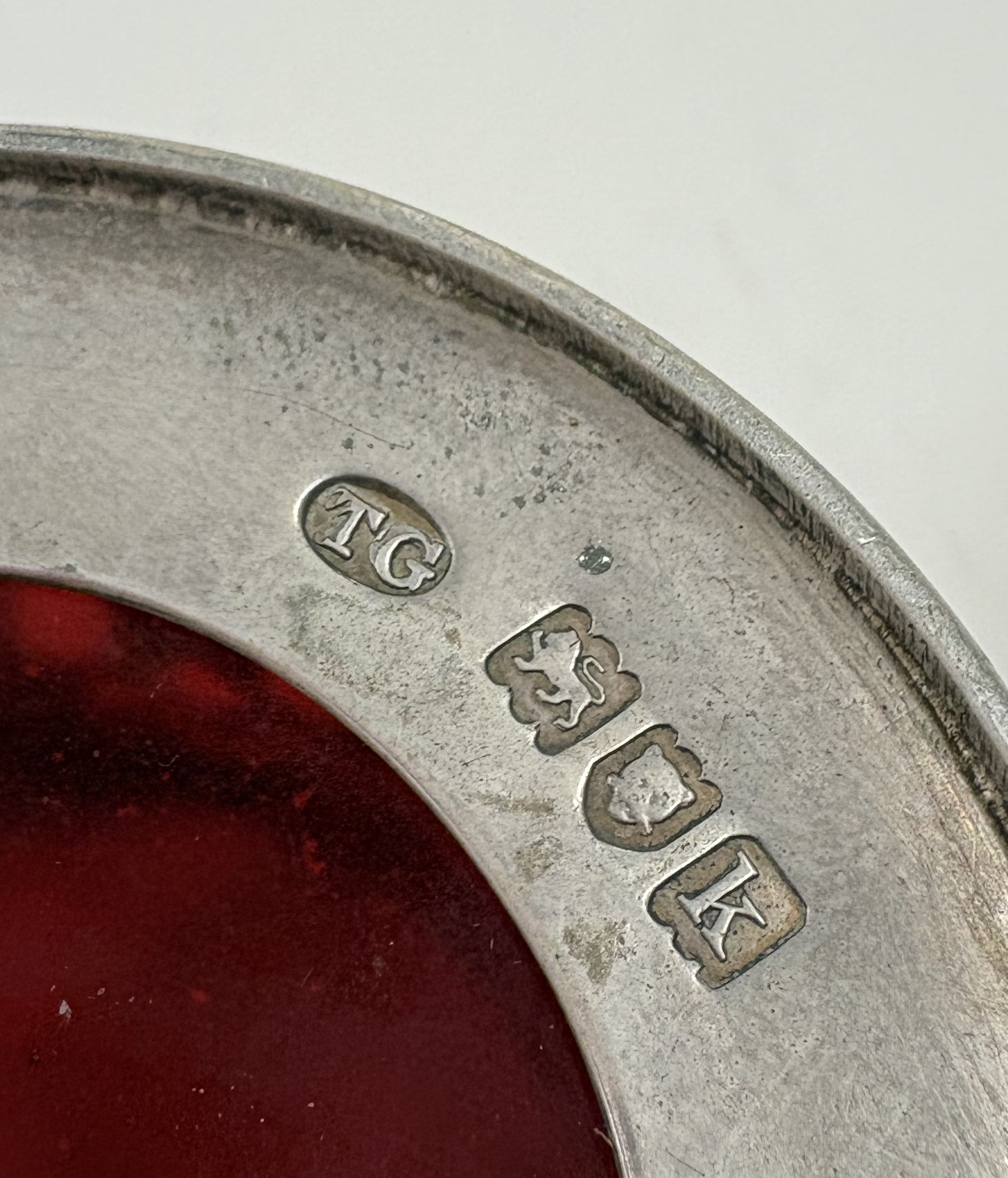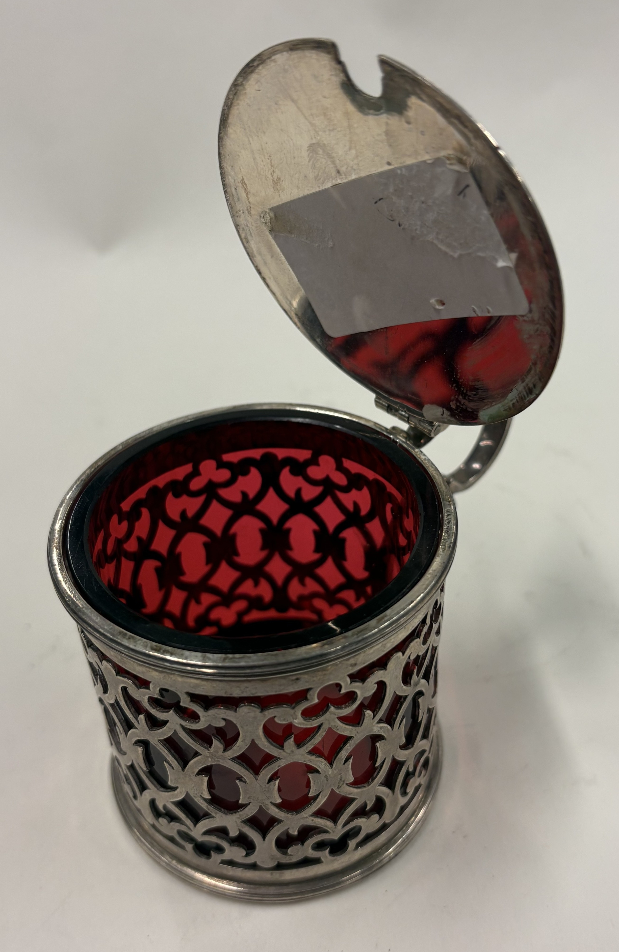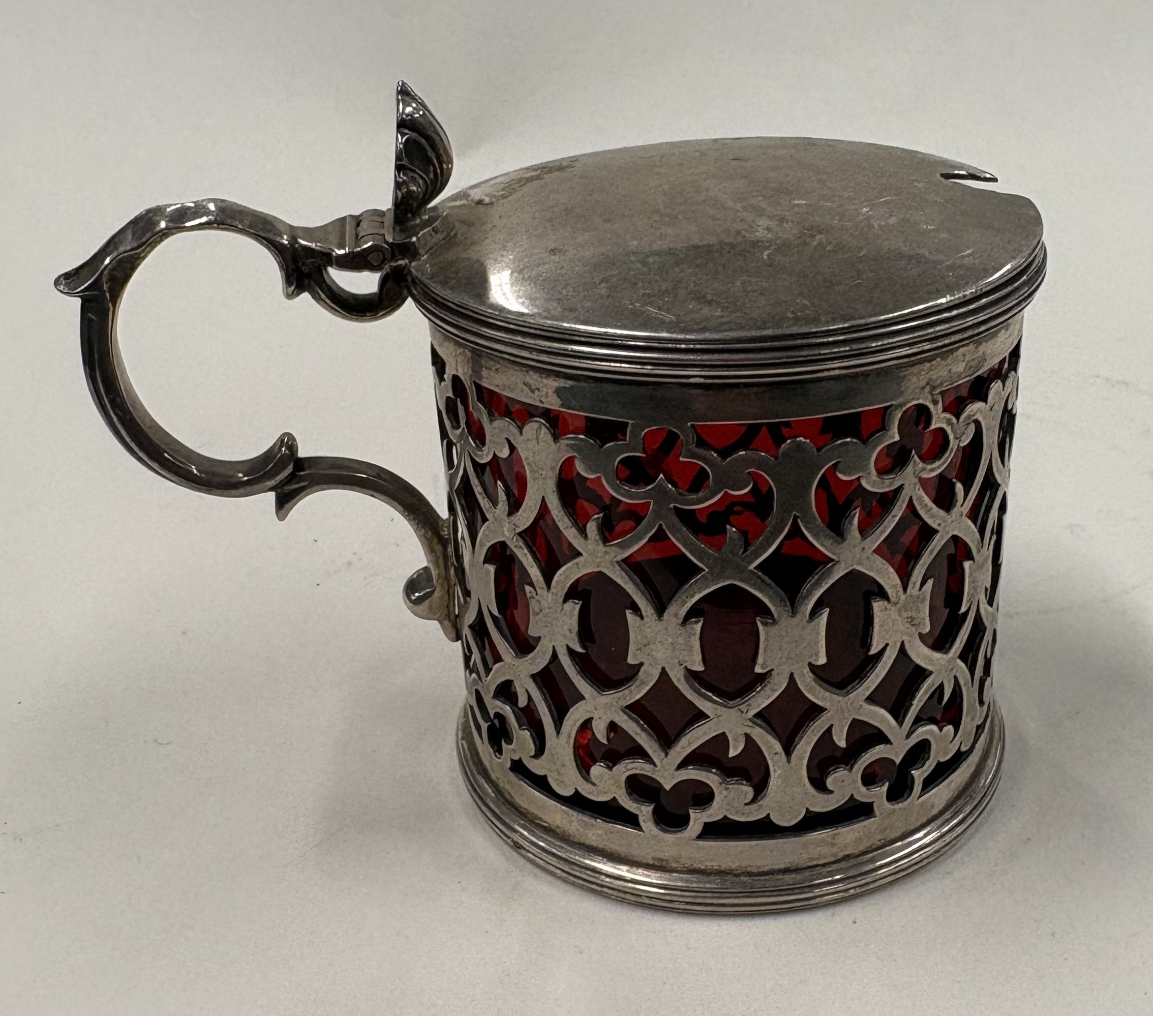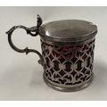 An attractive pierced silver mustard with ruby red glass liner. London. By TG. Approx. 134 grams. Est. £120 - £150.