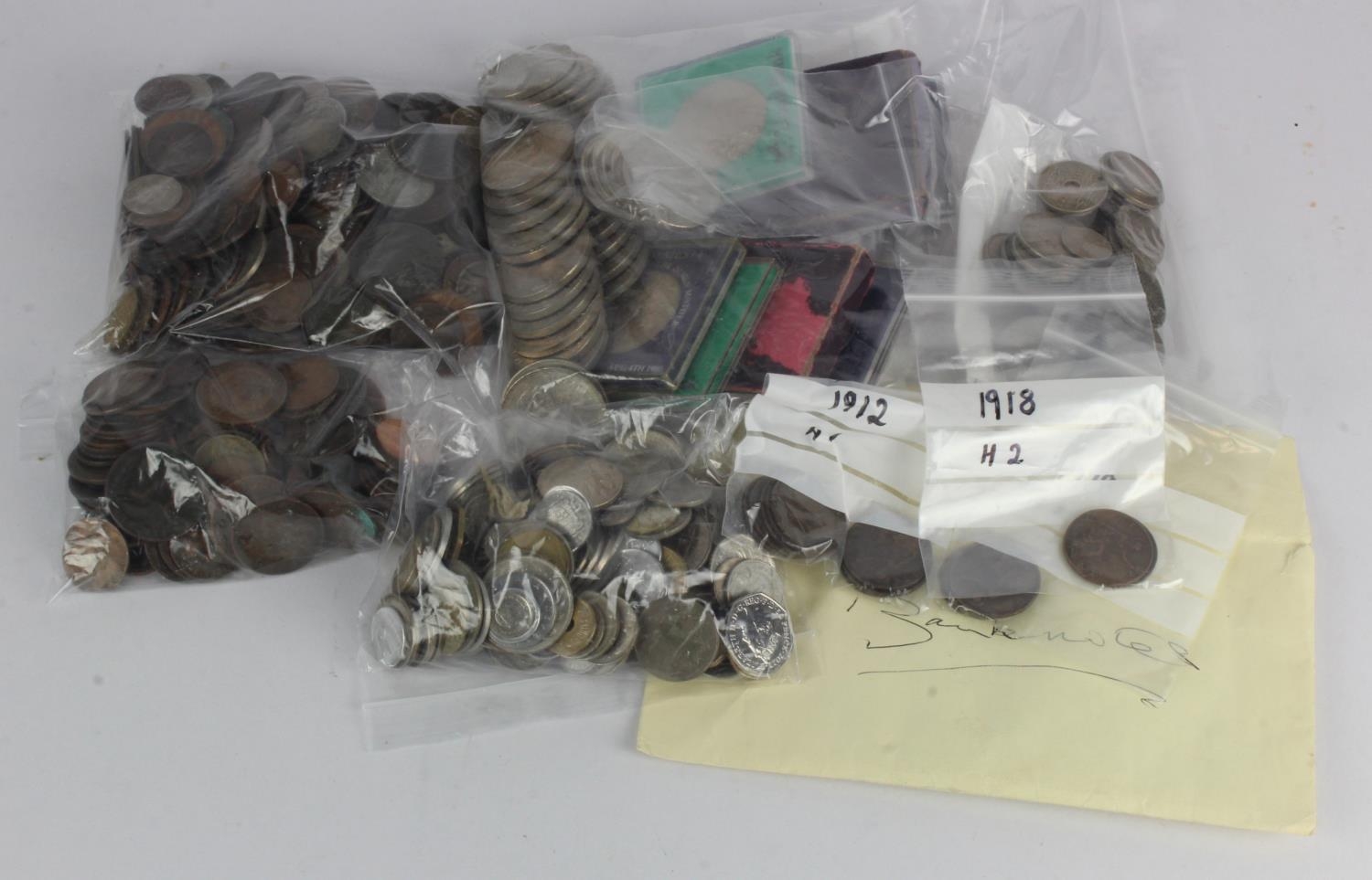 GB & World: Quantities of predecimal, Crowns, mixed world coins, tokens and medallions; 1912H, 18H & 19H Pennies from circulation, plus some banknotes including £16 face £1 notes mostly consecutive groups; also noted £30 face in £5 coins.