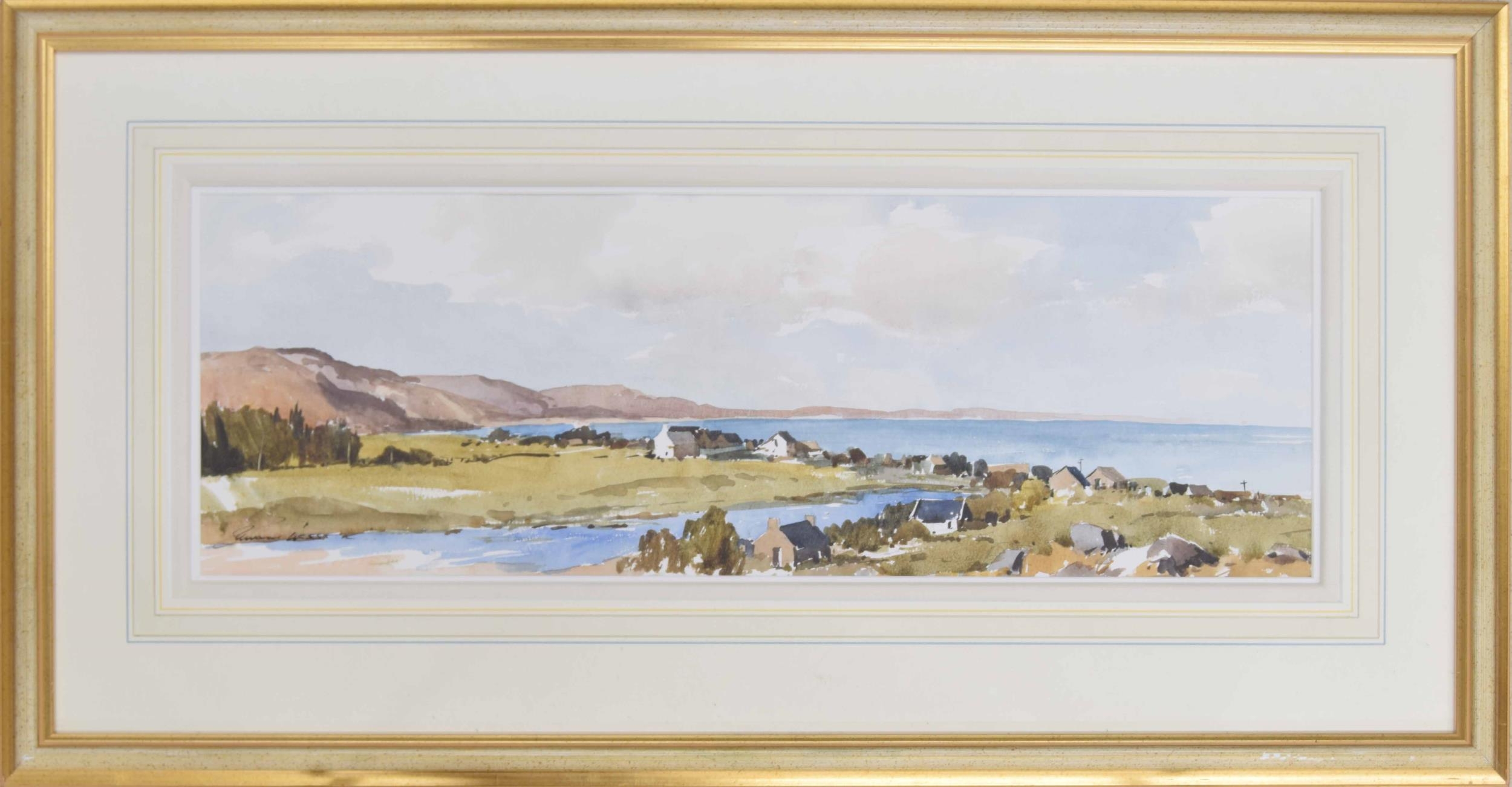 Edward Wesson RI., RSMA., RBA., RI., (1910-1983) - "Loch Ewe, Rosshire" signed also inscribed on a label together with a further pencil inscription on the backing board, pencil and watercolour, 9.25" x 27"