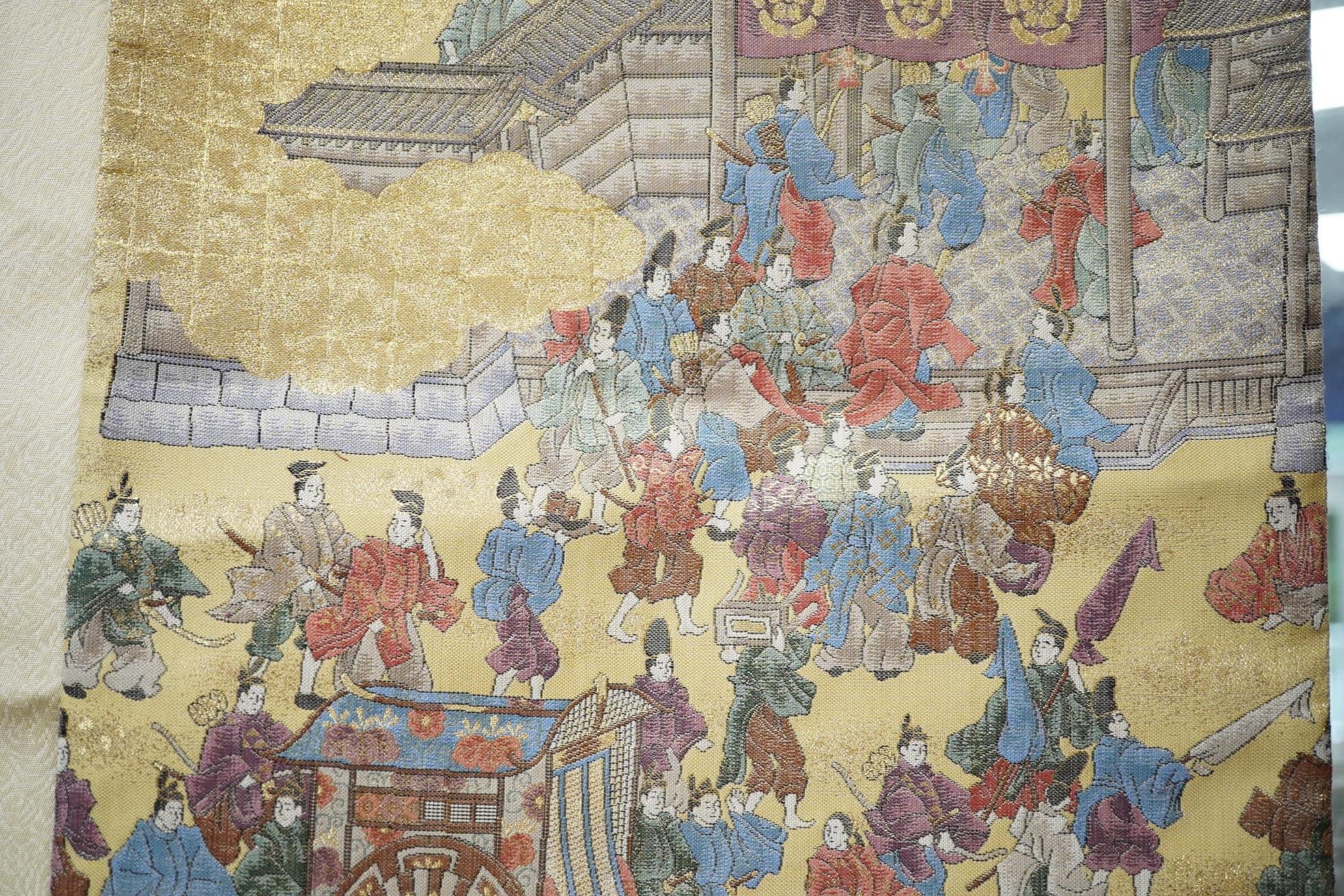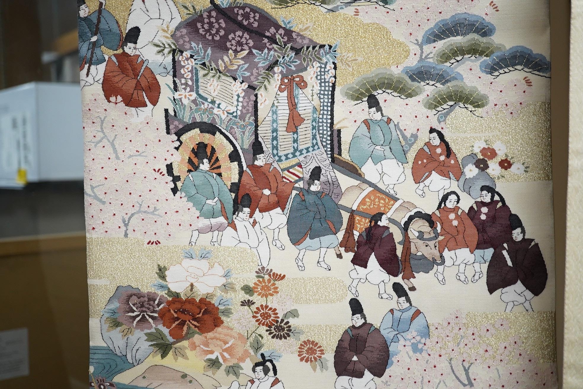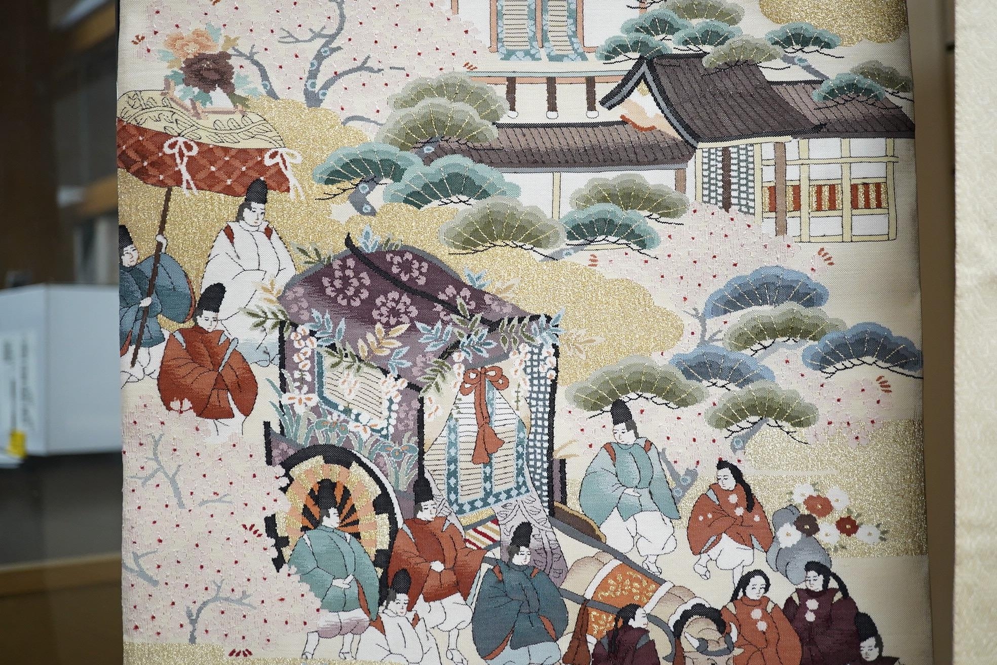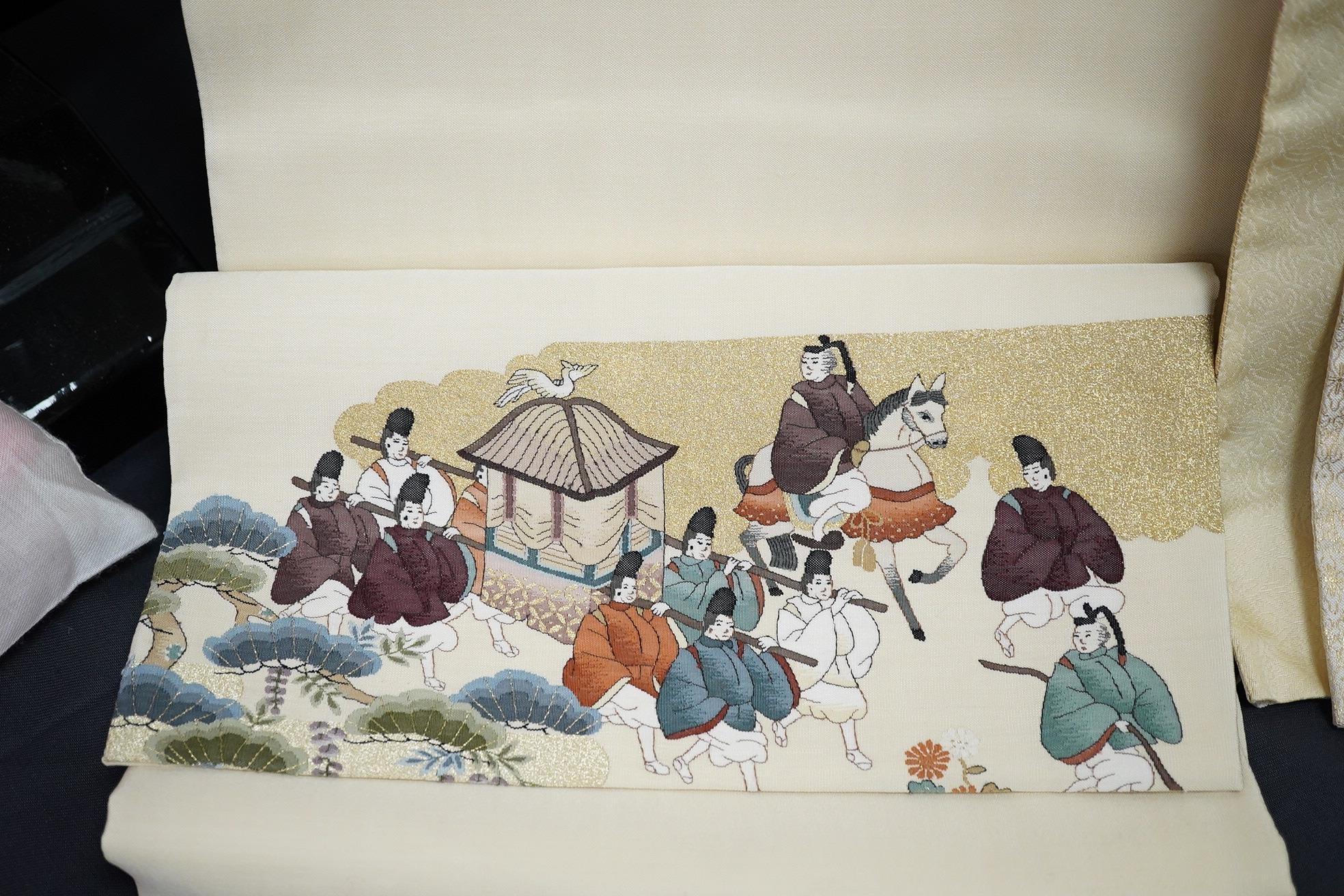 Two vintage silk brocade Obi, bought from Masae Shibamura in Tokyo with the Four Seasons wedding kimono, one woven in gold brocade, depicting in minute detail a large celebratory procession, in two panels, the remaining fabric in a small gold brocade pattern with calligraphic inscription and seal mark at one end, the other woven in Oyster silk with specific scenes of woven in brocade of a celebratory procession, the imagery larger, each illustrated and woven as a cartouche, both traditional Japanese marriage processions, Oyster colour Obi 460cm long x 31cm wide, gold brocade Obi 480cm long x 31cm wide. Condition - both look as if they have never been used, both Obis come with a black stand each and one in a box.