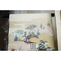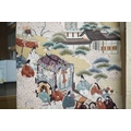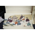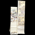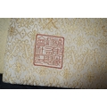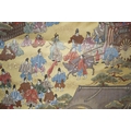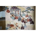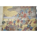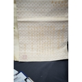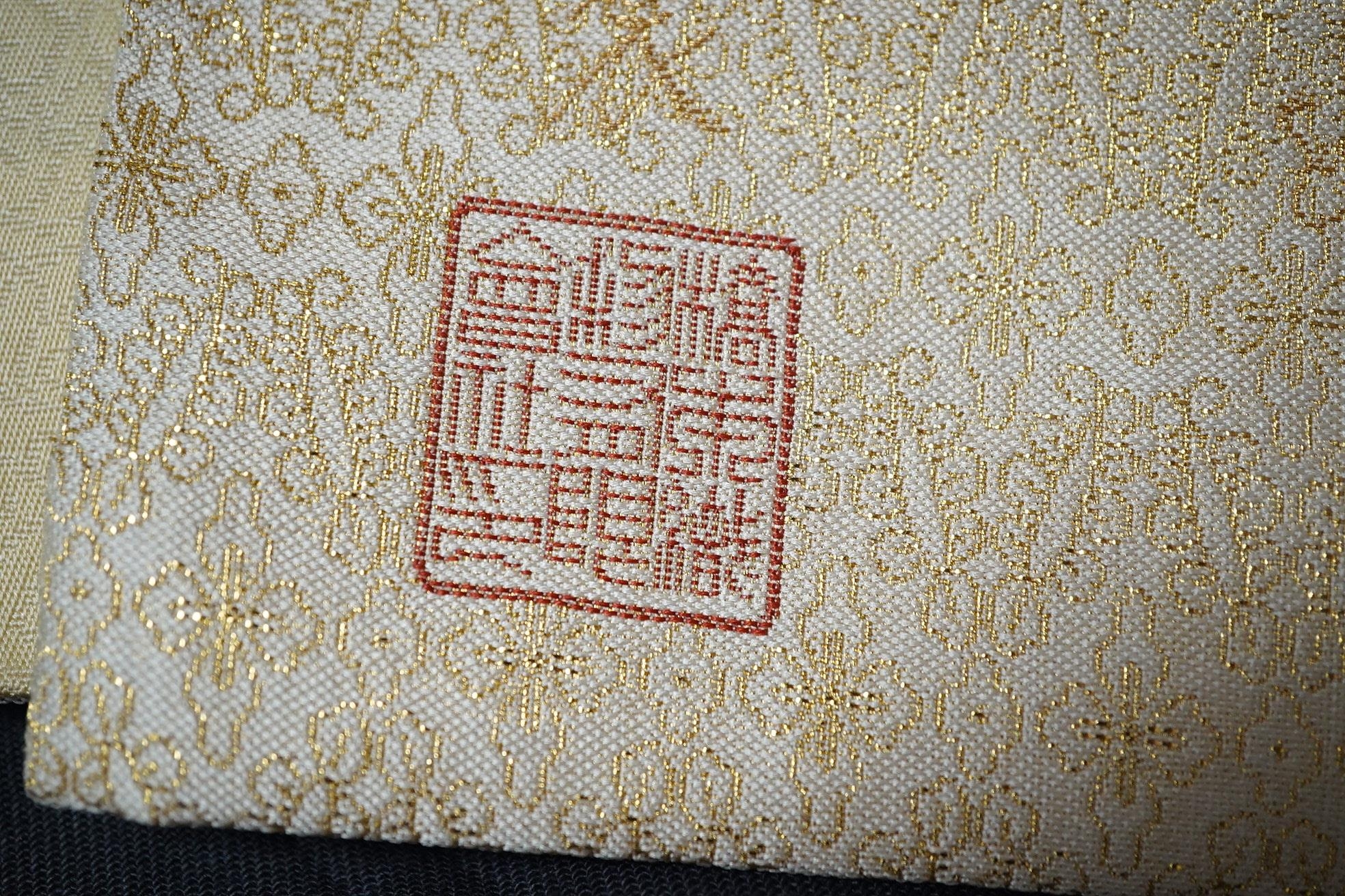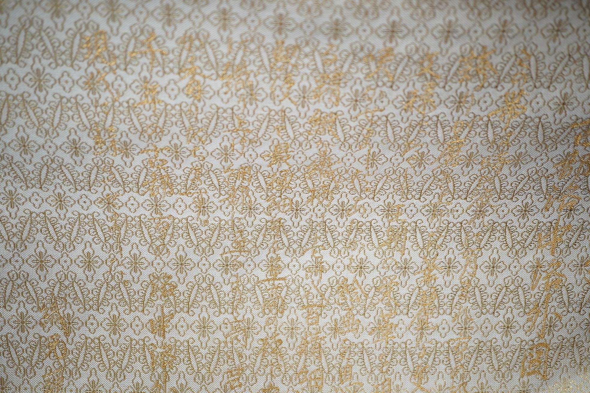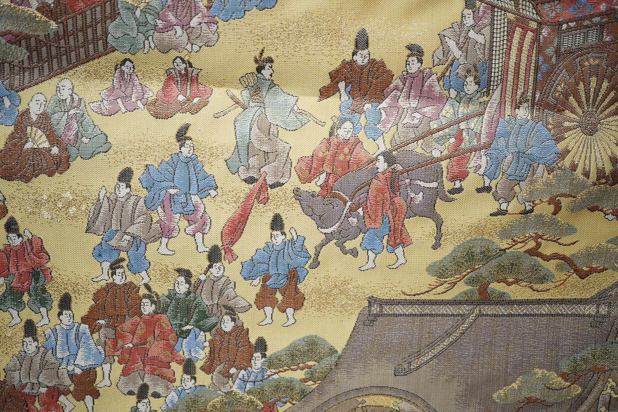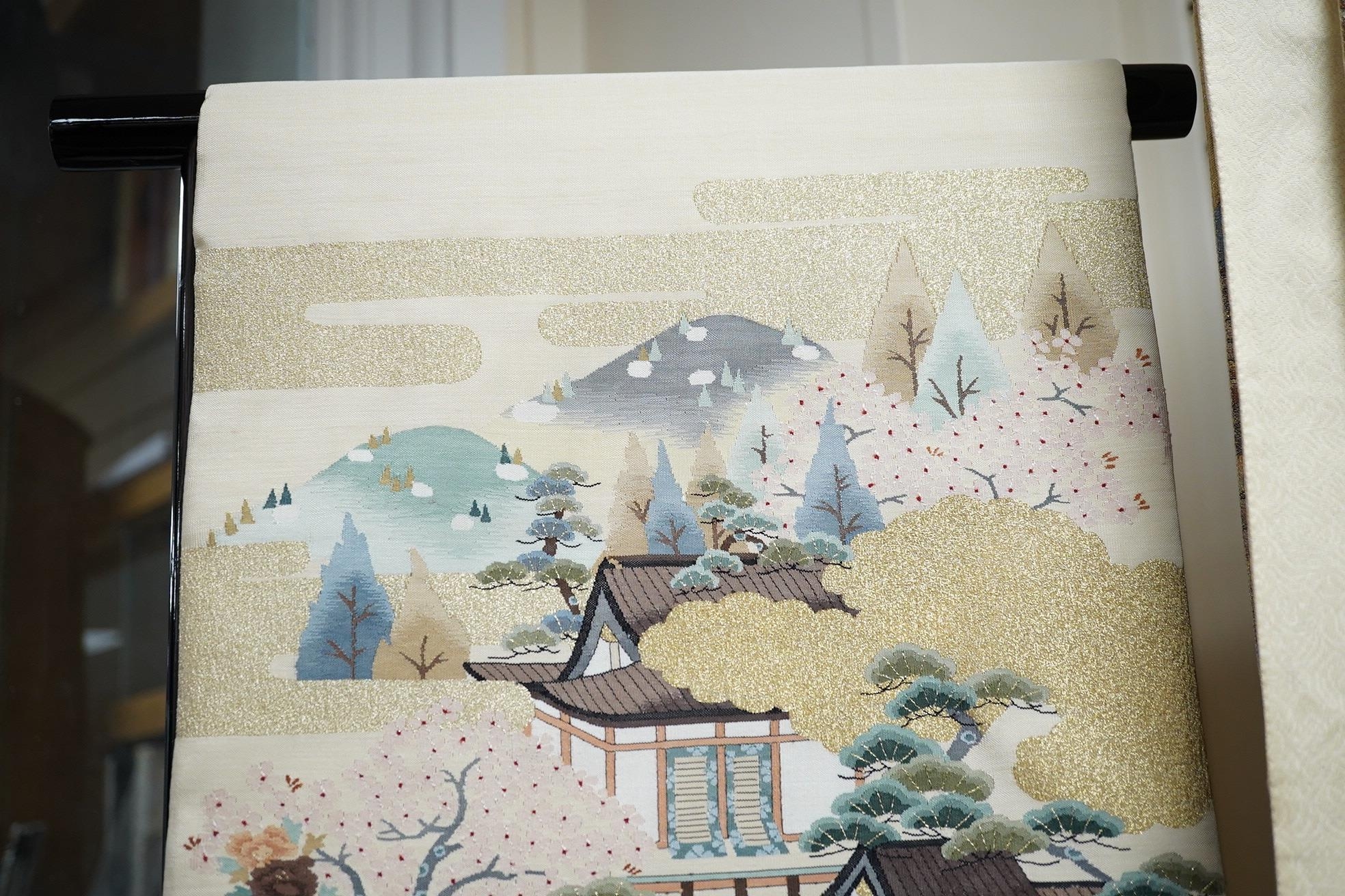 Two vintage silk brocade Obi, bought from Masae Shibamura in Tokyo with the Four Seasons wedding kimono, one woven in gold brocade, depicting in minute detail a large celebratory procession, in two panels, the remaining fabric in a small gold brocade pattern with calligraphic inscription and seal mark at one end, the other woven in Oyster silk with specific scenes of woven in brocade of a celebratory procession, the imagery larger, each illustrated and woven as a cartouche, both traditional Japanese marriage processions, Oyster colour Obi 460cm long x 31cm wide, gold brocade Obi 480cm long x 31cm wide. Condition - both look as if they have never been used, both Obis come with a black stand each and one in a box.