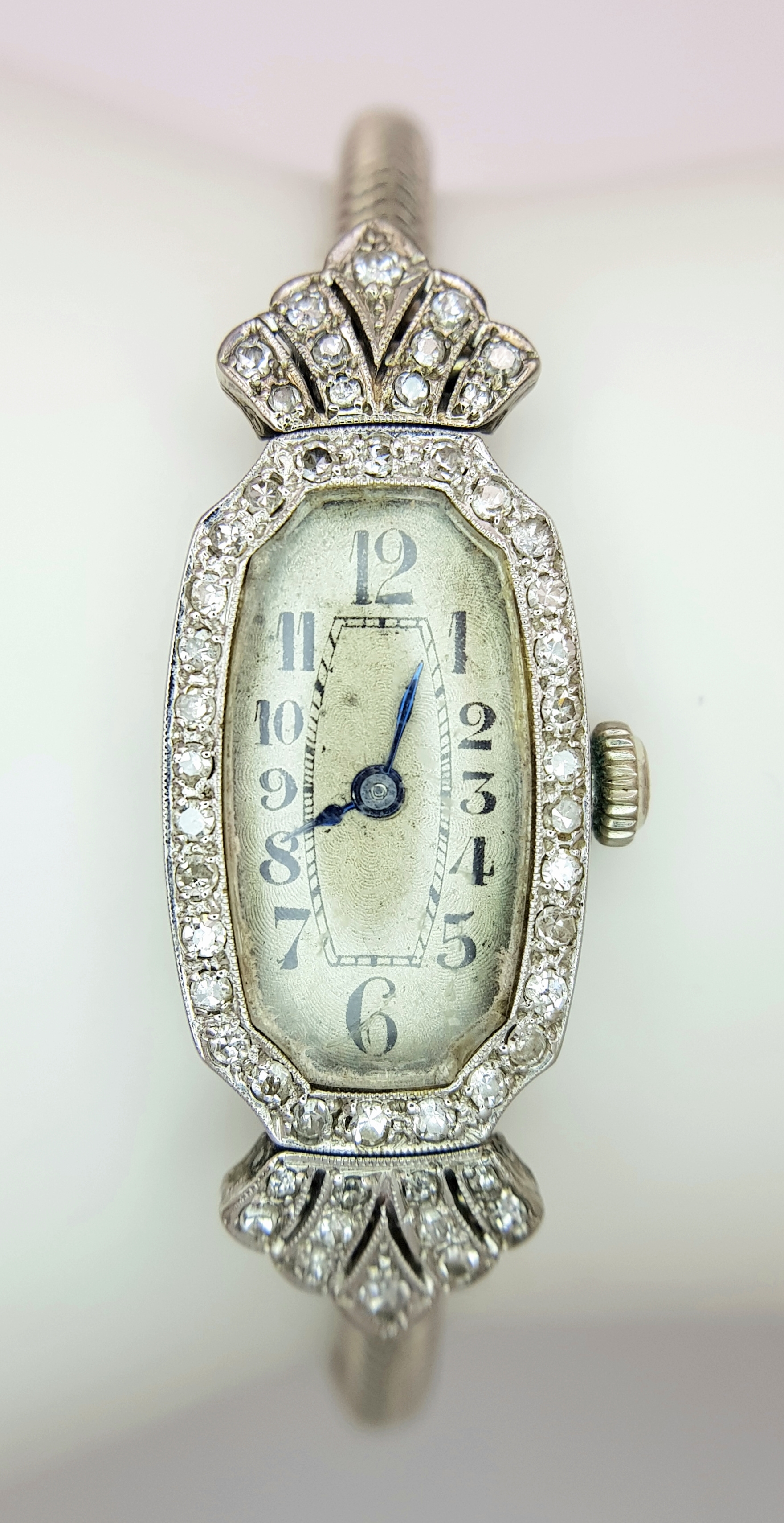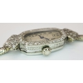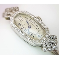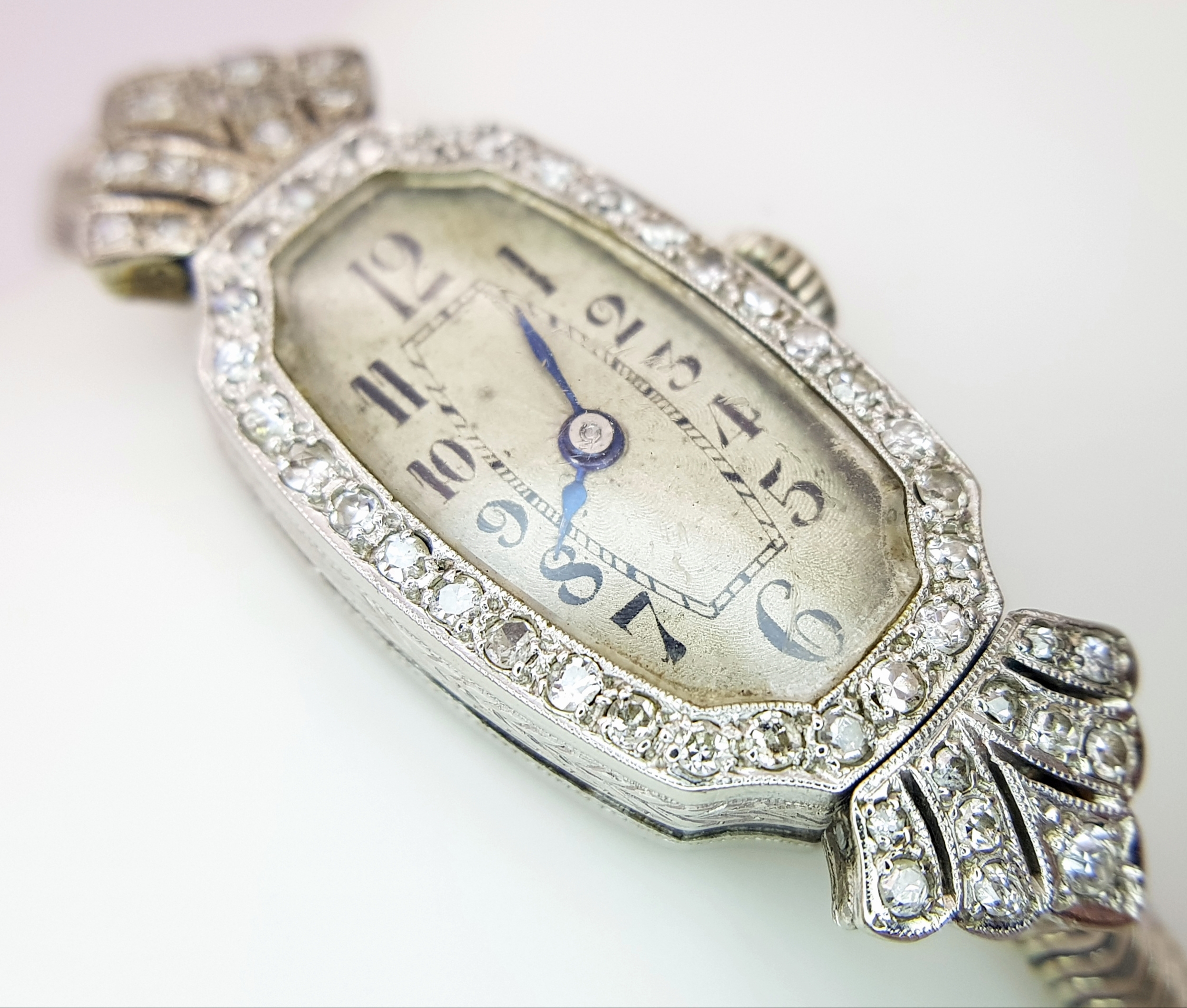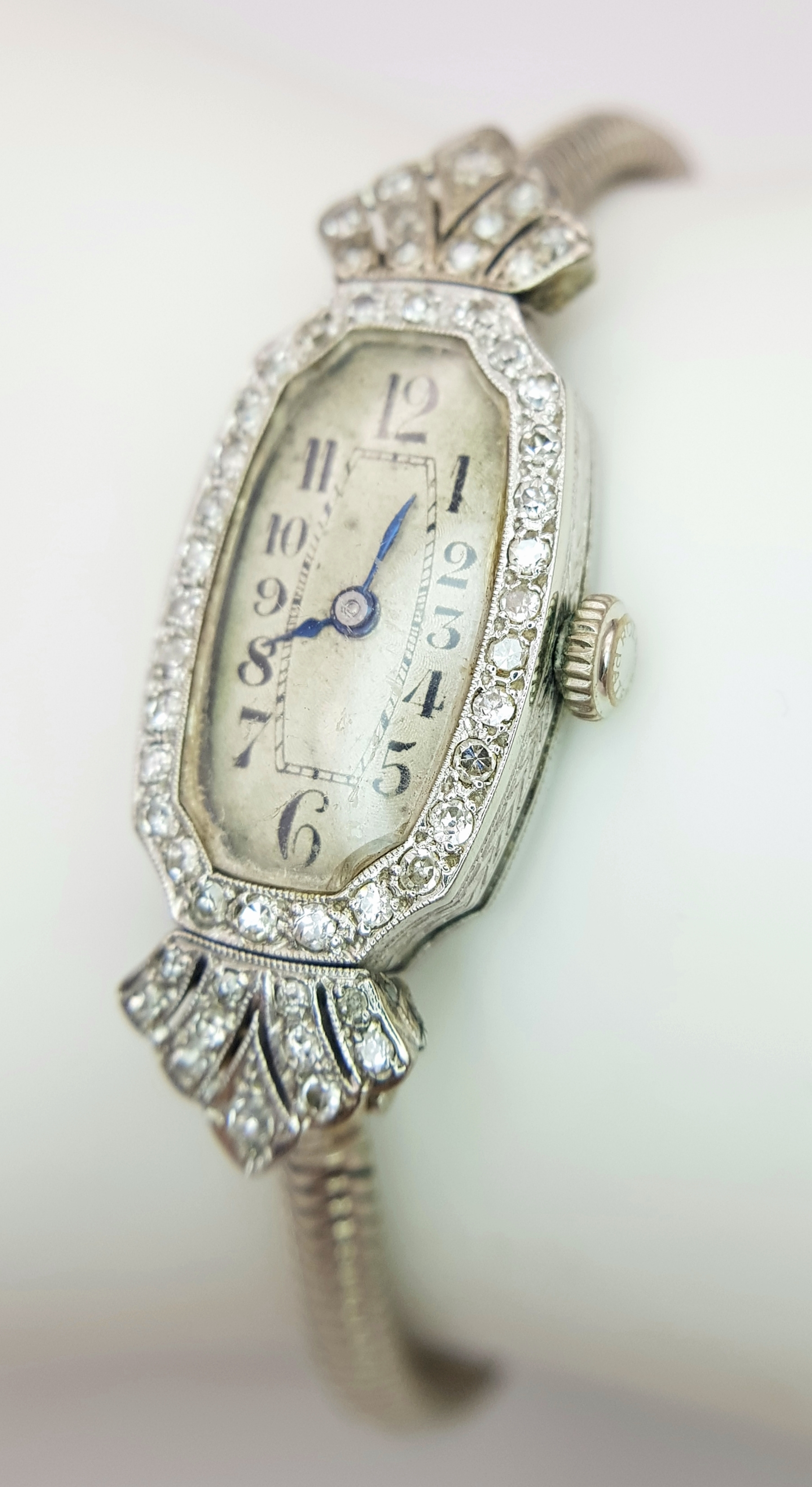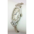 A Vintage, Possibly Art Deco 9K White Gold and Diamond Ladies watch. 9k gold bracelet and elongated case - 16mm width. Old cut diamond bezel and lug shields. Mechanical, hand-wind movement. Works but because of age no guarantees. 18.76g total weight.