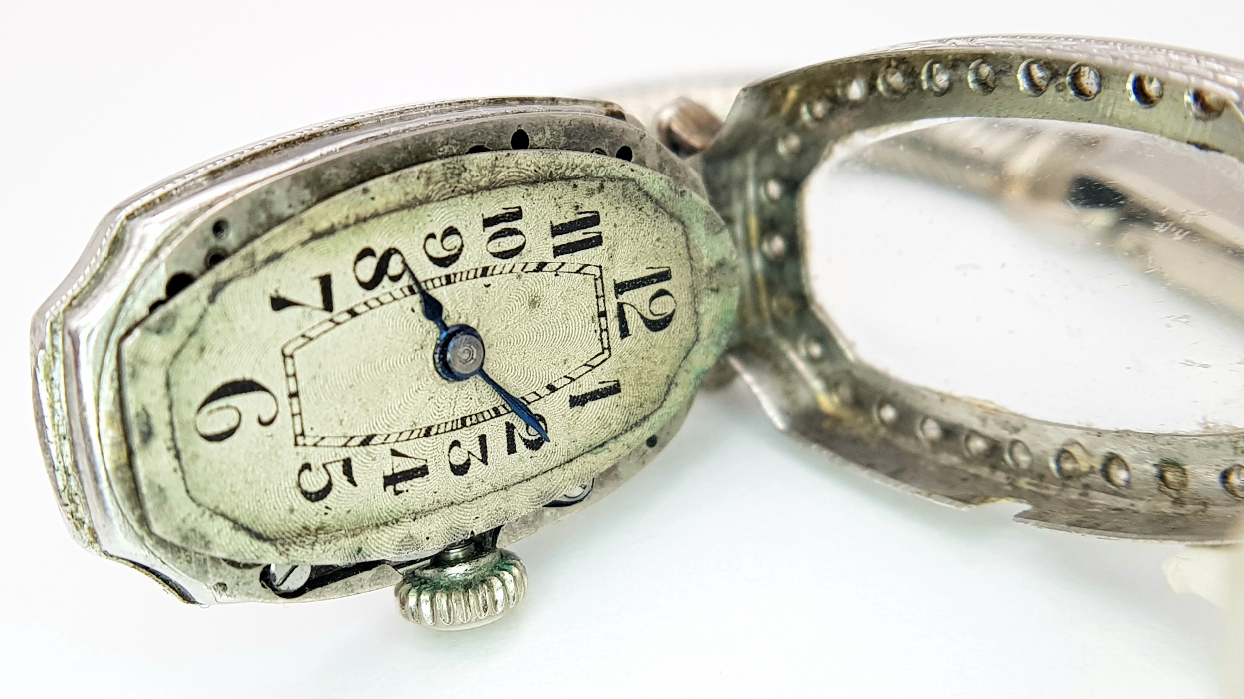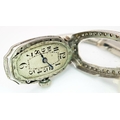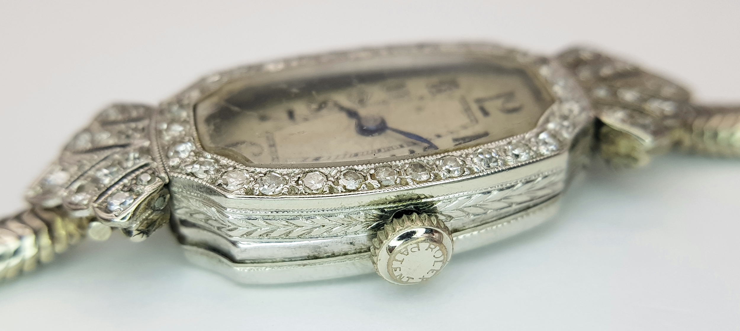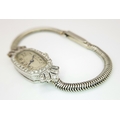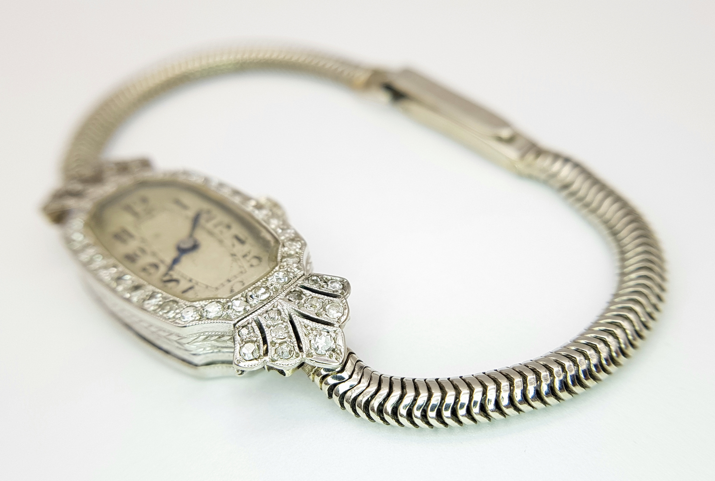 A Vintage, Possibly Art Deco 9K White Gold and Diamond Ladies watch. 9k gold bracelet and elongated case - 16mm width. Old cut diamond bezel and lug shields. Mechanical, hand-wind movement. Works but because of age no guarantees. 18.76g total weight.