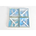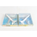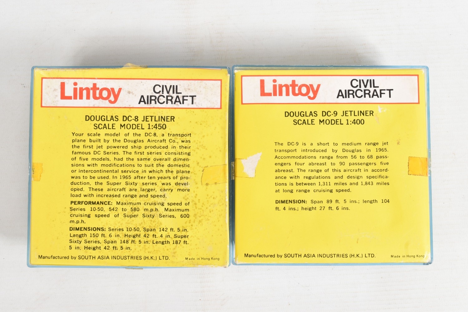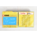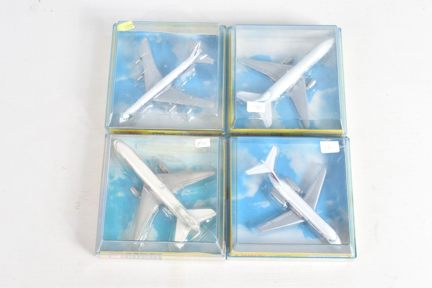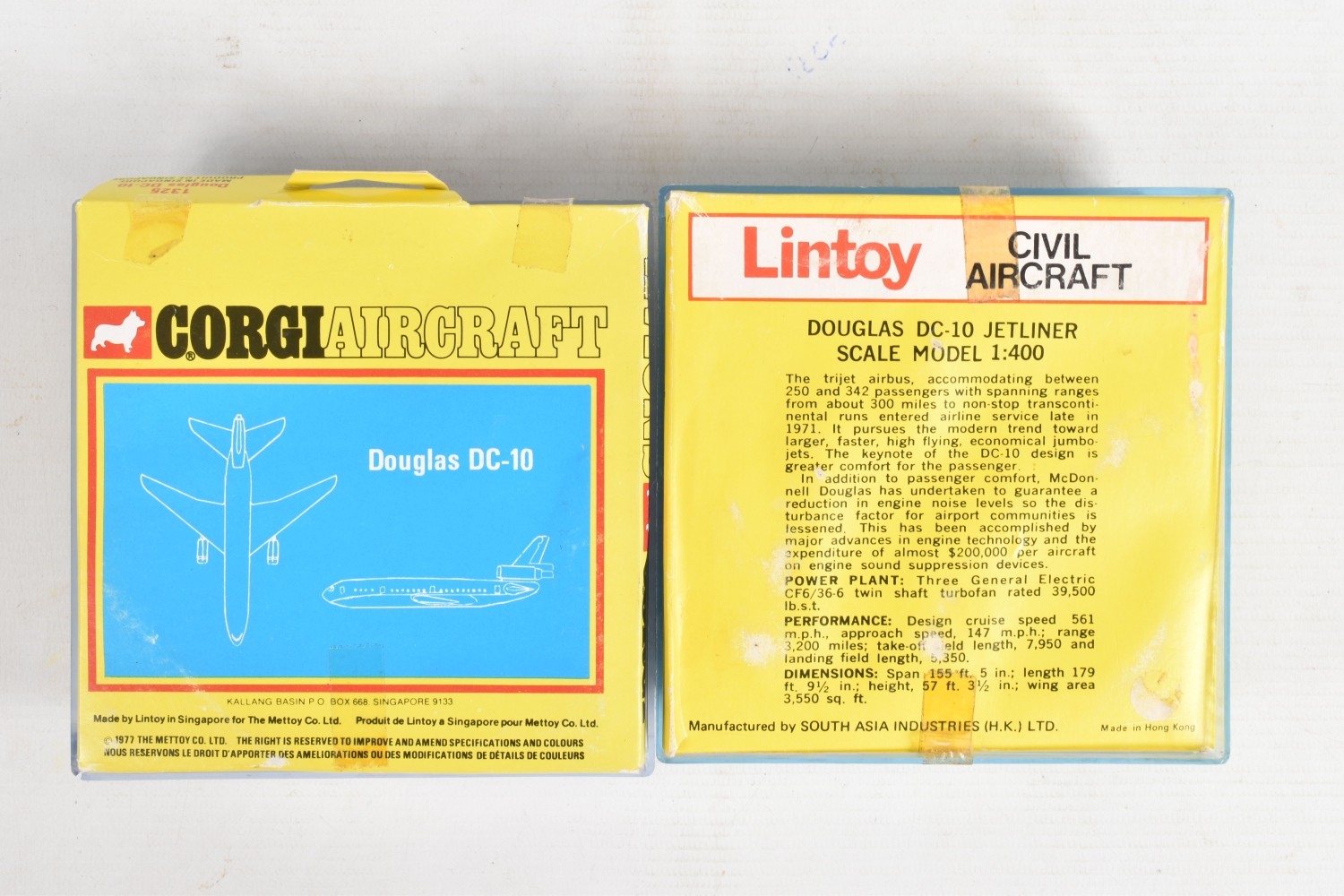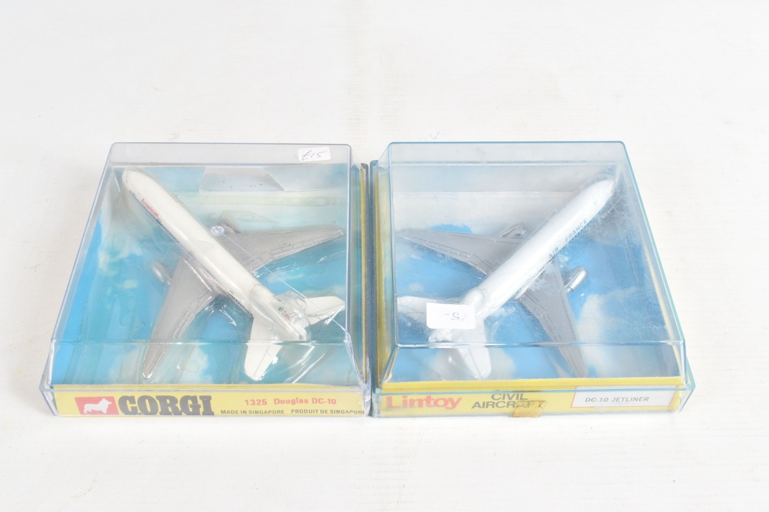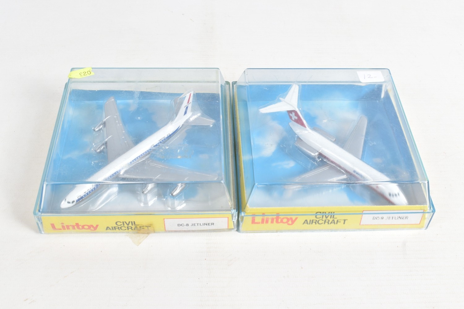 FOUR BOXED MODEL AIRCRAFTS, to include a 1977 Corgi Avions 1325 Douglas DC-10 American Airlines plane, and three Lintoy Civil Aircrafts such as a United DC-8 Jetliner, 1:450 scale, a Swissair Douglas DC-9 Jetliner, 1:400 scale, and an Air France Douglas DC-10 Jetliner, 1:400 scale, all in their own plastic housing on card bases, some cracks to boxes and stickers to top
