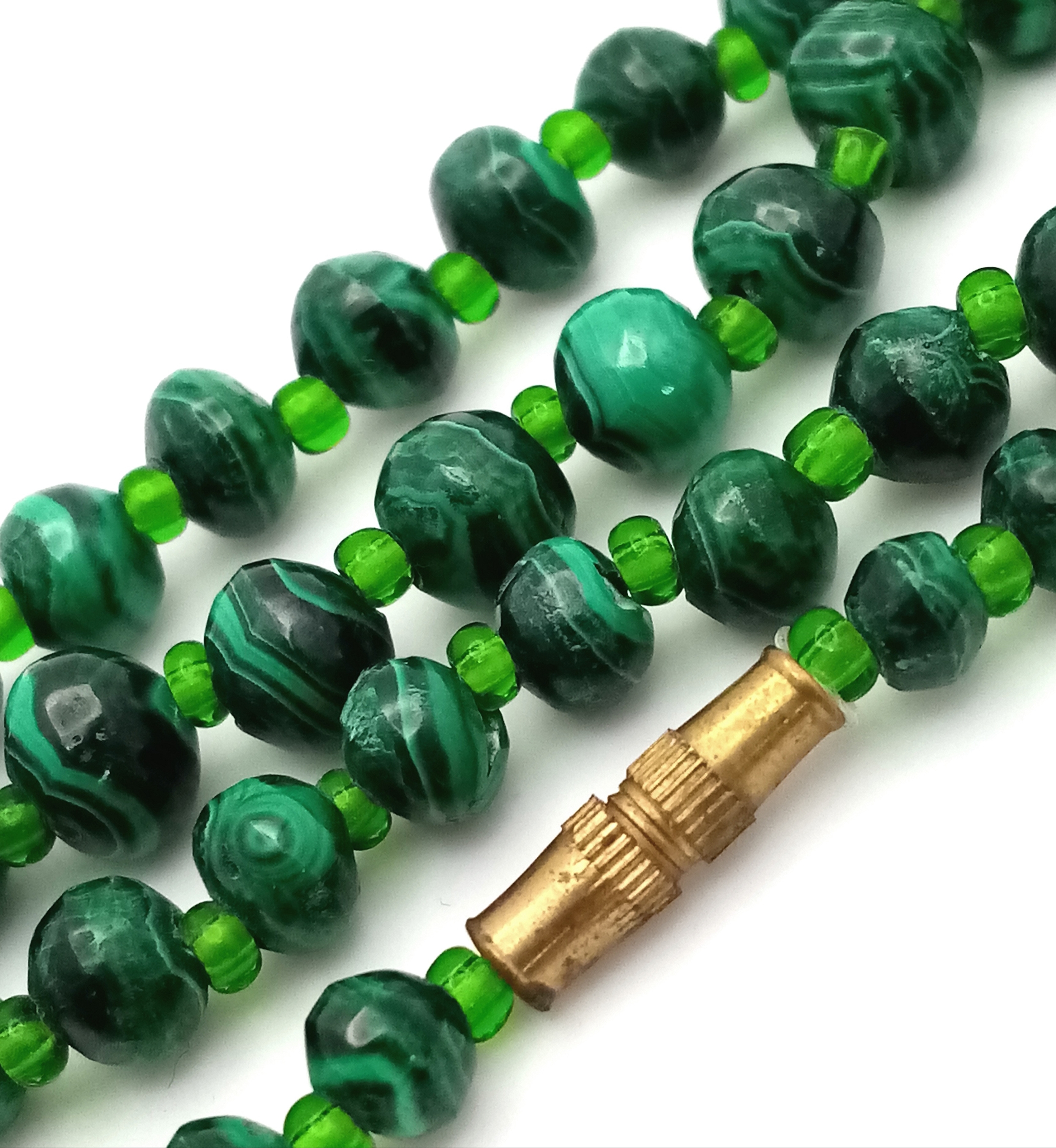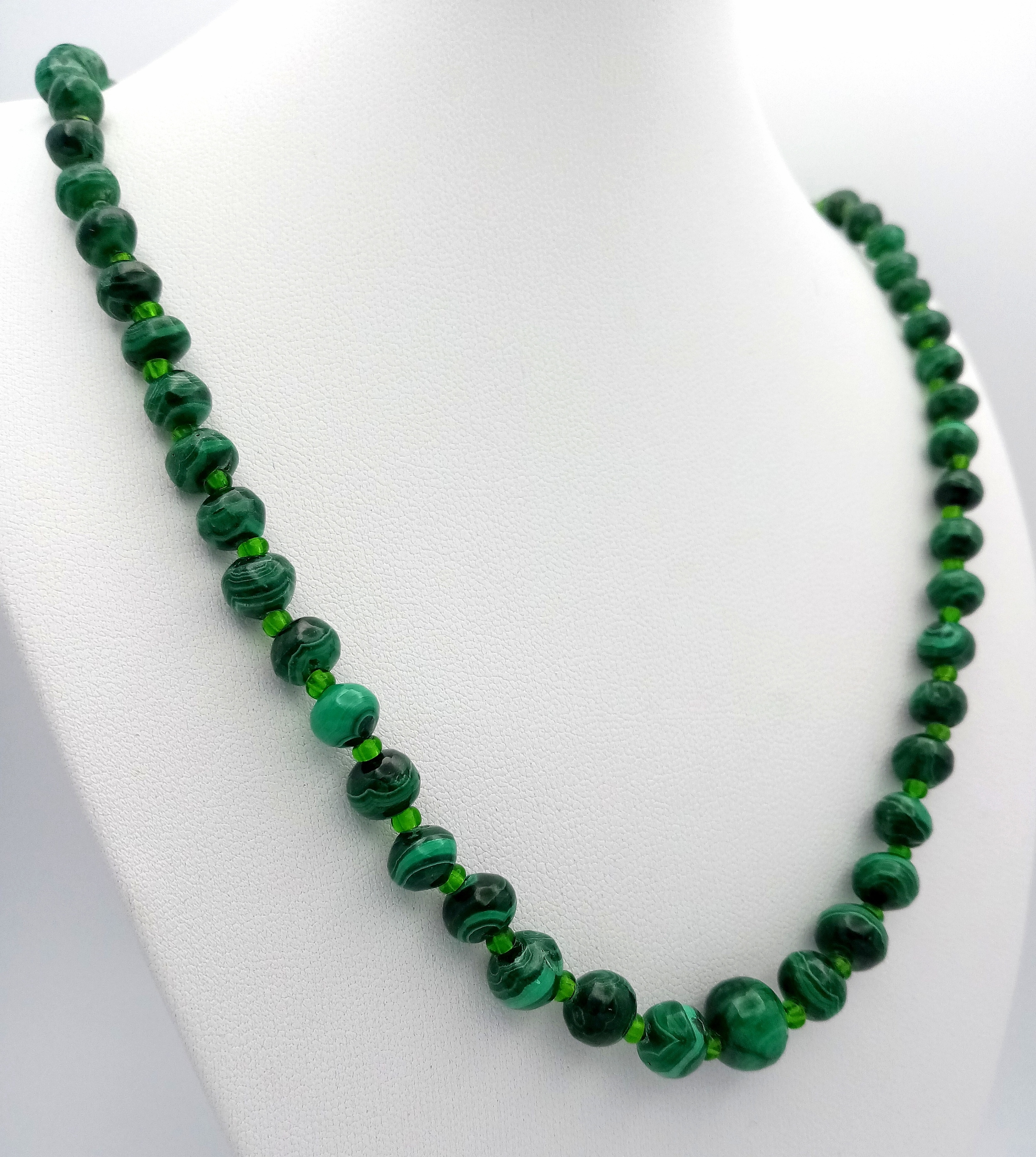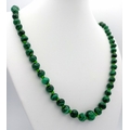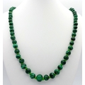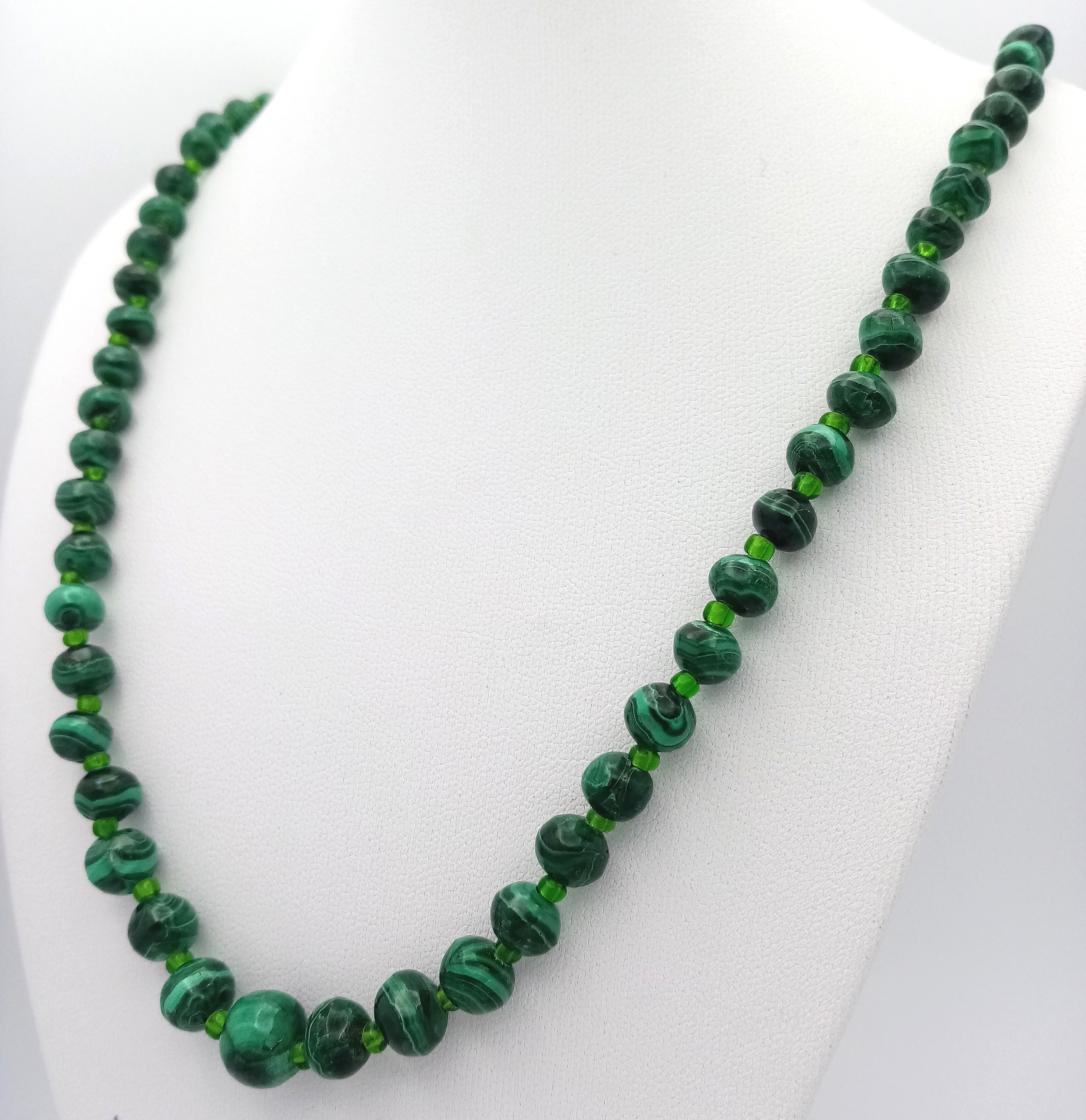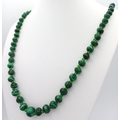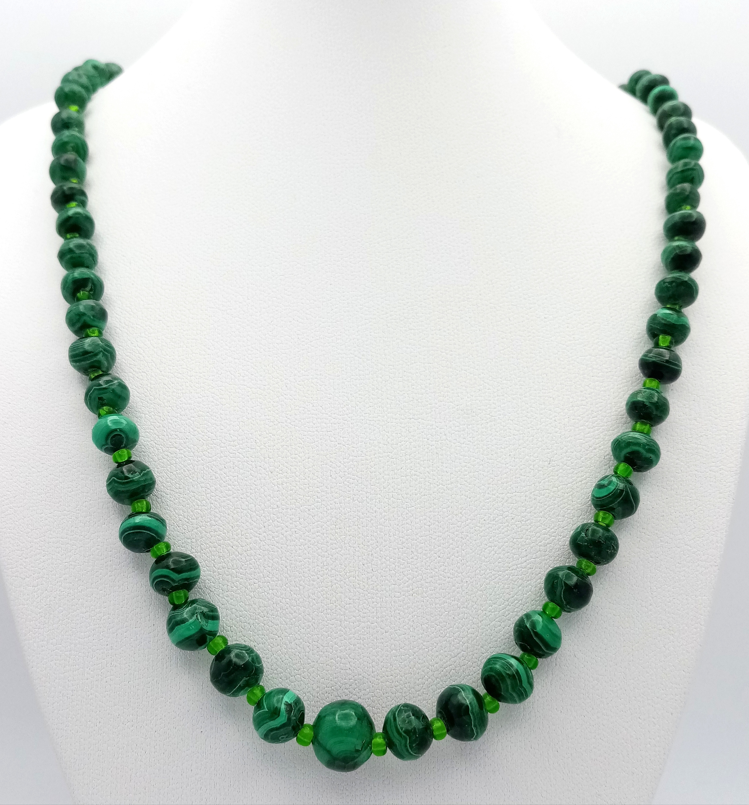 A lovely Green Malachite Beaded Necklace. Comprising graduated round malachite beads with characteristic light and dark green banding, secured with a screw barrel clasp. Approx. 46cm in length.