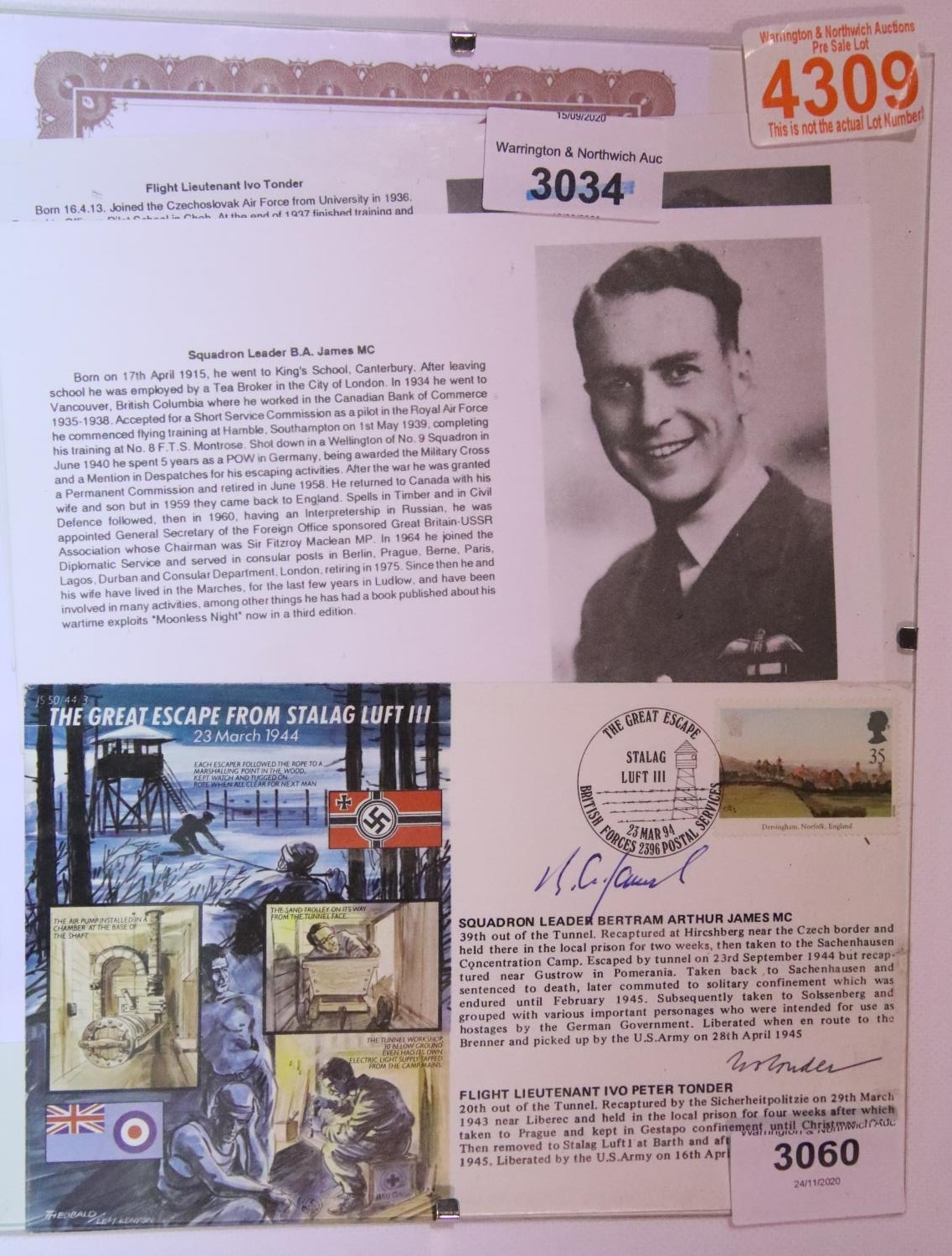 Stalag Luft III escapees' signatures of Squadron Leader Bertram Arthur James MC and Flight Lieutenant IVO Peter Tonder on a FDC, with COA from Chaucer Auctions. Posted without frame. P&P Group 1 (£14+VAT for the first lot and £1+VAT for subsequent lots)