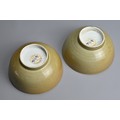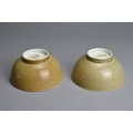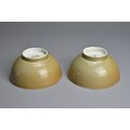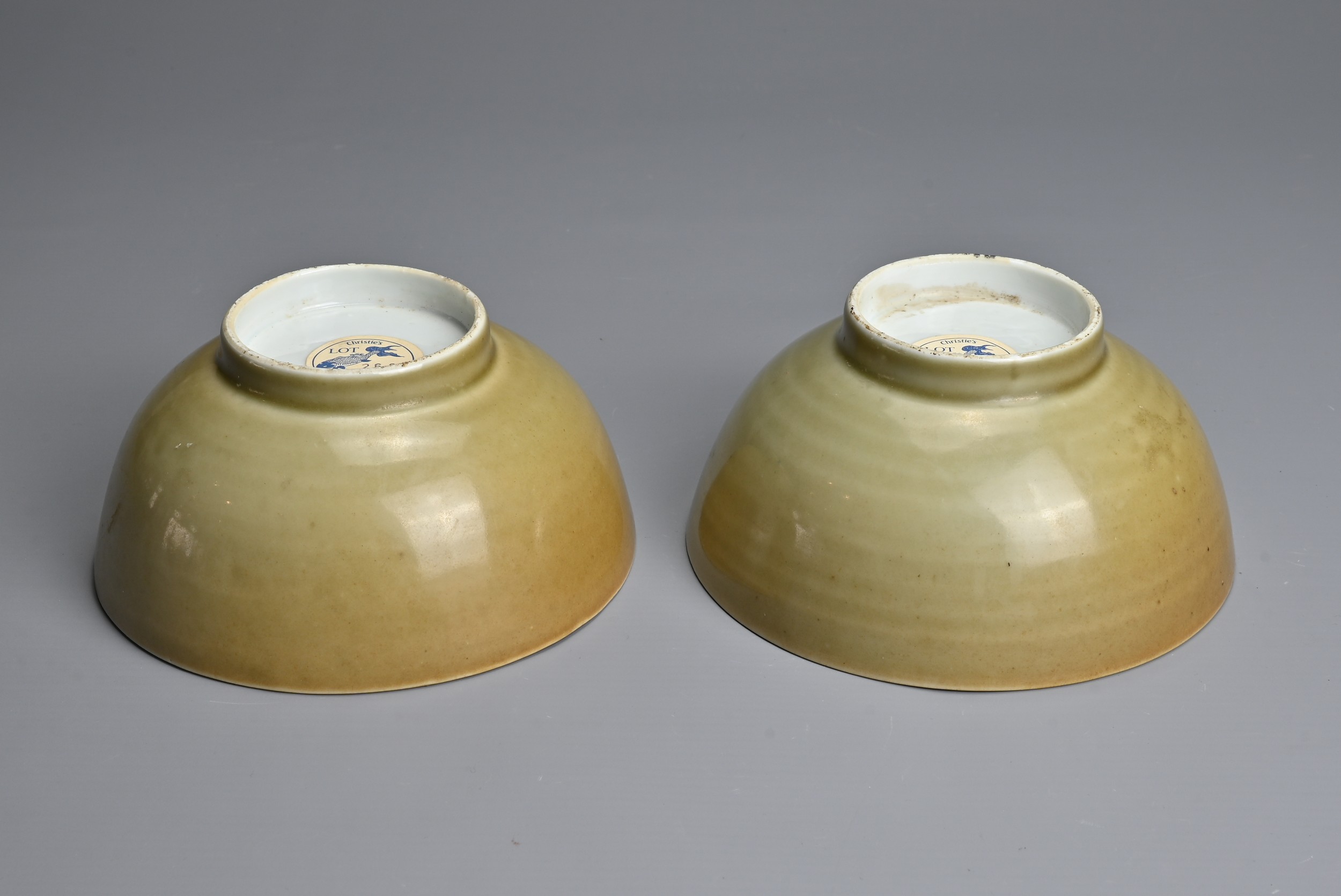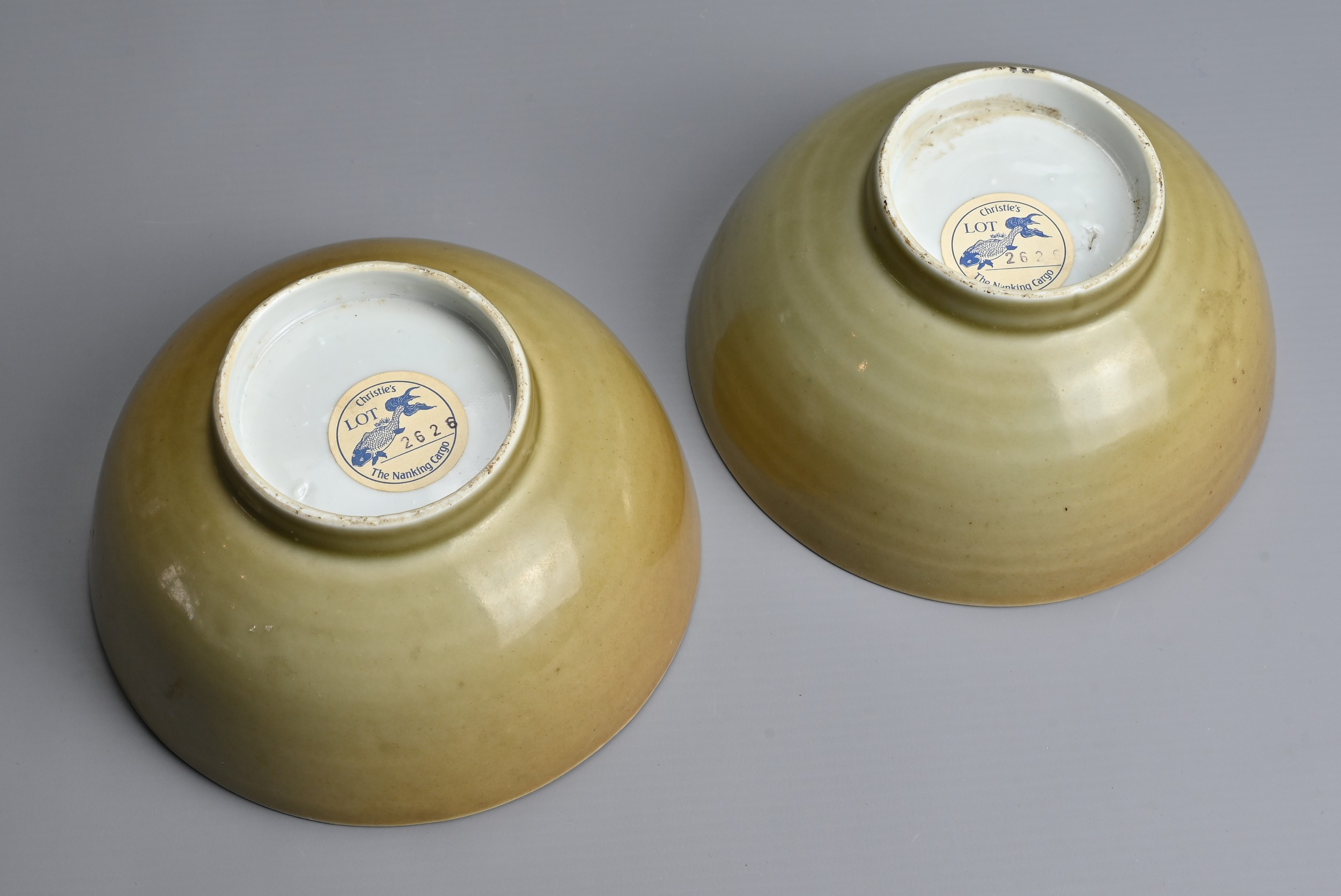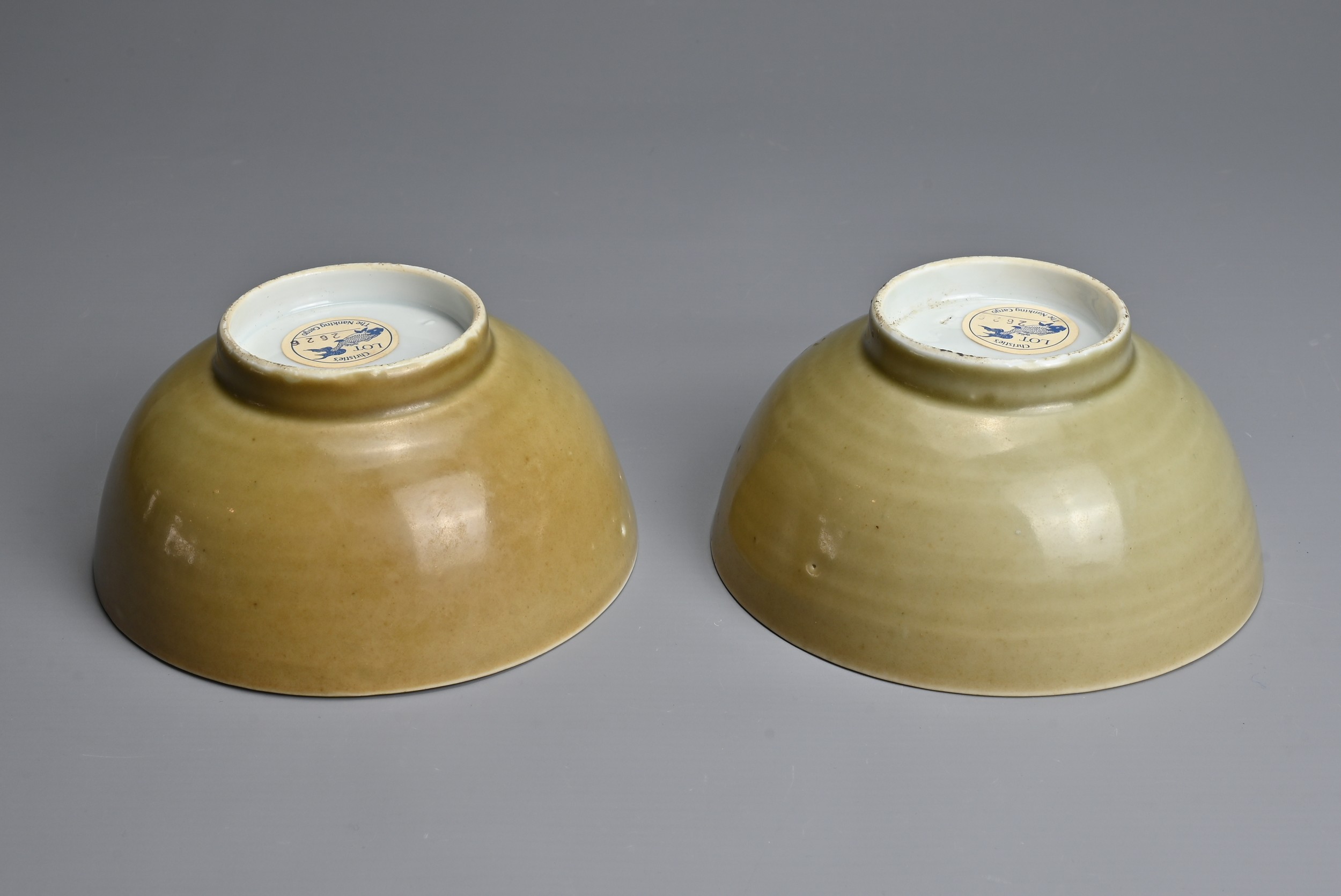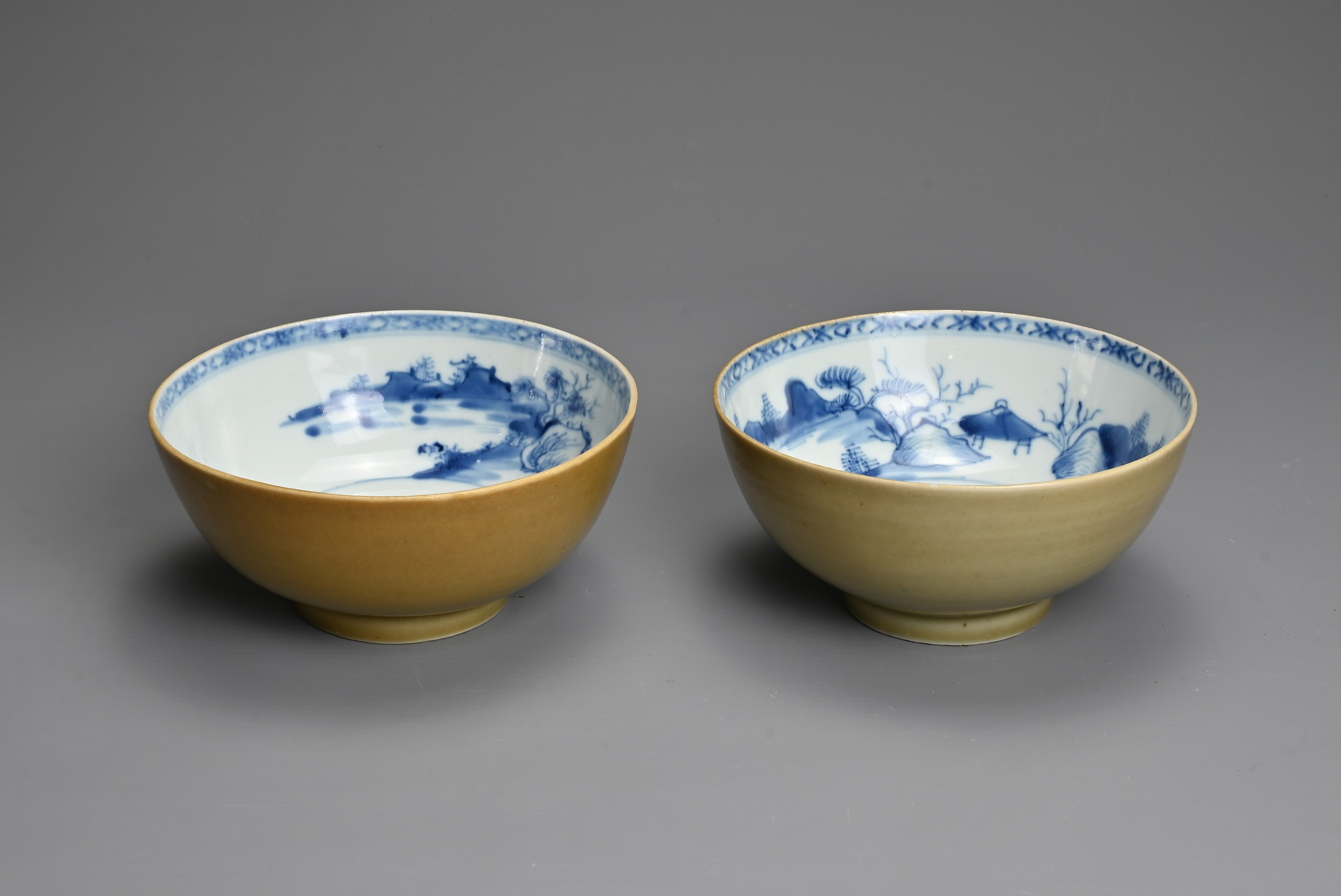 A PAIR OF CHINESE NANKING CARGO PORCELAIN BOWLS, 18TH CENTURY. Each cafe au lait ground exteriors with blue and white interiors depicting landscape scenes. Each with Christie's Lot 2626 Nanking Cargo stickers to base. 15cm diam. (2)