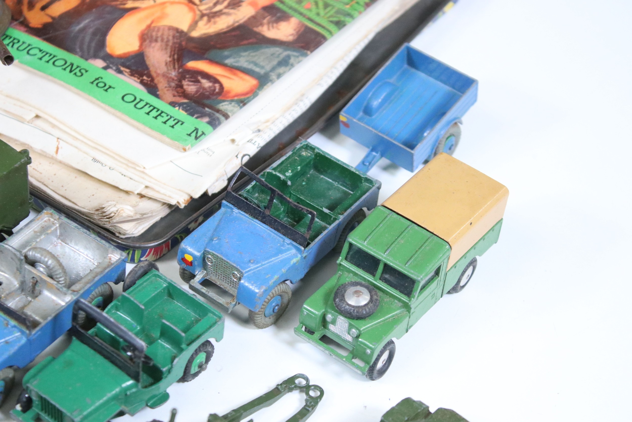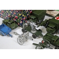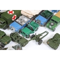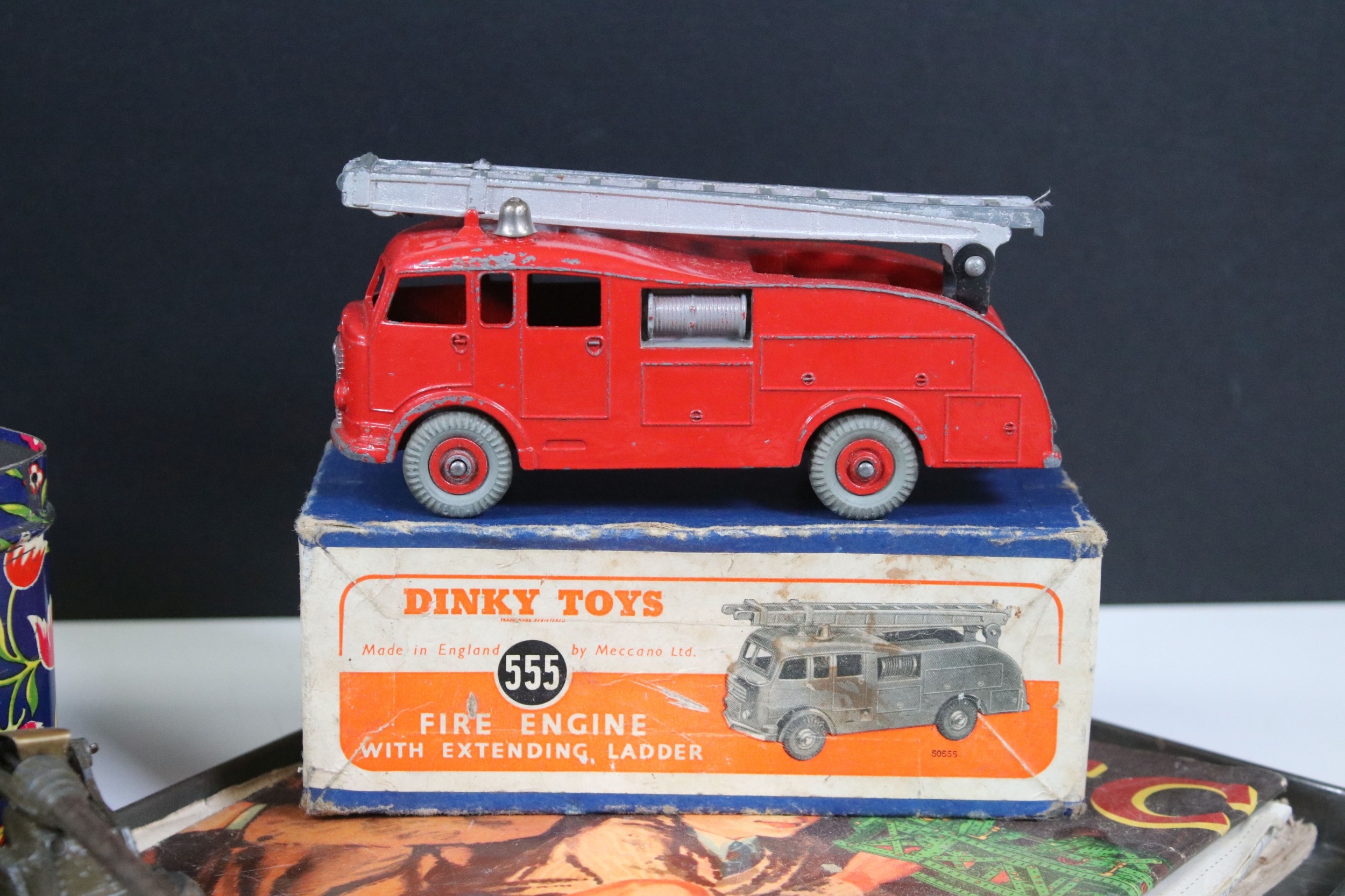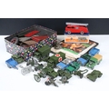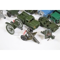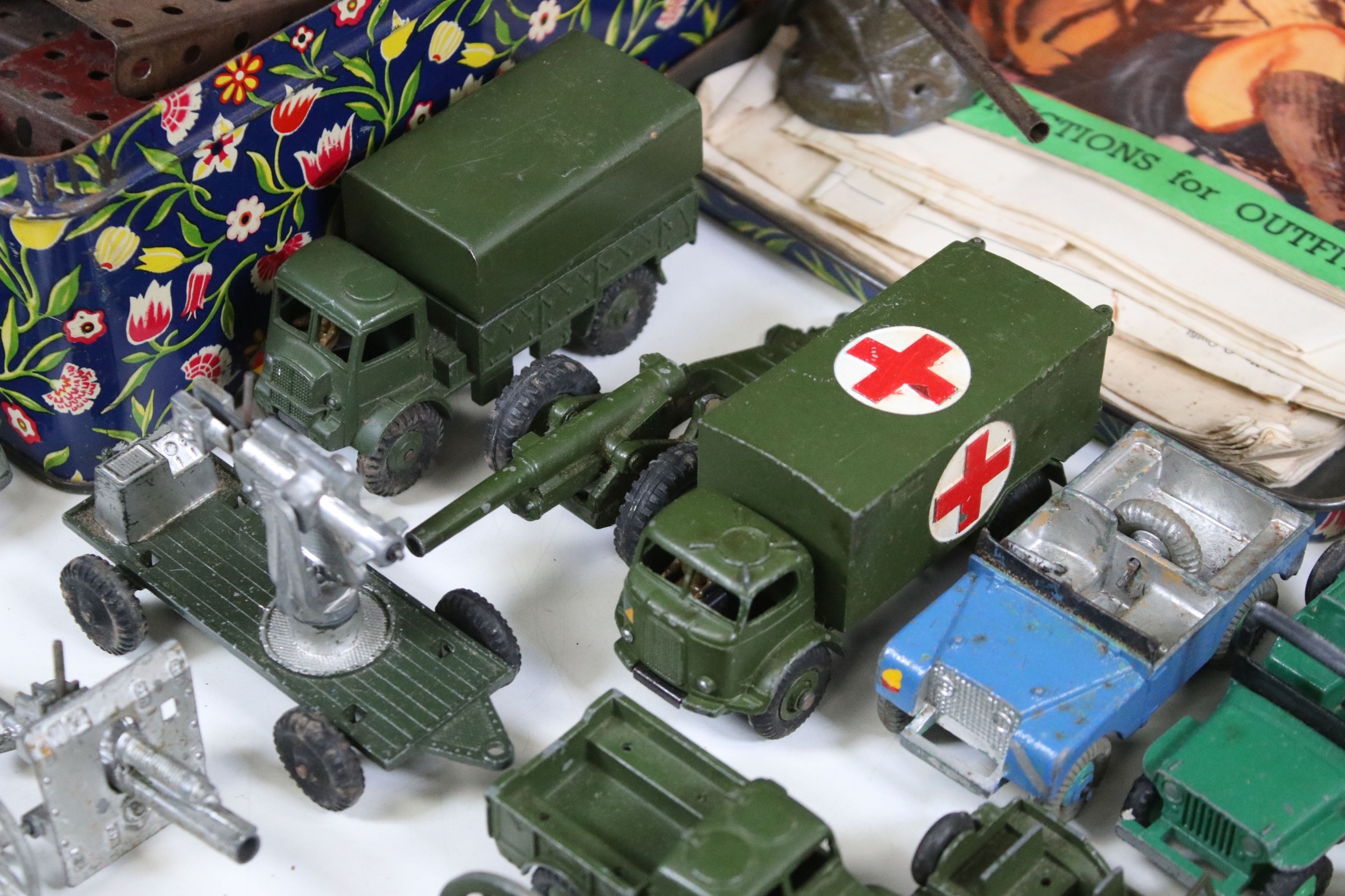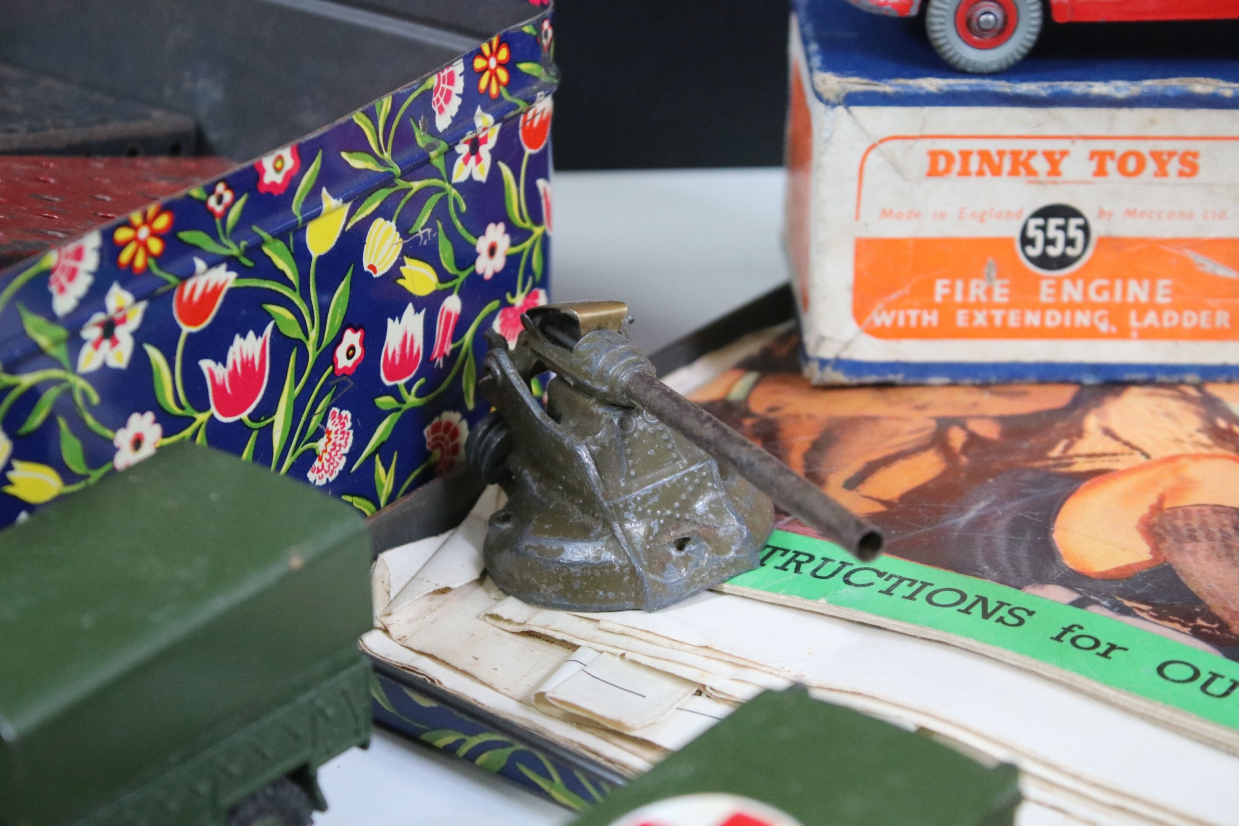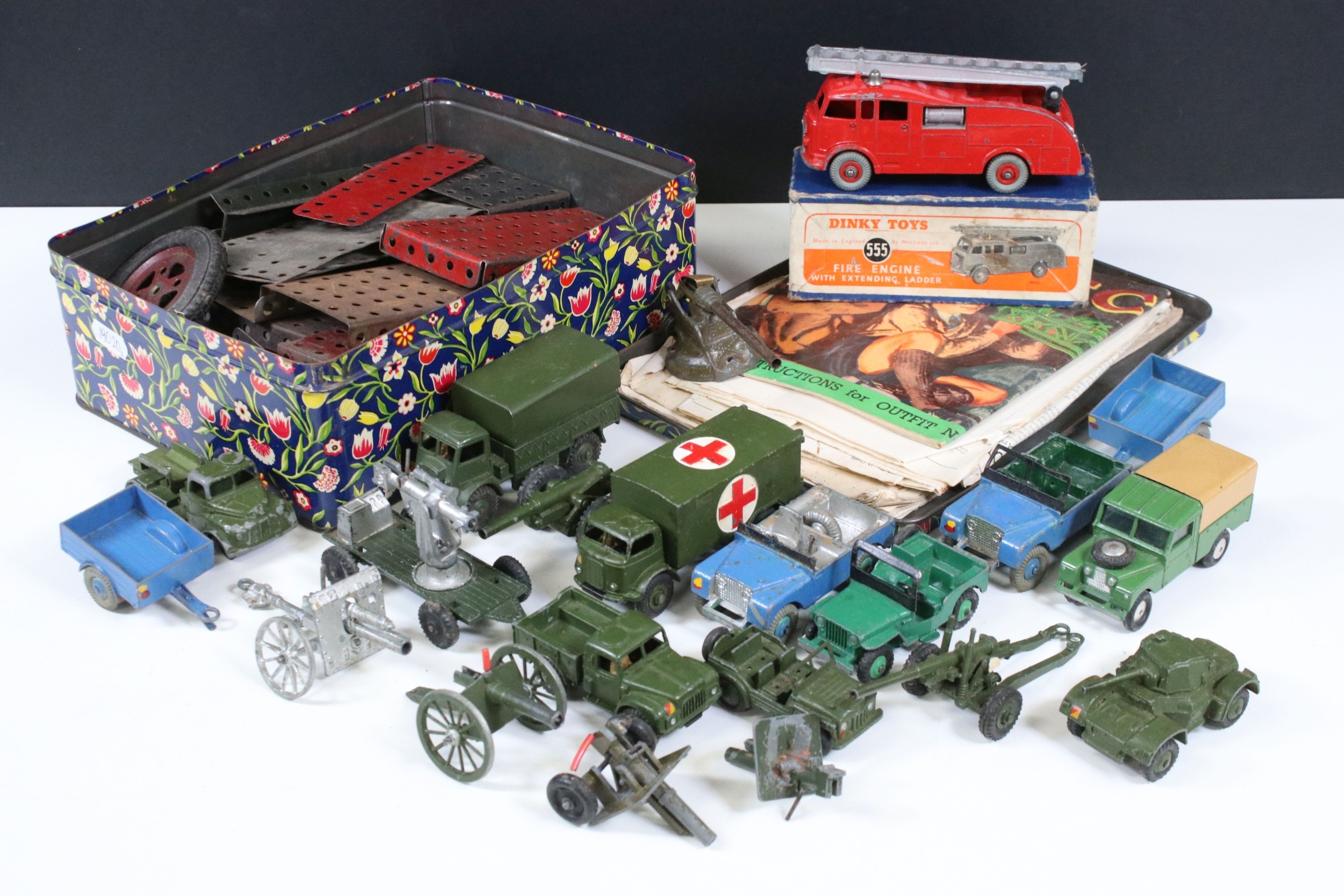 Collection of diecast models to include boxed Dinky 555 Fire Engine With Extending Ladder, quantity of military diecast models including Dinky 623 Army Wagon, Dinky 641 Army 1 Ton Cargo Truck, Dinky Land Rover, Dinky 7.2 Howitzer, etc, together with a small quantity of Meccano including parts, accessories and wheels, etc (2 Boxes)