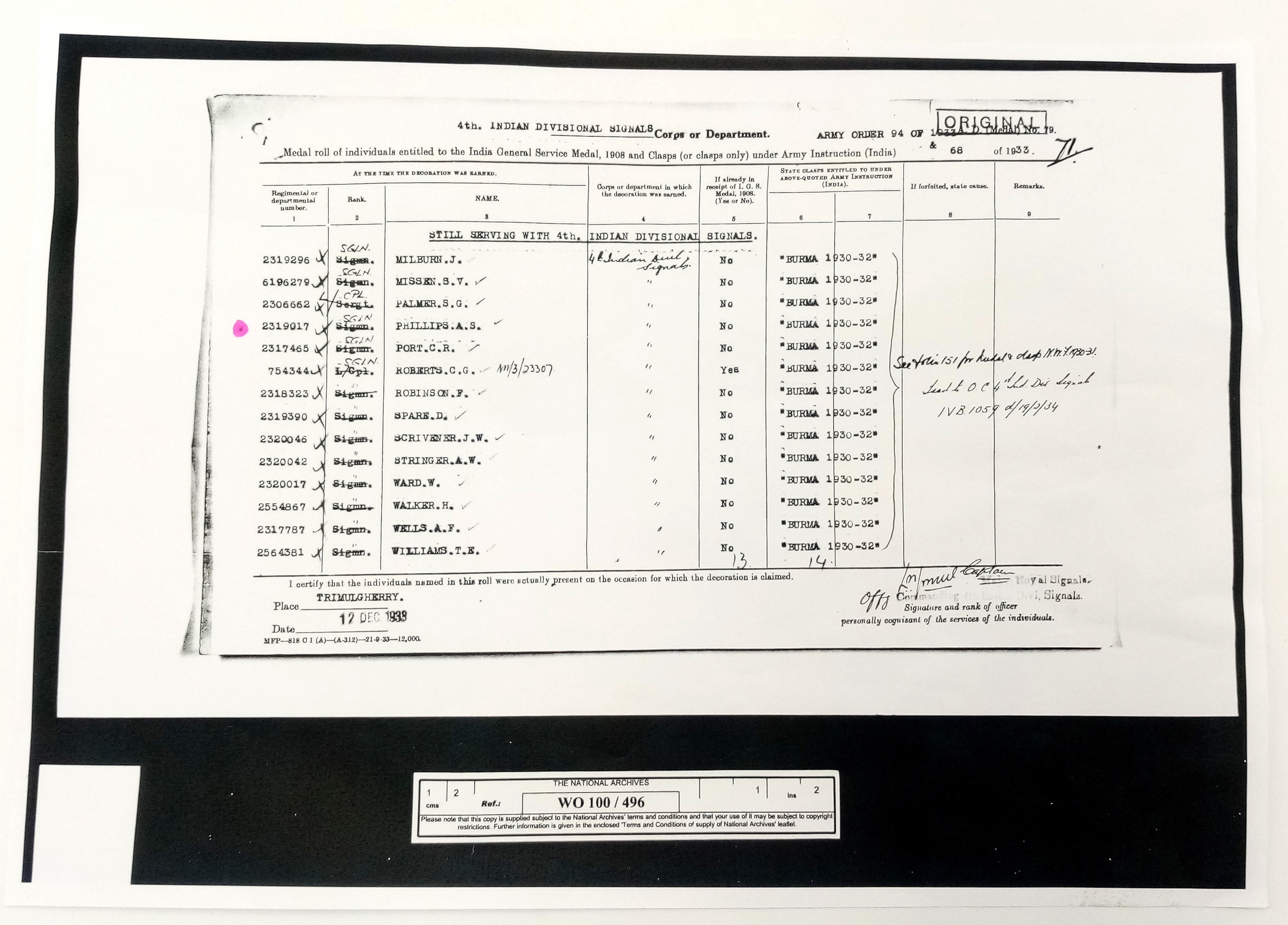 An Indian General Service Medal 1908, with clasp ‘Burma 1930-32’. Named to: 2319017 Sgln A S Phillips R Signals.