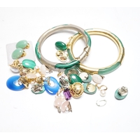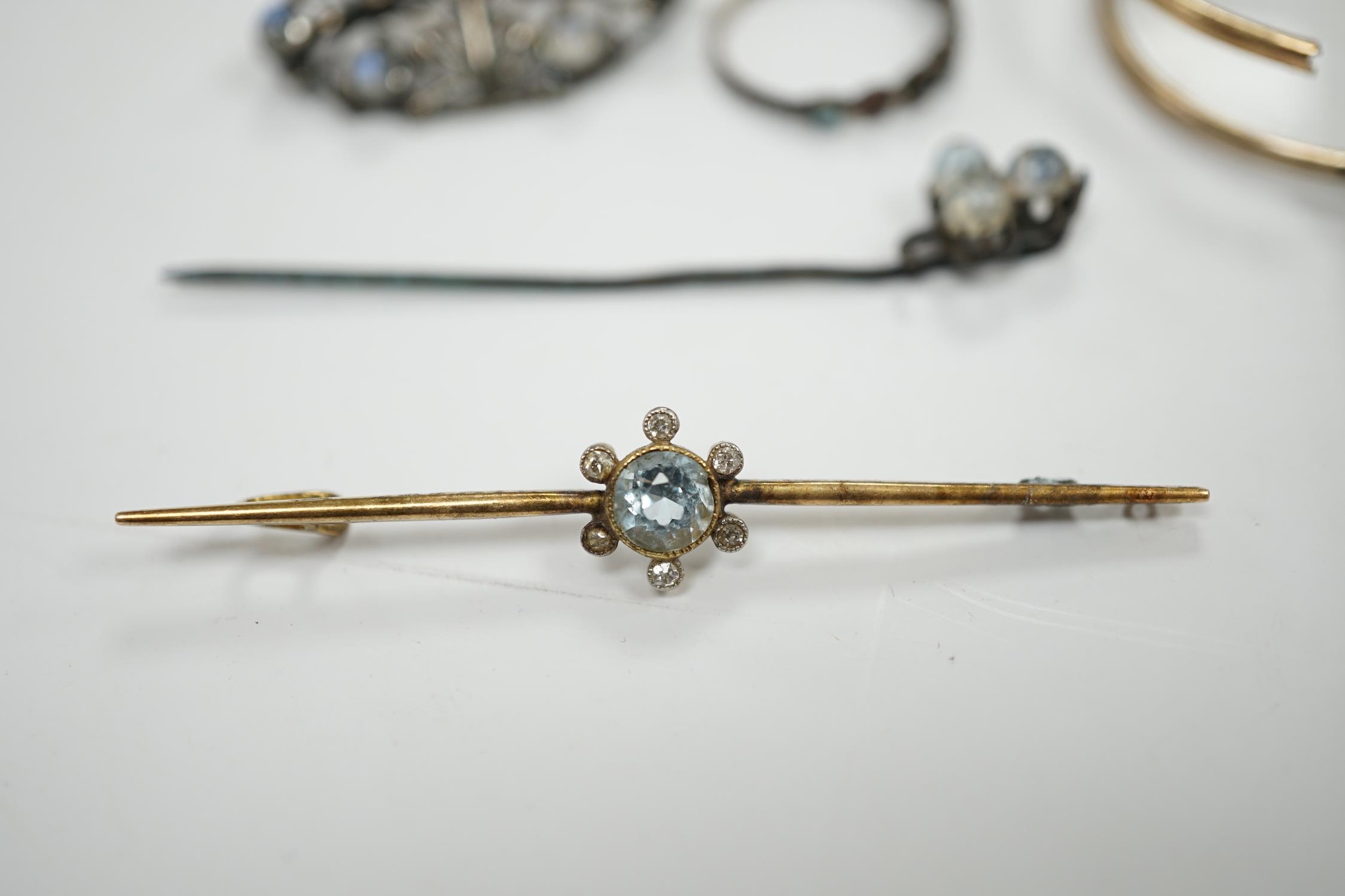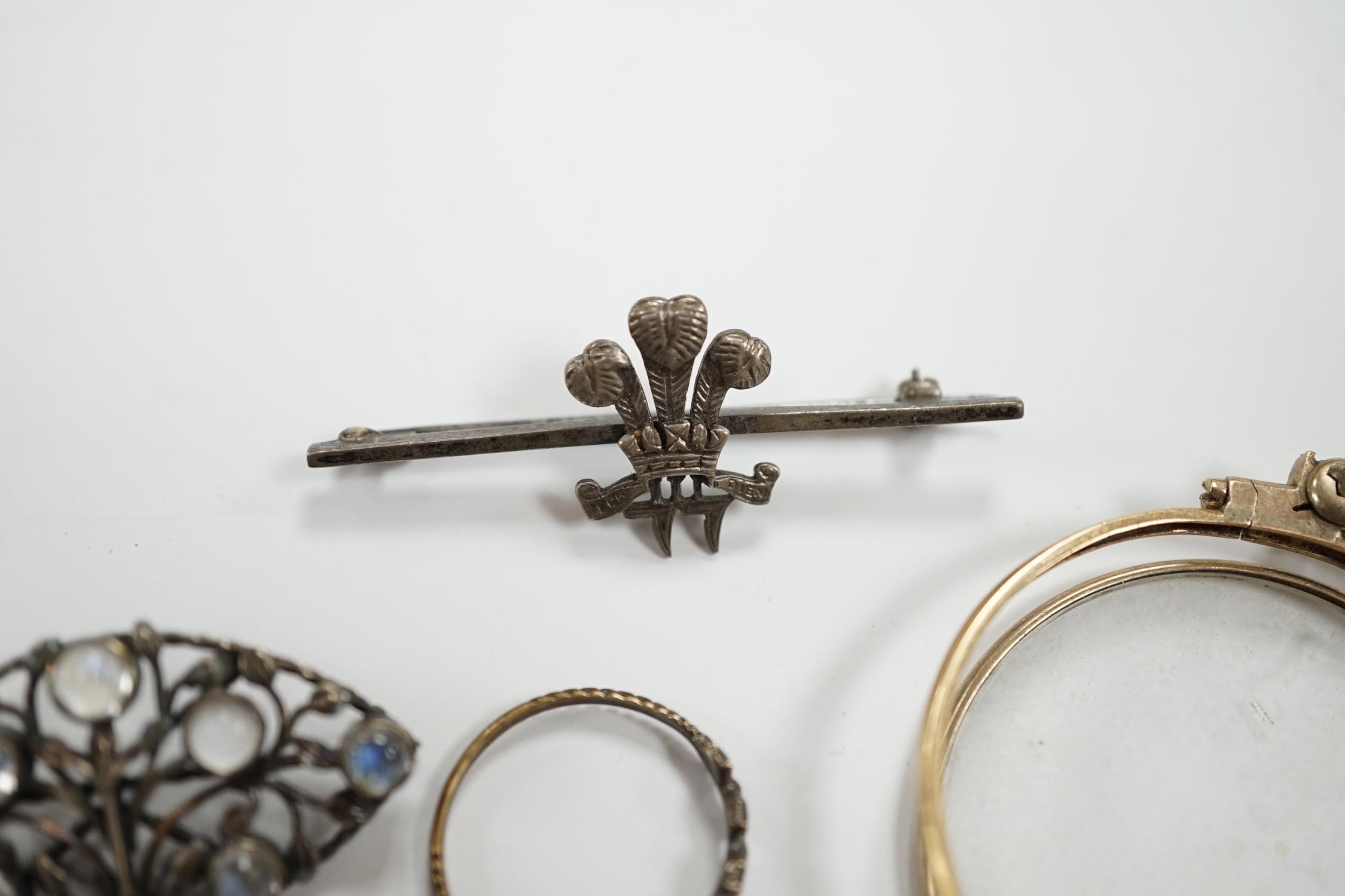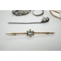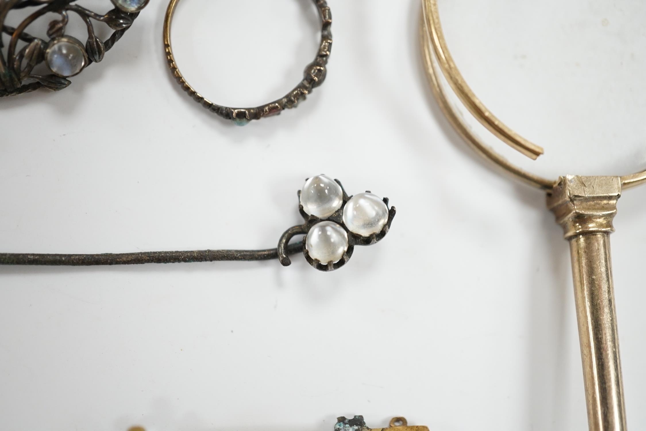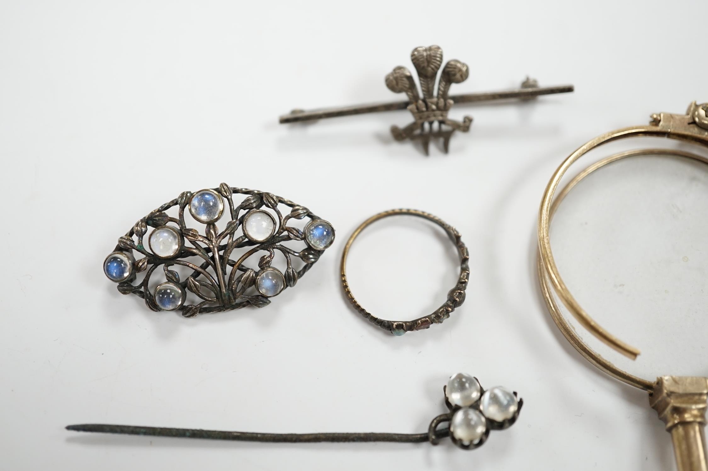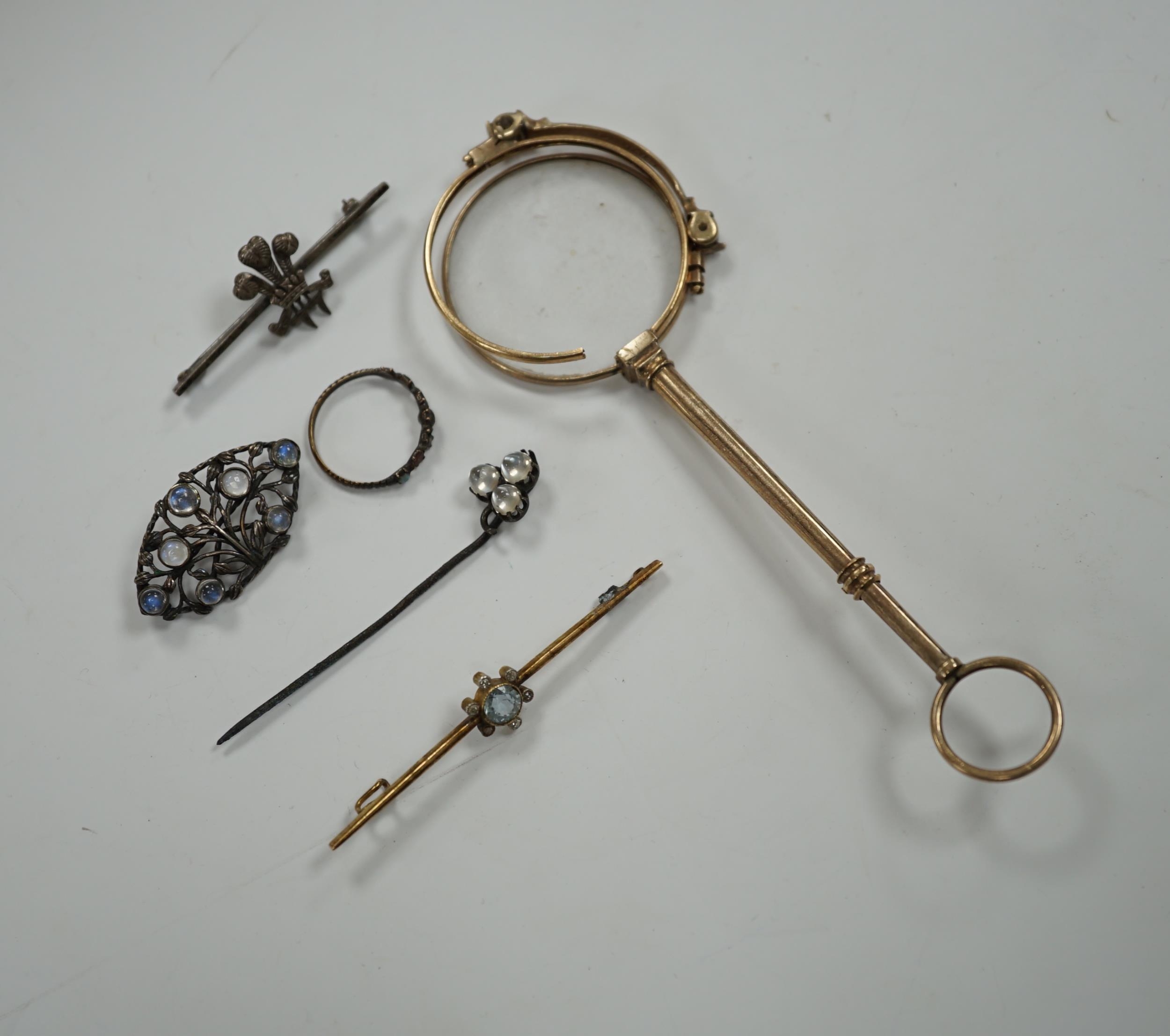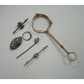 A pair of gold plated lorgnettes (a.f.) and five other items of jewellery including moonstone set (all a.f.).