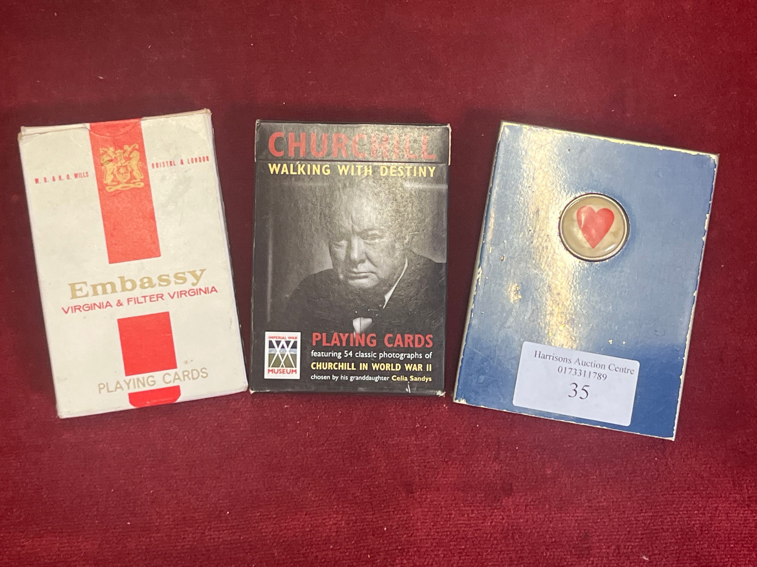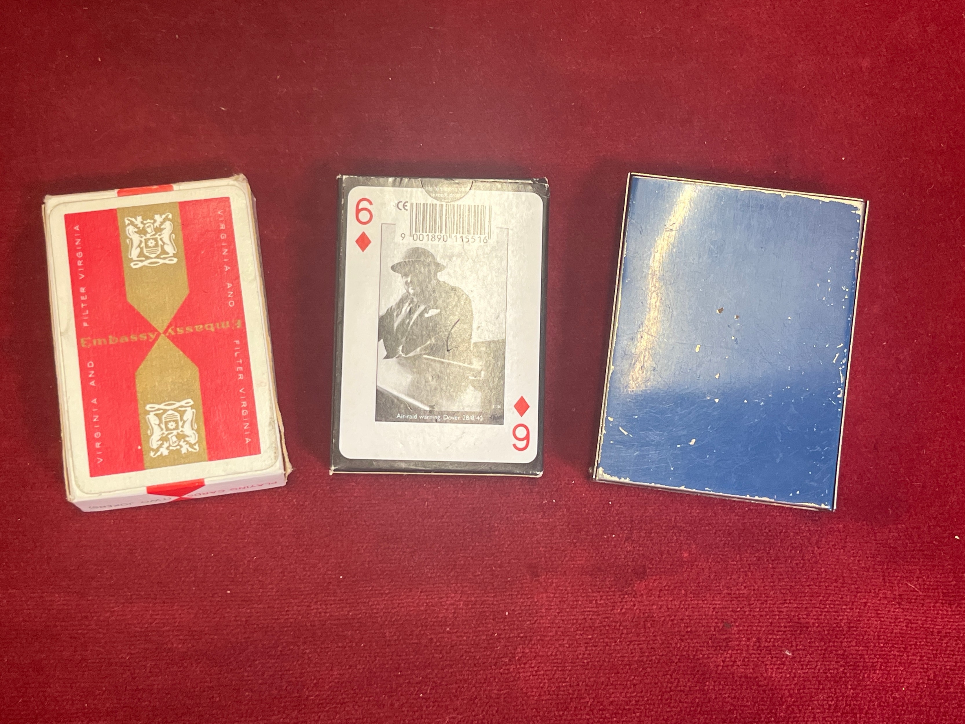 3 PACKS OF VINTAGE CARDS WINSTON CHURCHILL PHOTOS, A PACK INSIDE A METAL CASE, PLUS A SET OF EMBASSY CIGARETTES