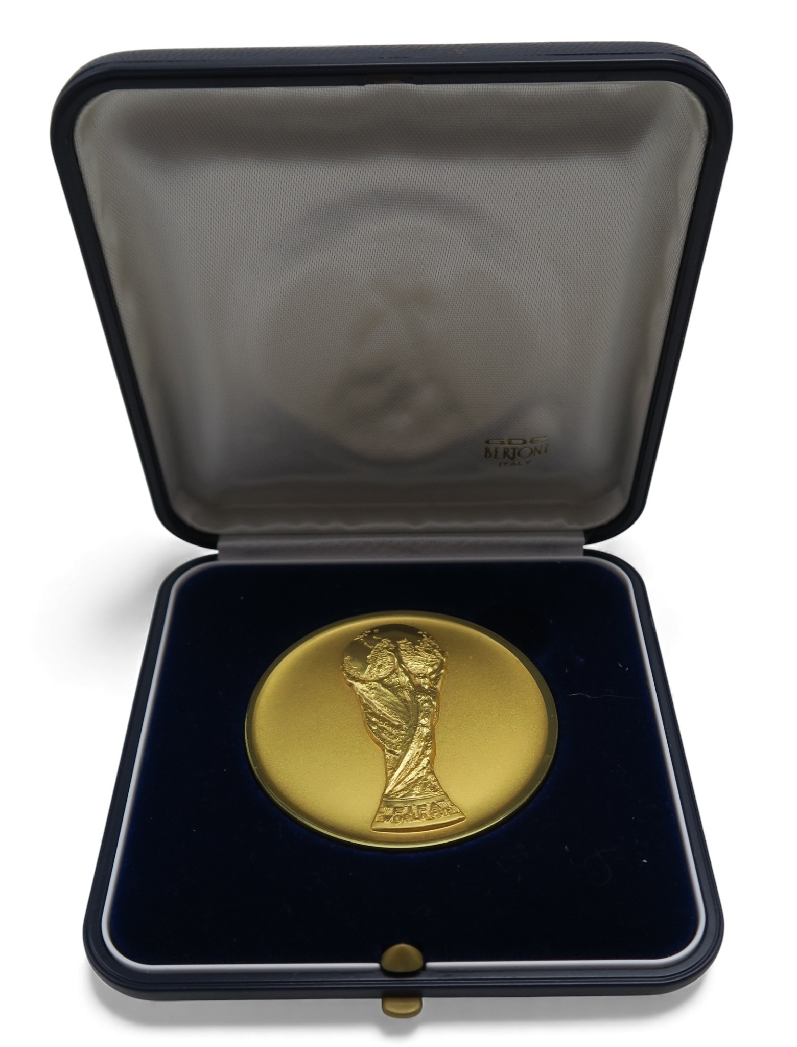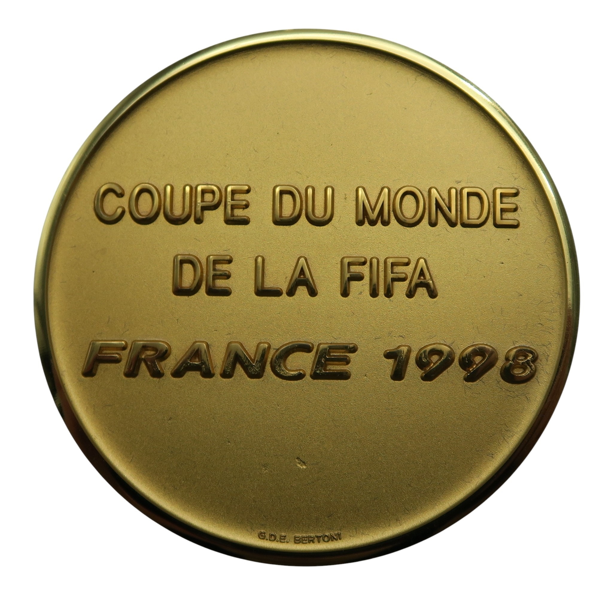 A FIFA 1998 France World Cup commemorative/participation gilt medallion by Bertoni, cast verso "Coupe du Monde de la FIFA France 1998, in presentation case