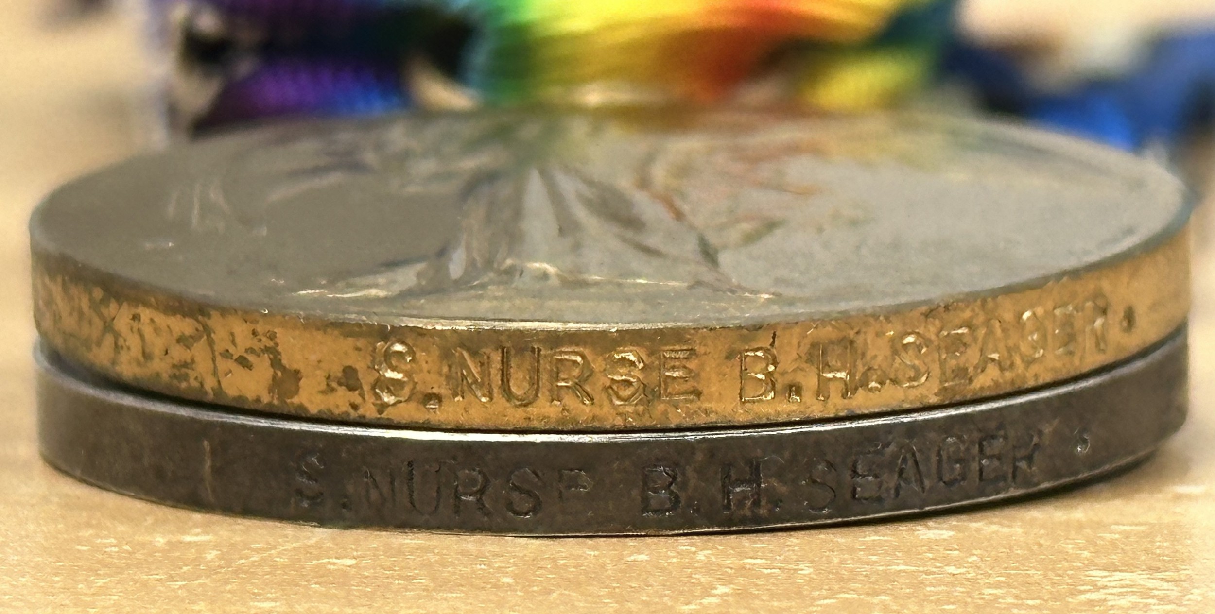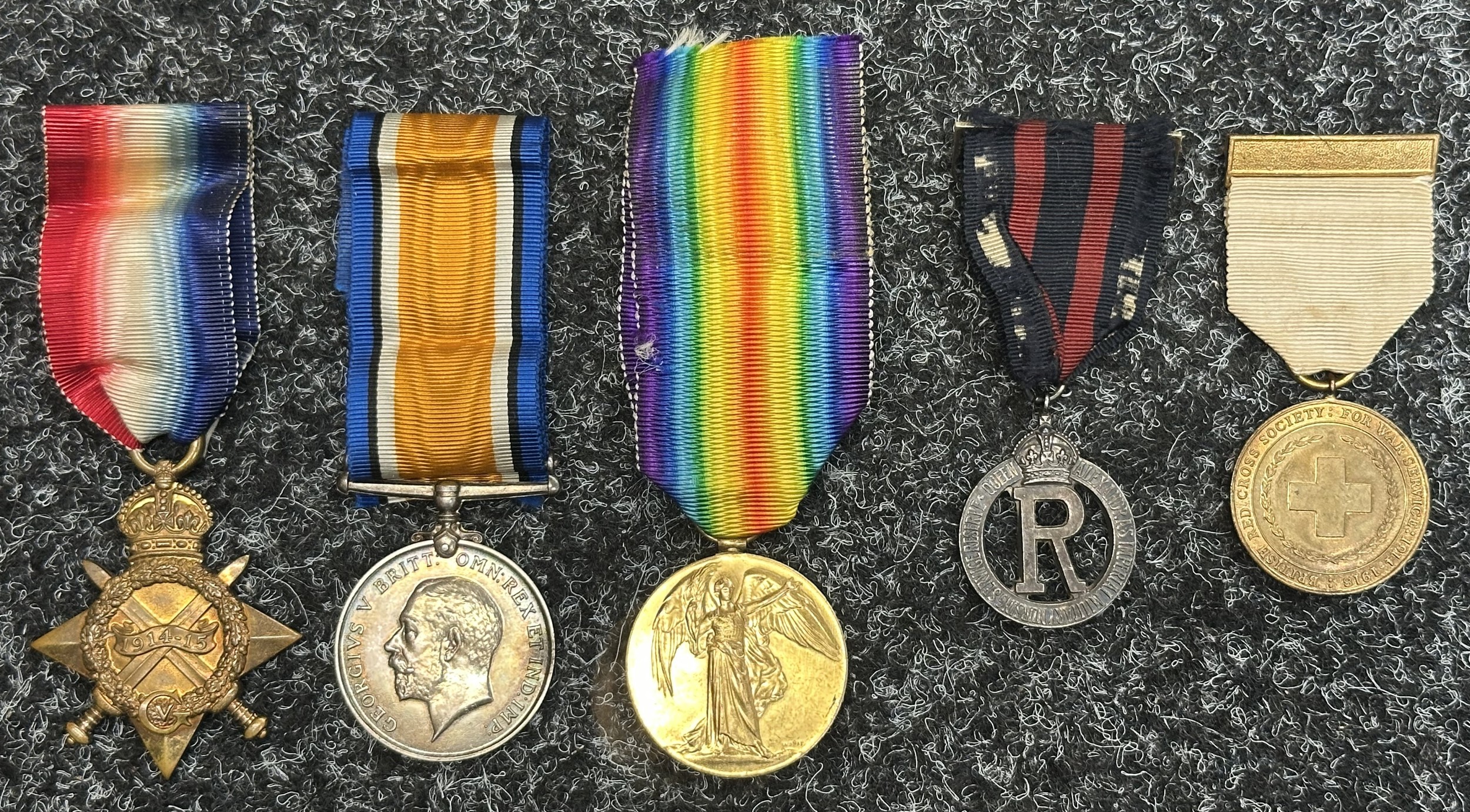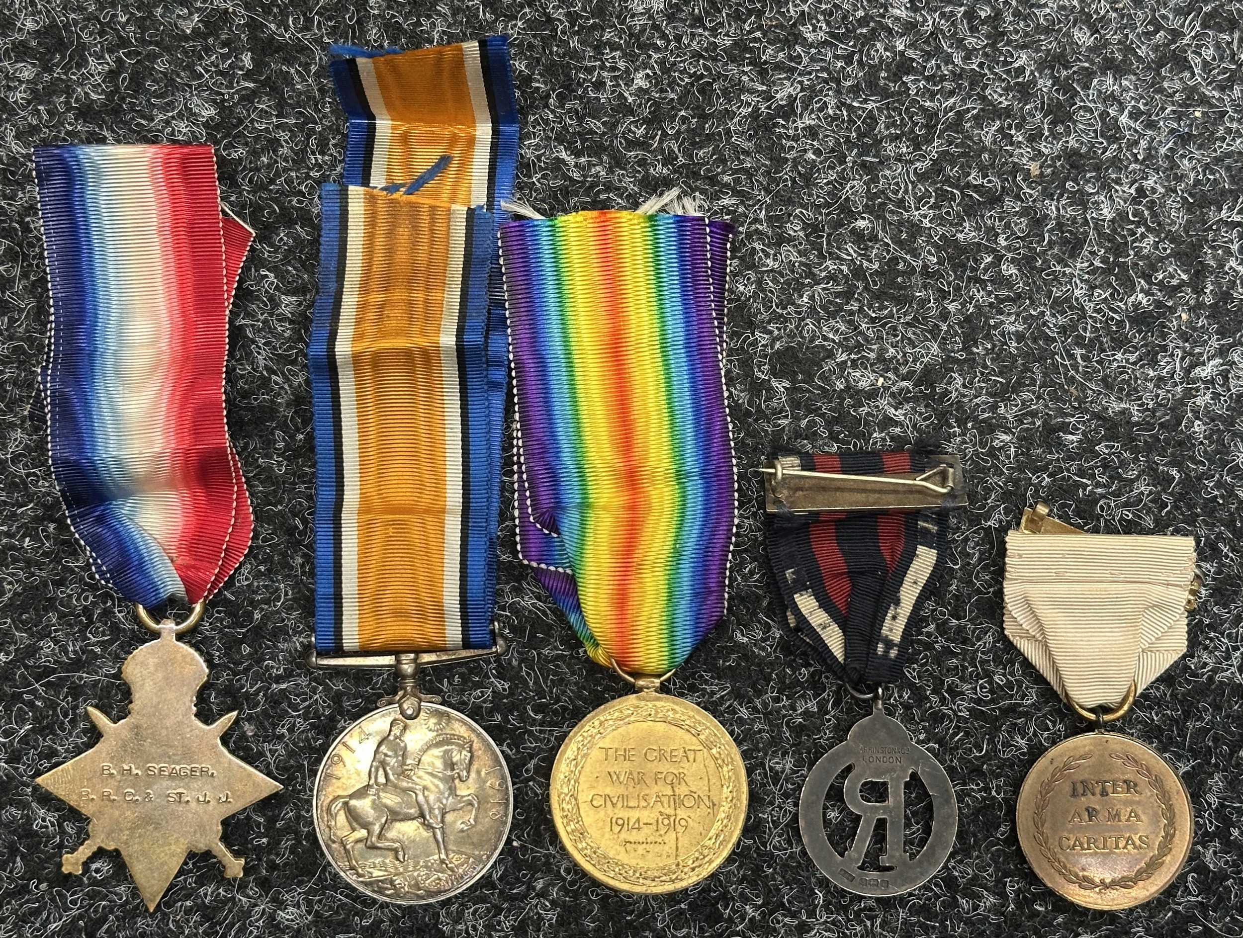 WW1 British Red Cross Sisters Medal Group to Staff Nurse BH Seager BRC & ST.JJ comprising of 1914-15 Star, War Medal, Victory Medal and Queen Alexandra's Imperial Military Nursing Service Reserve Cape badge. Along with a British Red Cross Society War Service Medal. All complete with original ribbons. Plus her collar dogs.