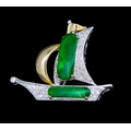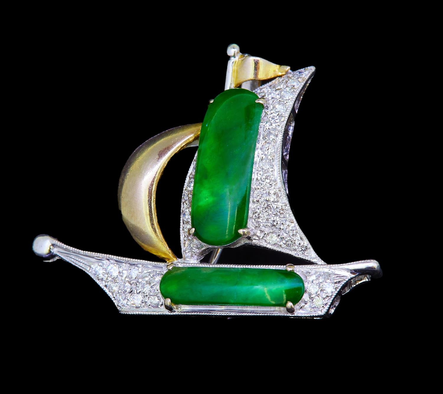 JADE AND DIAMOND SAILING BOAT BROOCH, in 18-ct gold. designed as a sailing boat, set with a jade to the big sail and the hull. The big sail and hull further set with diamonds totalling approx. 0.50 ct. W. 3.4 cm. 6.9 grams.