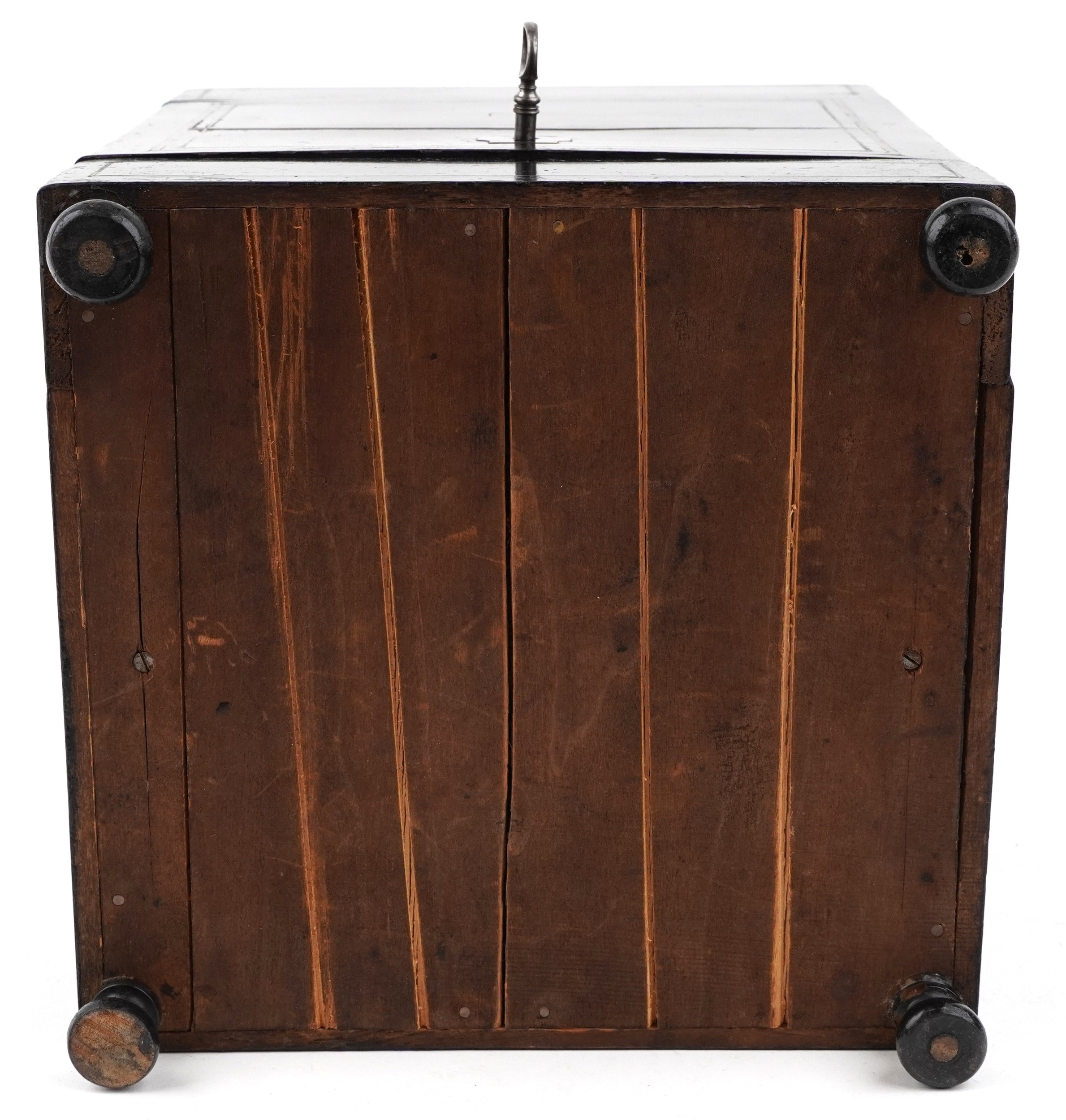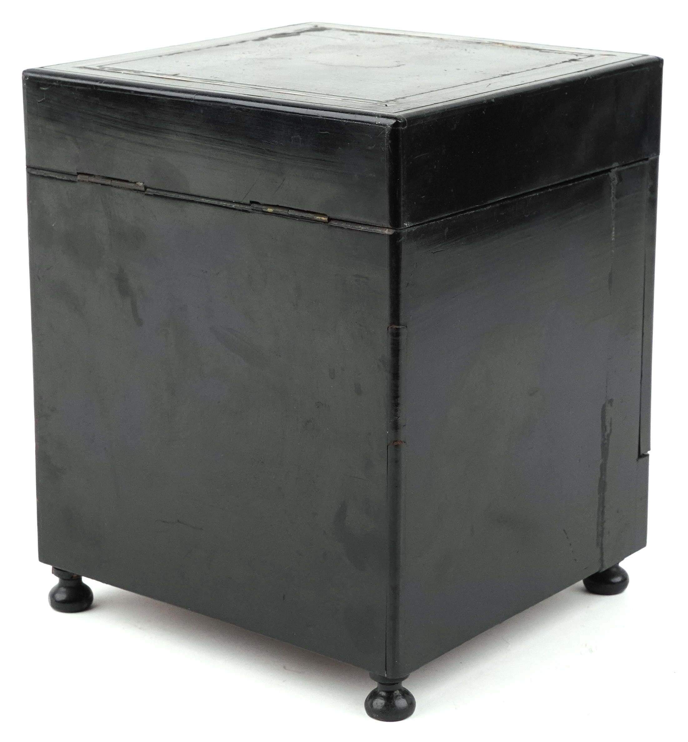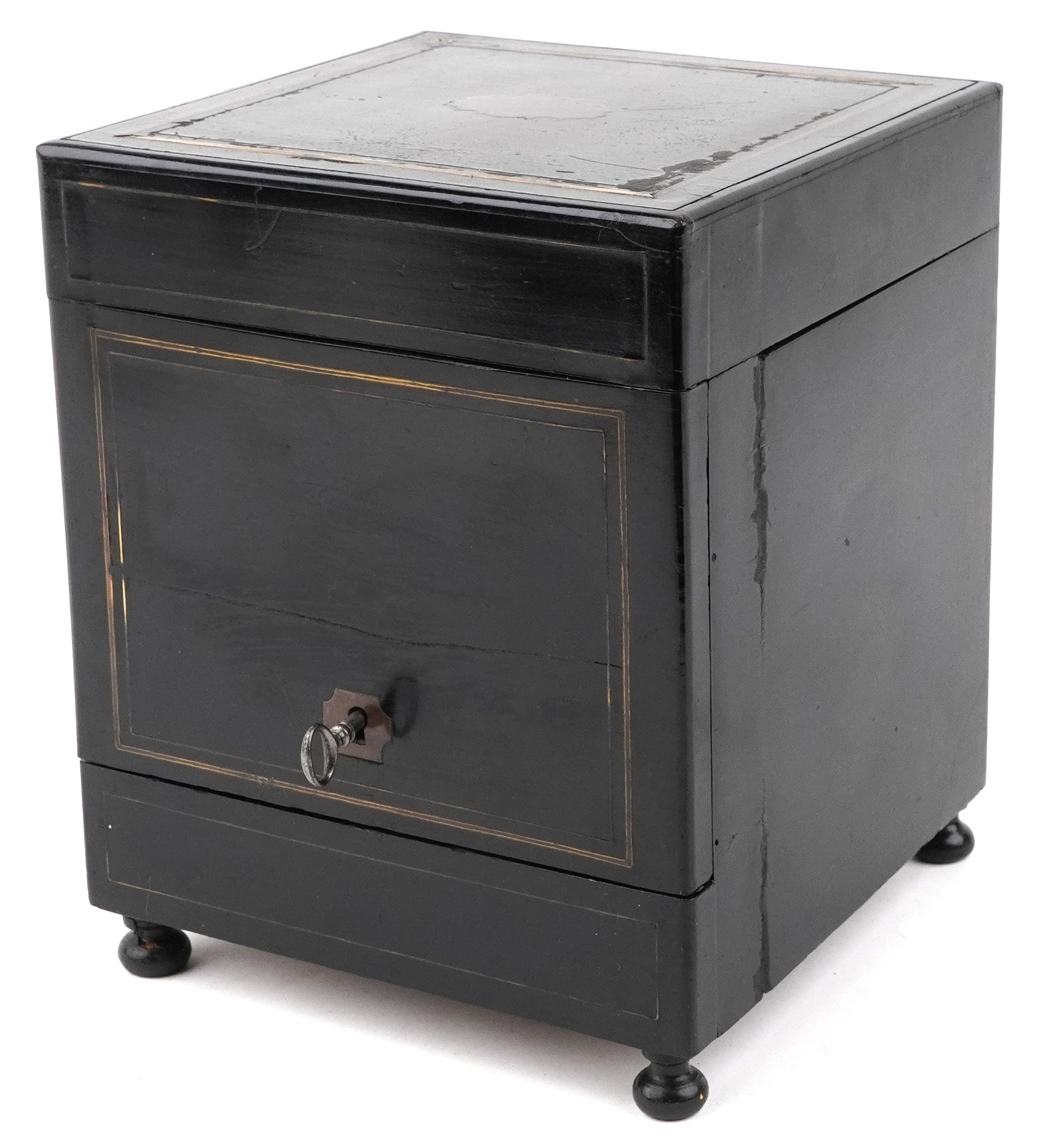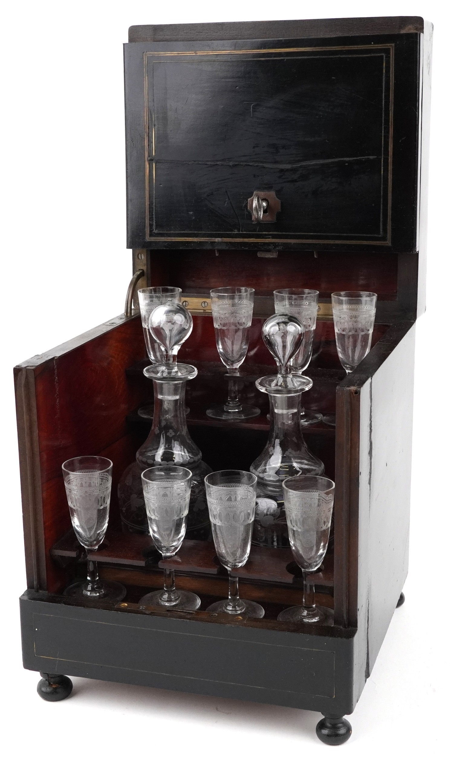 A mid Victorian ebonised table top drinks cabinet with brass inlaid stringing, the hinged top revealing a fitted interior with two acid edged decanters and eight liqueur glasses, 25cm H x 21cm W x 20cm D.