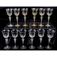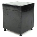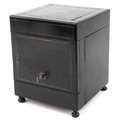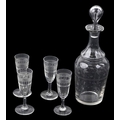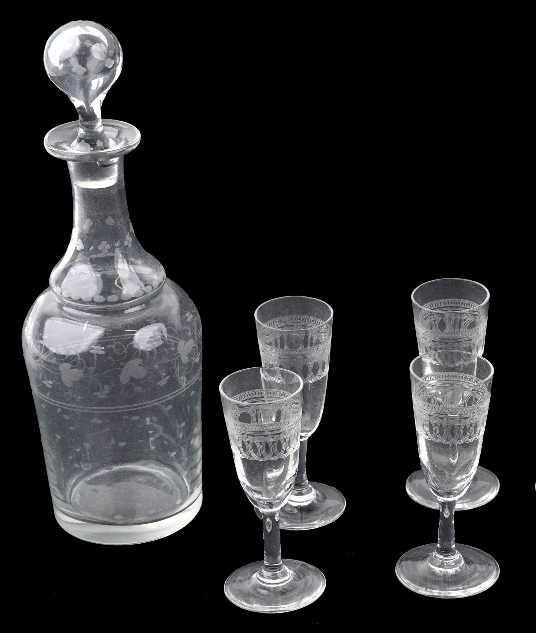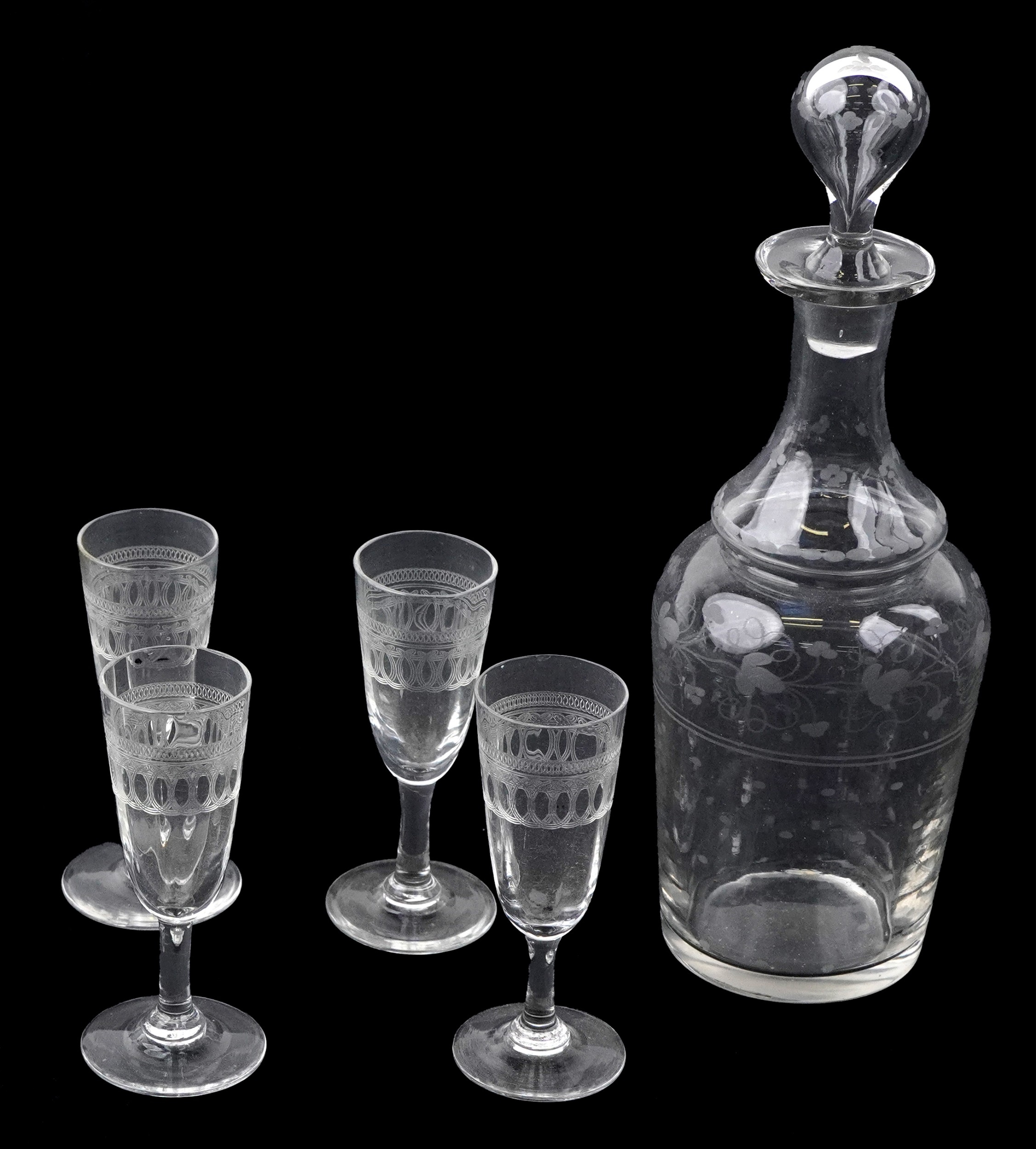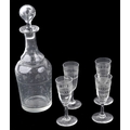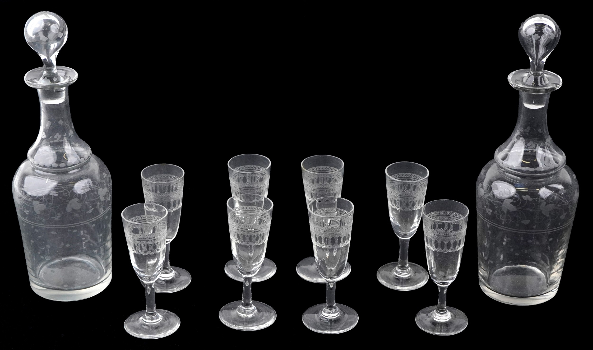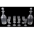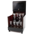 A mid Victorian ebonised table top drinks cabinet with brass inlaid stringing, the hinged top revealing a fitted interior with two acid edged decanters and eight liqueur glasses, 25cm H x 21cm W x 20cm D.