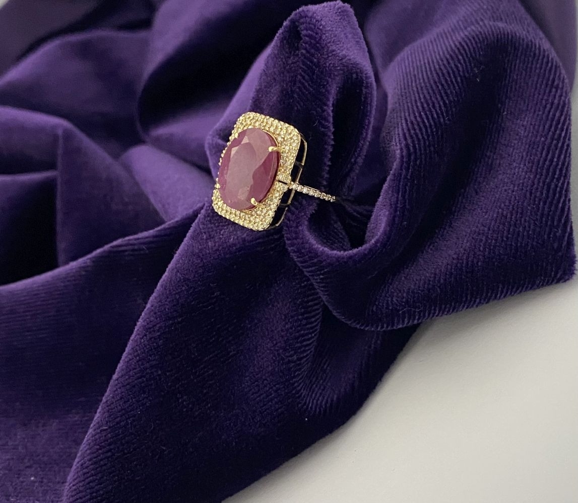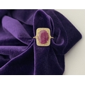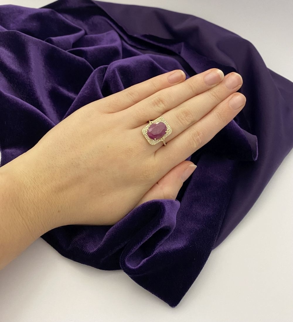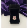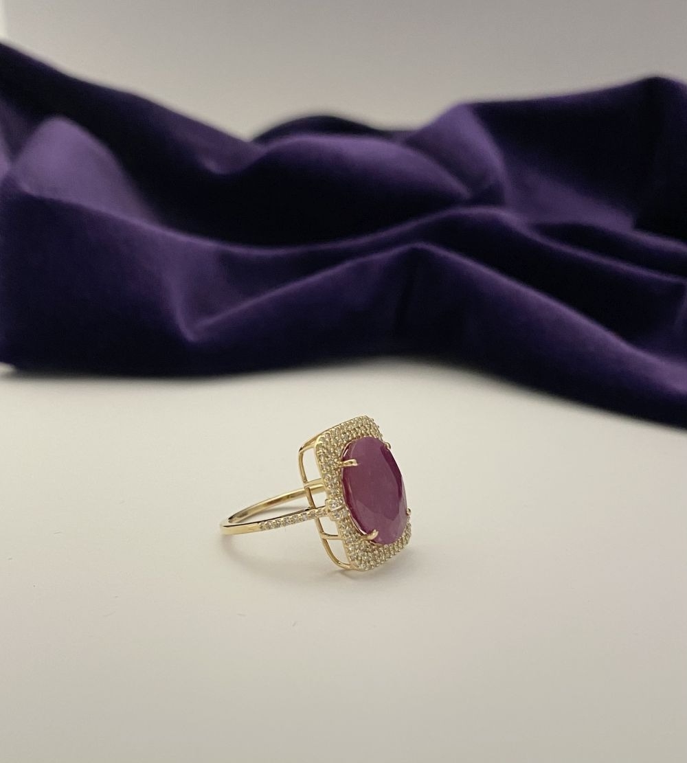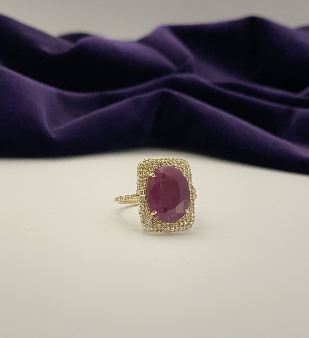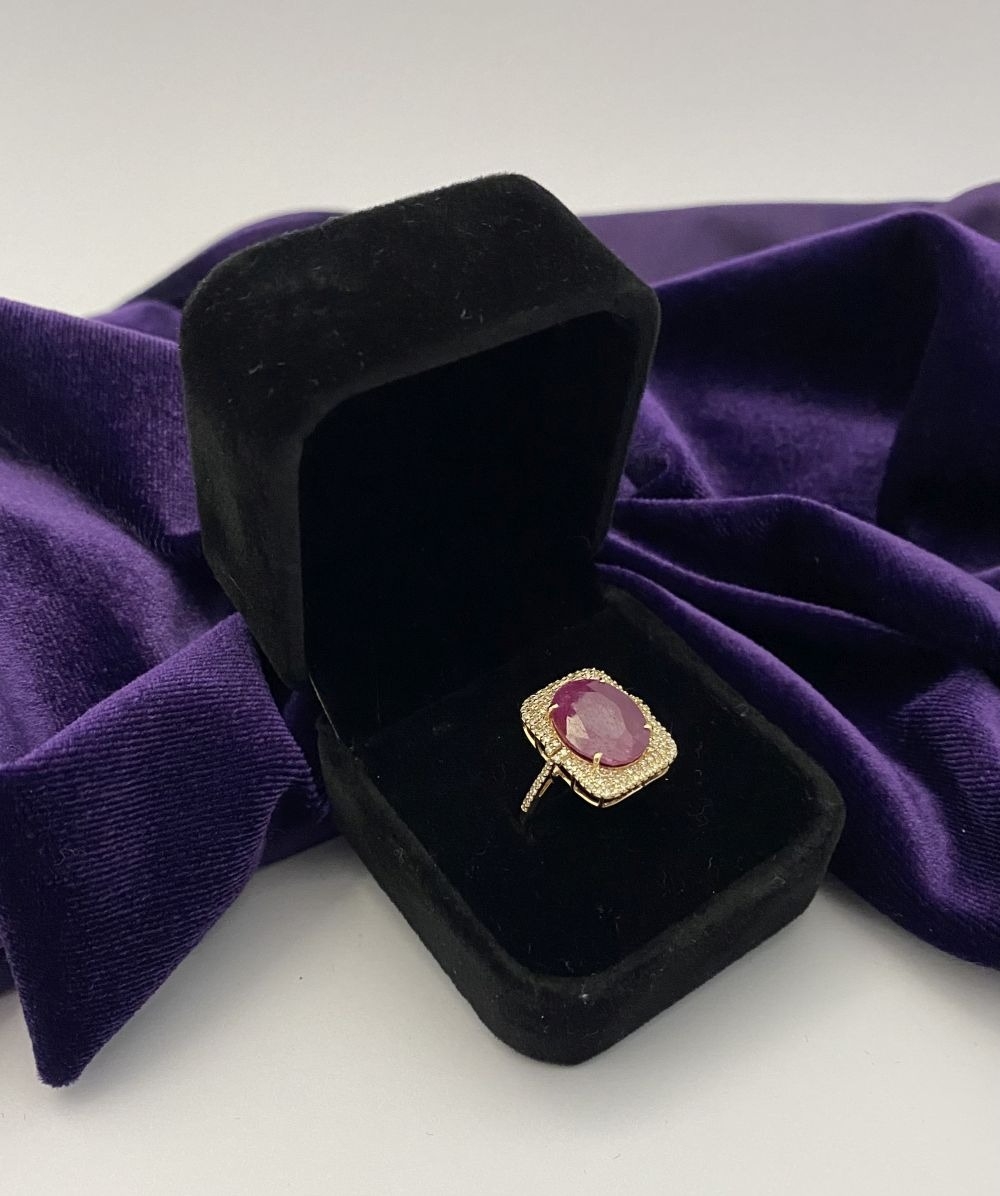 A MAGNIFICENT 14CT GOLD RUBY & DIAMOND STATEMENT RING, with central 6.65ct oval mixed cut ruby, claw set, surrounded by rows of round cut pave set diamonds on raised setting, continuing to shoulders. 112 natural diamonds total, colour: G-H, clarity: SI-I1, total weight: .33ct approx. Hallmarked JTQ 14K to interior band. Ring Size: N. Complete with International Gemological Institute Report.
