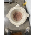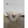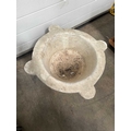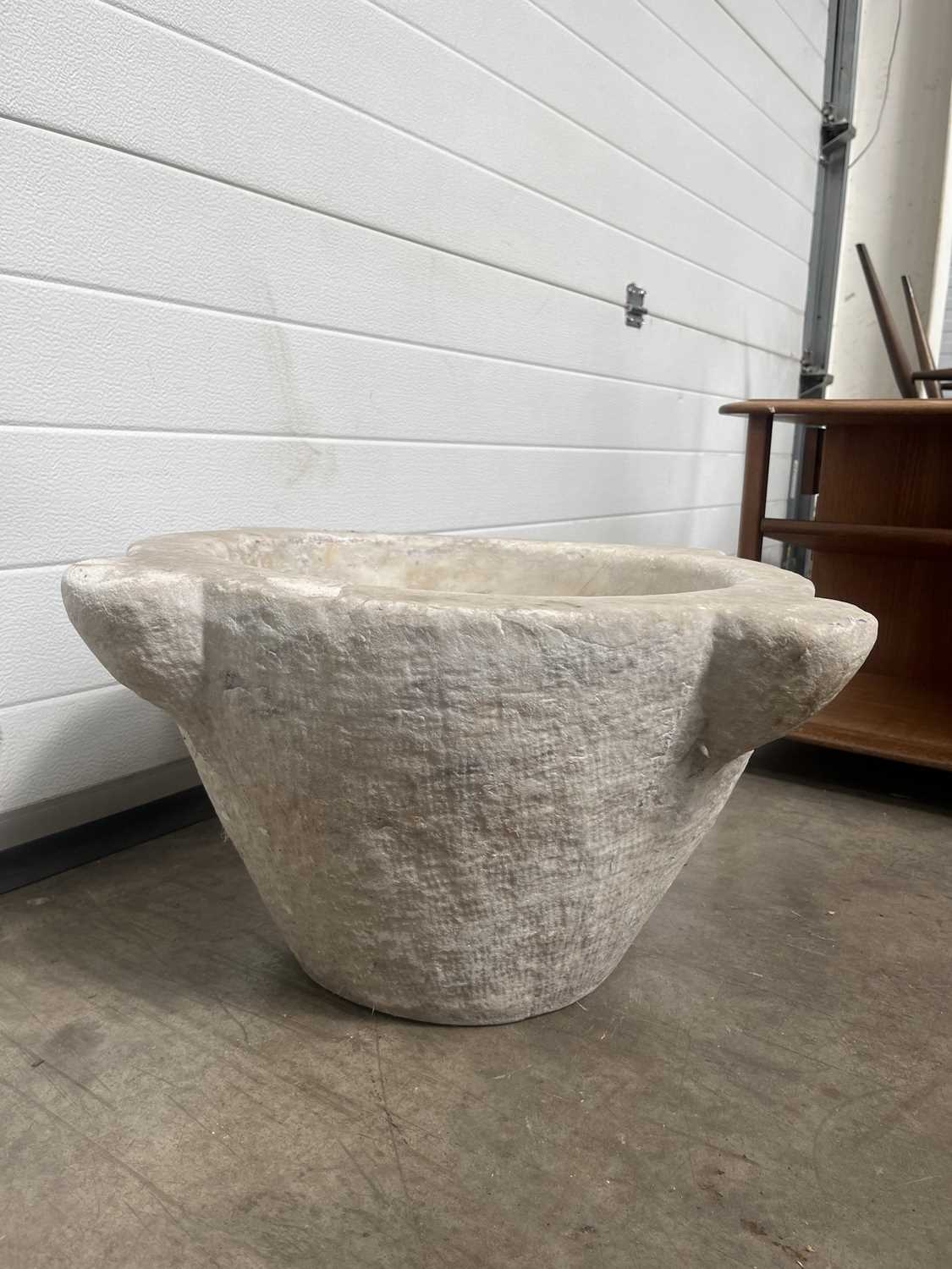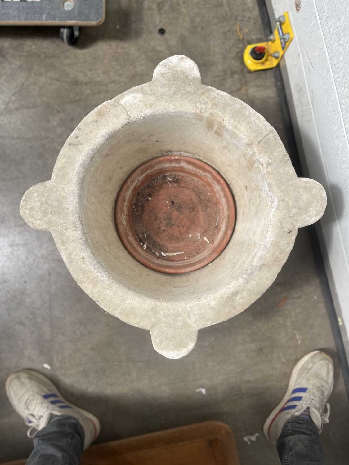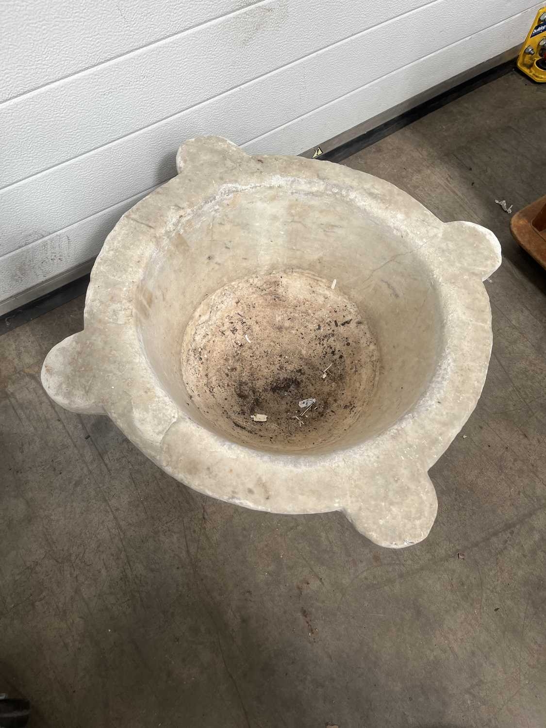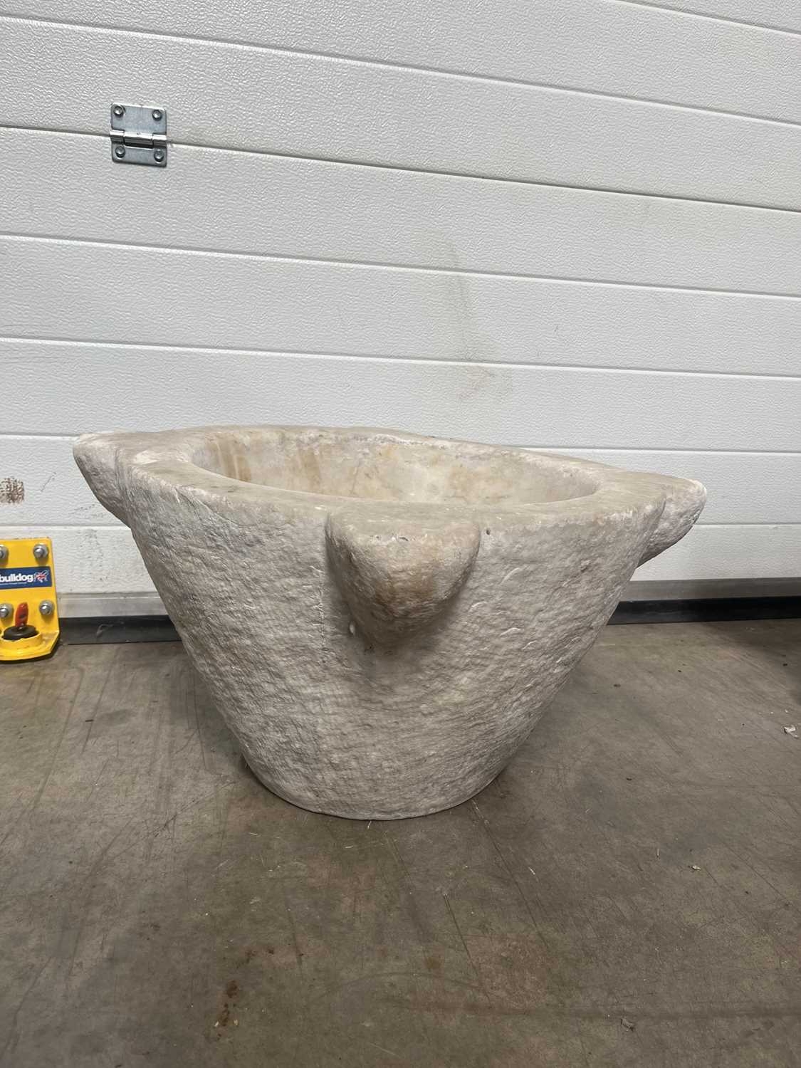 A large carved white marble mortar, carved with four lugs from a single block of stone, without pestle, height 30cm, average diameter 50cm (1)
