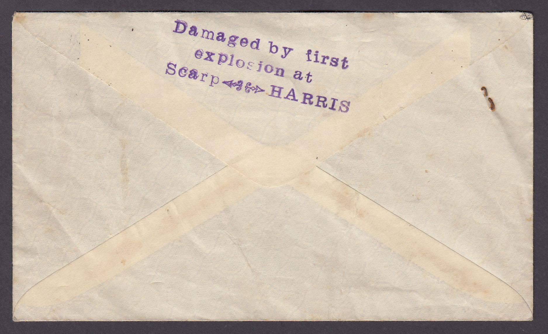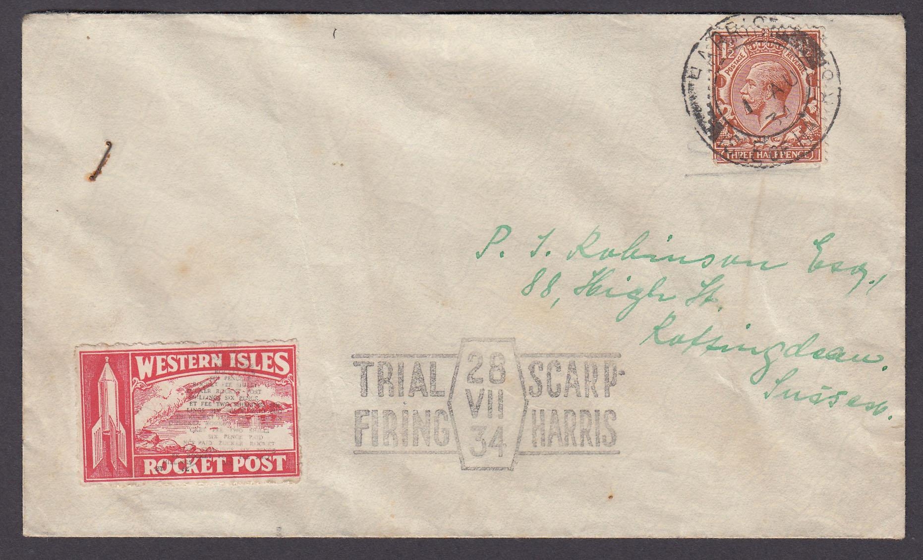 1934 Scrap Harris, Western Isles Rocket Post cover with red vignette, cover flown on Gerhard Zuckers failed experiment, with purple cachet on reverse ‘Damaged by first explosion at Scrap Harris’