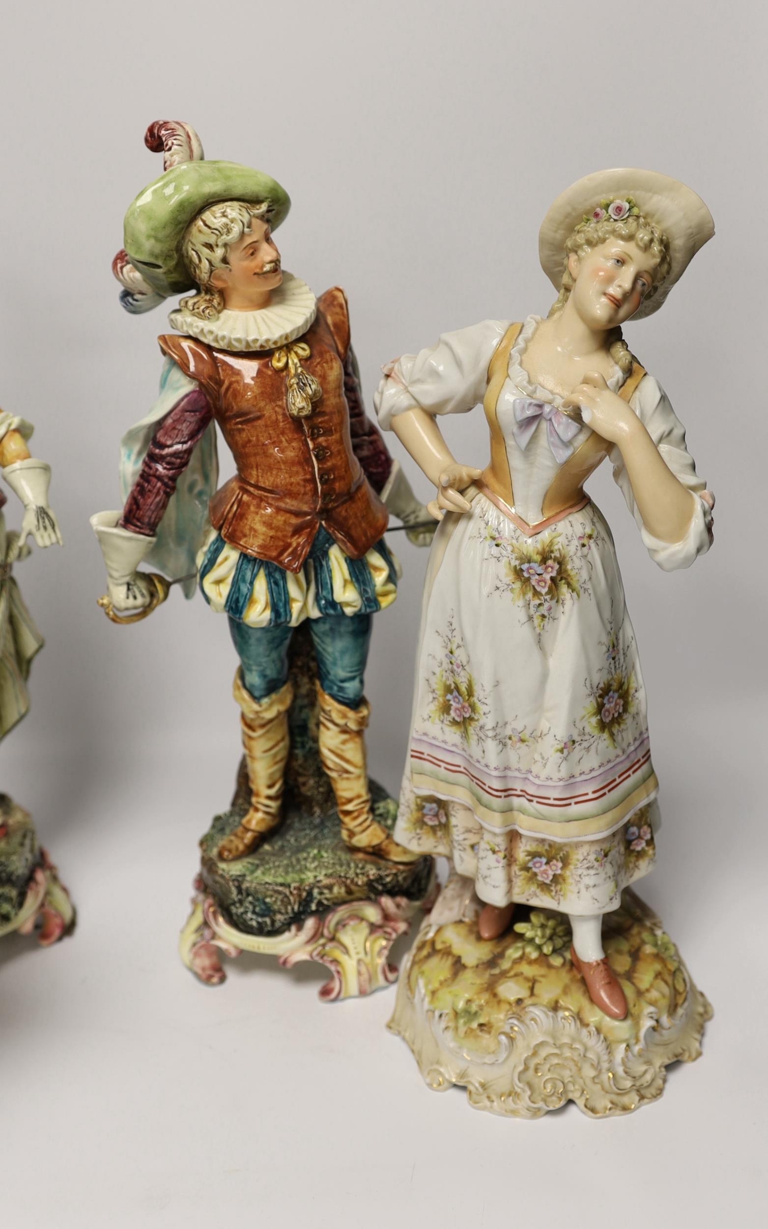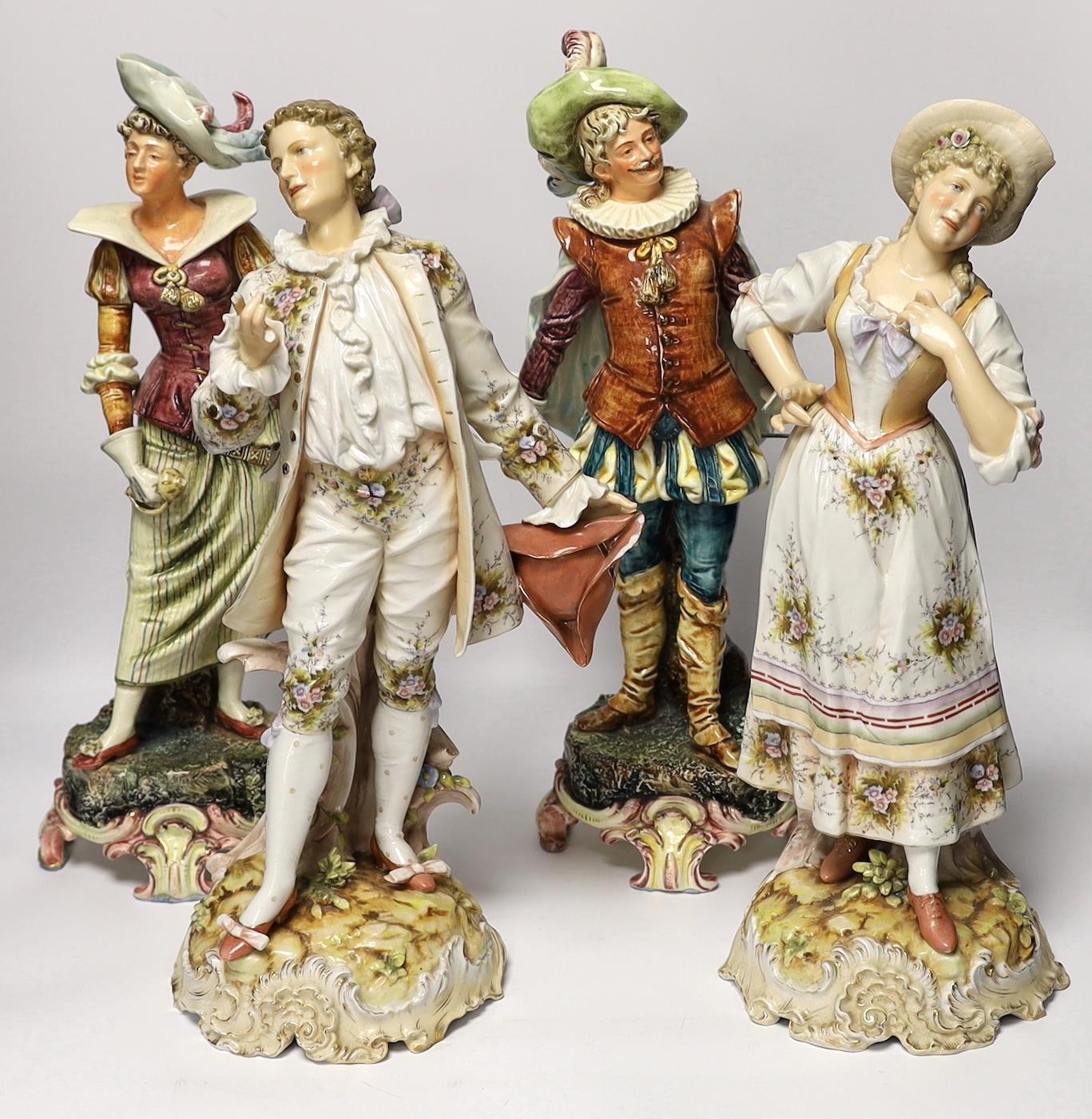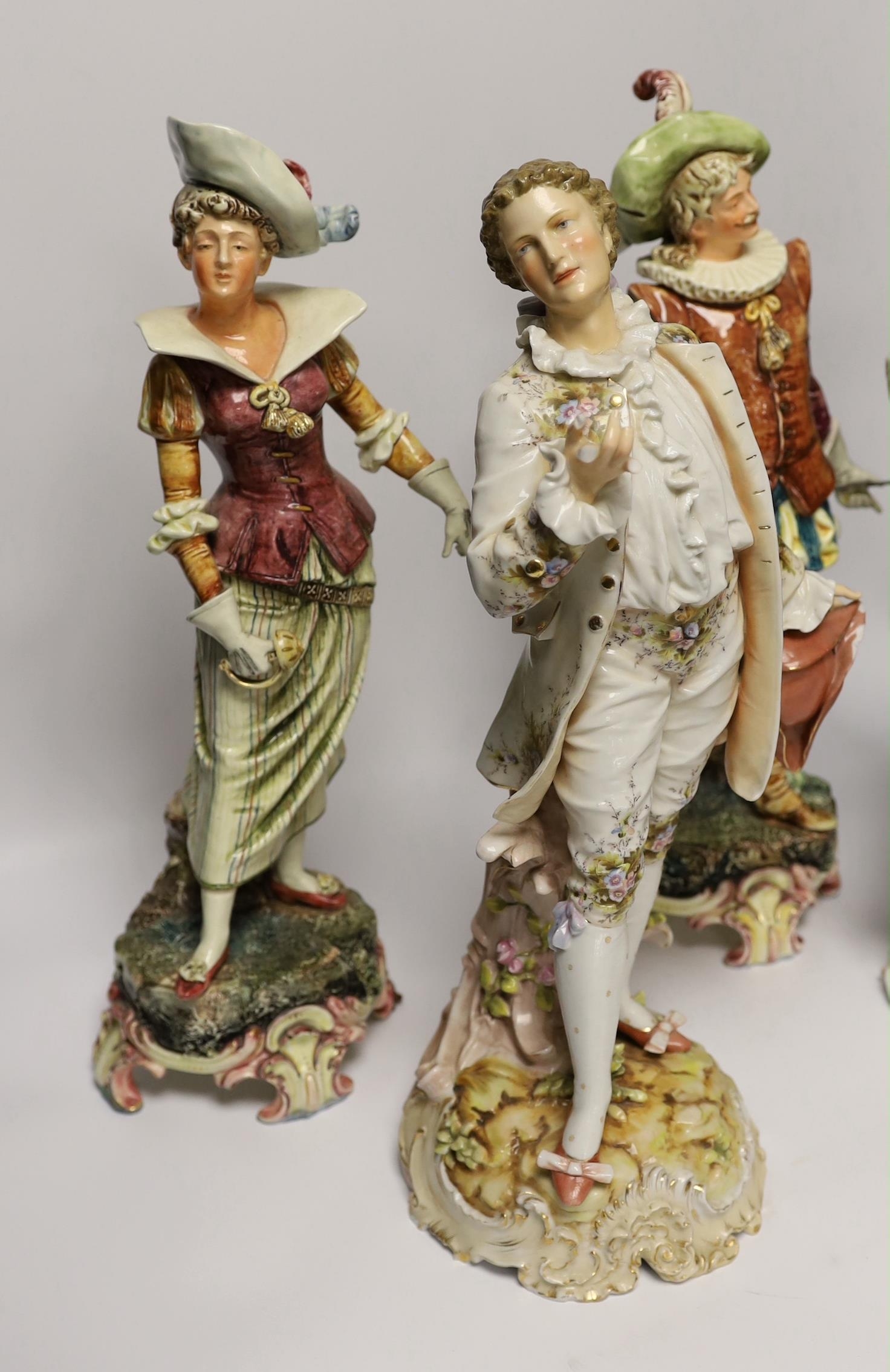 A pair of Volkstedt porcelain figures and a pair continental earthenware figures, 42cm