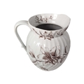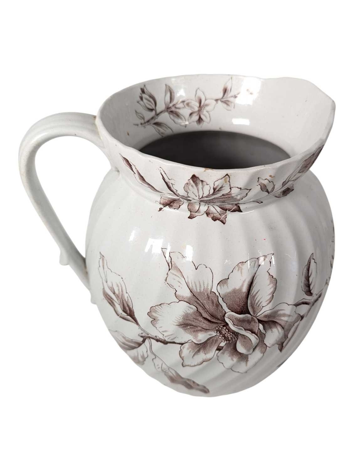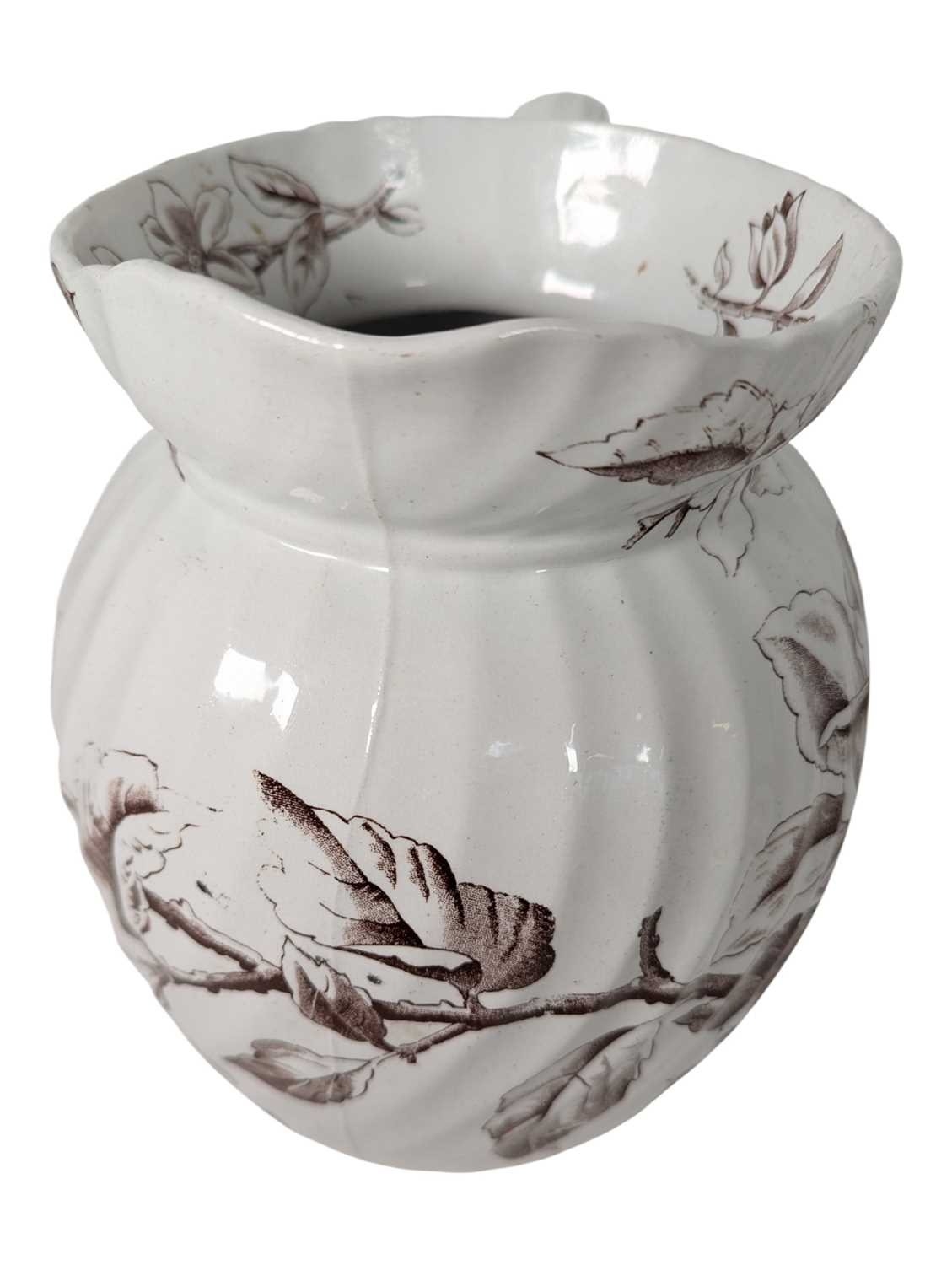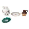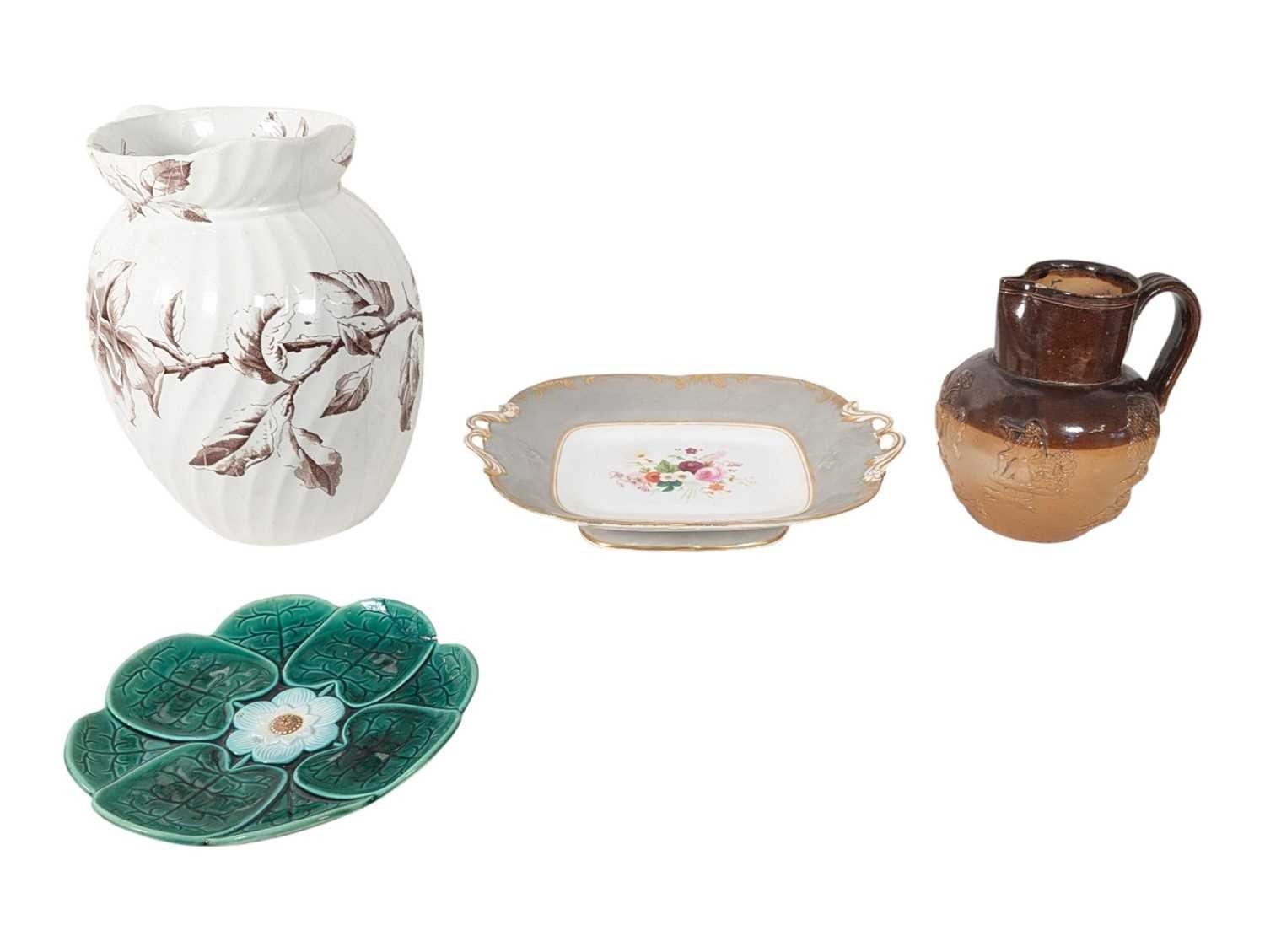 A late 19th / 20th century ironstone and stoneware household pieces. Comprising a Doulton Lambeth two tone jug, a large Masons aesthetic transfer brown and white jug, a foliage majolica plate, and a Worcester Chamberlain manner hand painted floral twin handled serving plate. Maker's marks on some of the bases. Largest measuring approx. 26cm tall.