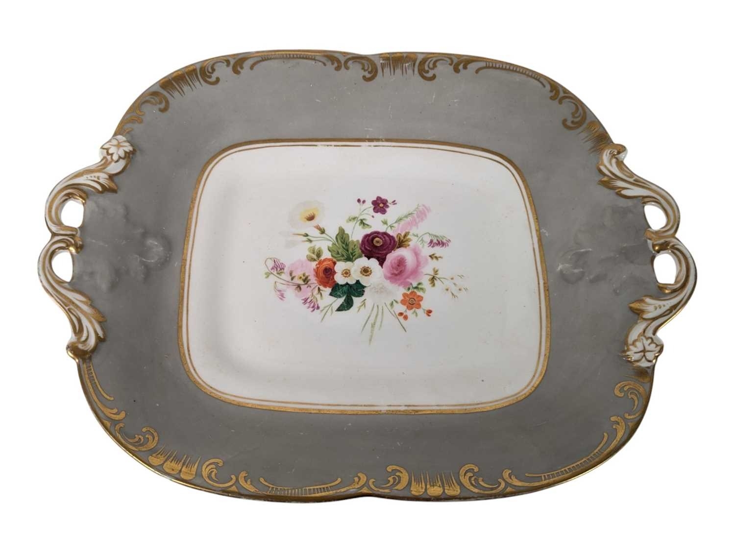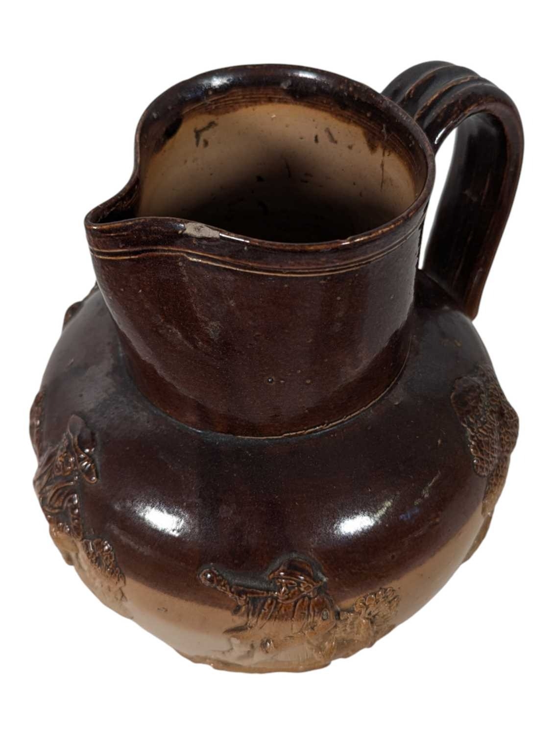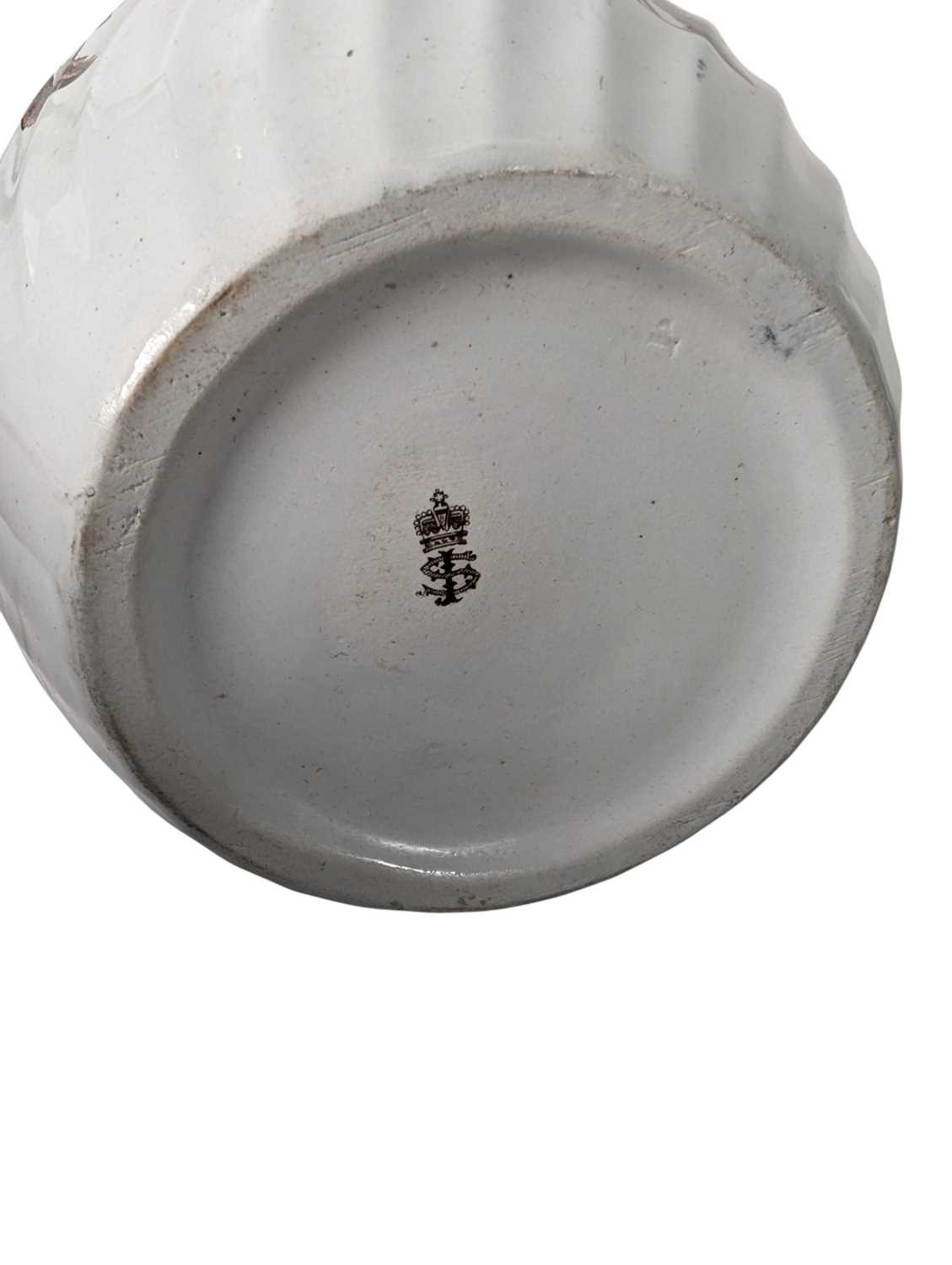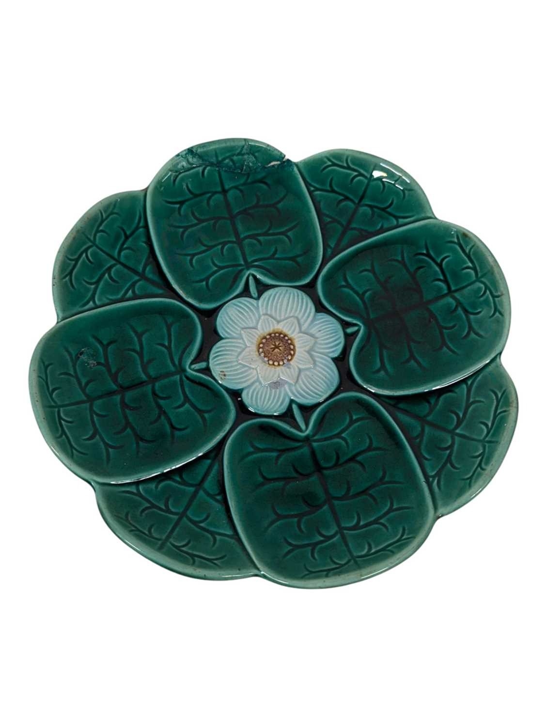 A late 19th / 20th century ironstone and stoneware household pieces. Comprising a Doulton Lambeth two tone jug, a large Masons aesthetic transfer brown and white jug, a foliage majolica plate, and a Worcester Chamberlain manner hand painted floral twin handled serving plate. Maker's marks on some of the bases. Largest measuring approx. 26cm tall.