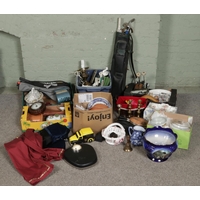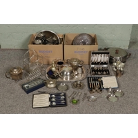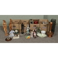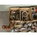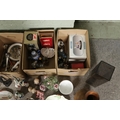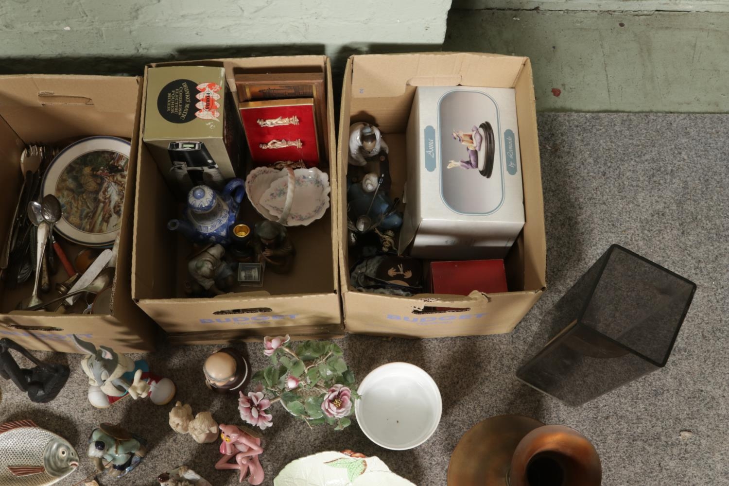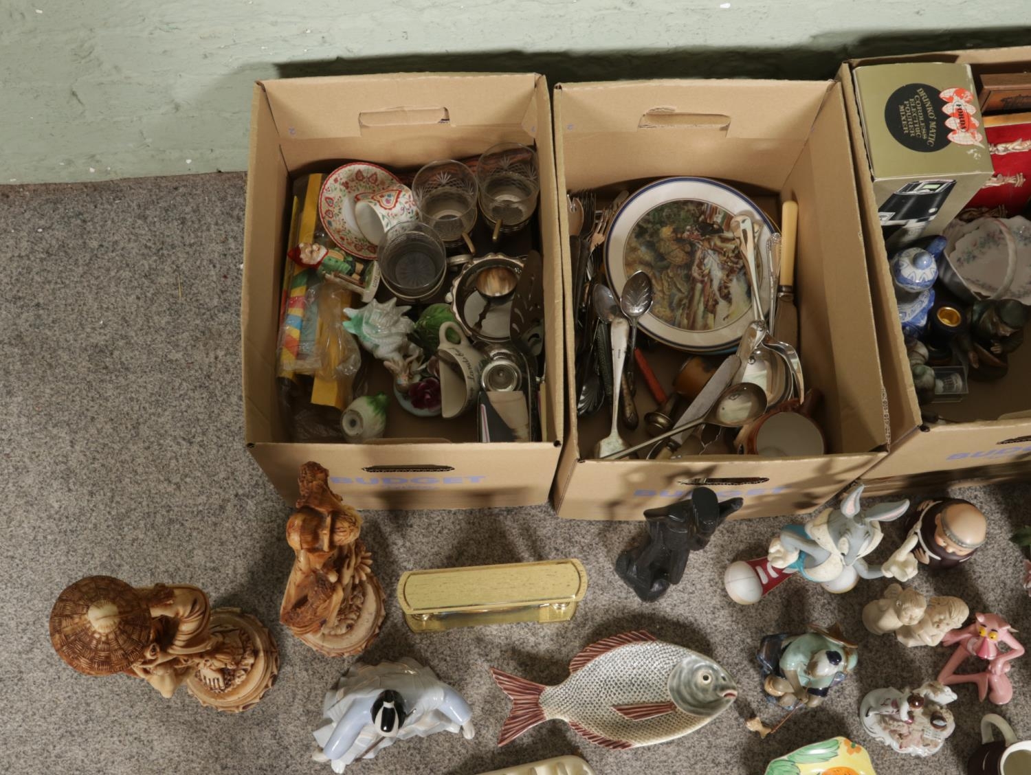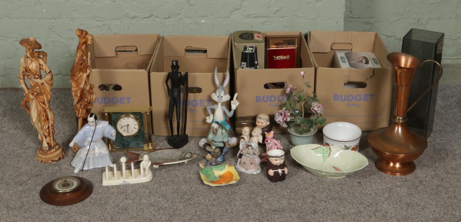 Four boxes of assorted items, to include Short and Mason 'Stormoguide' barometer, Chinese Mudman figures, Infinite quartz mantel clock, a large pair of composite figures, Warner Bros. Bugs Bunny, Carltonware foxglove dish, Royal Worcester Eversham and loose flatware.