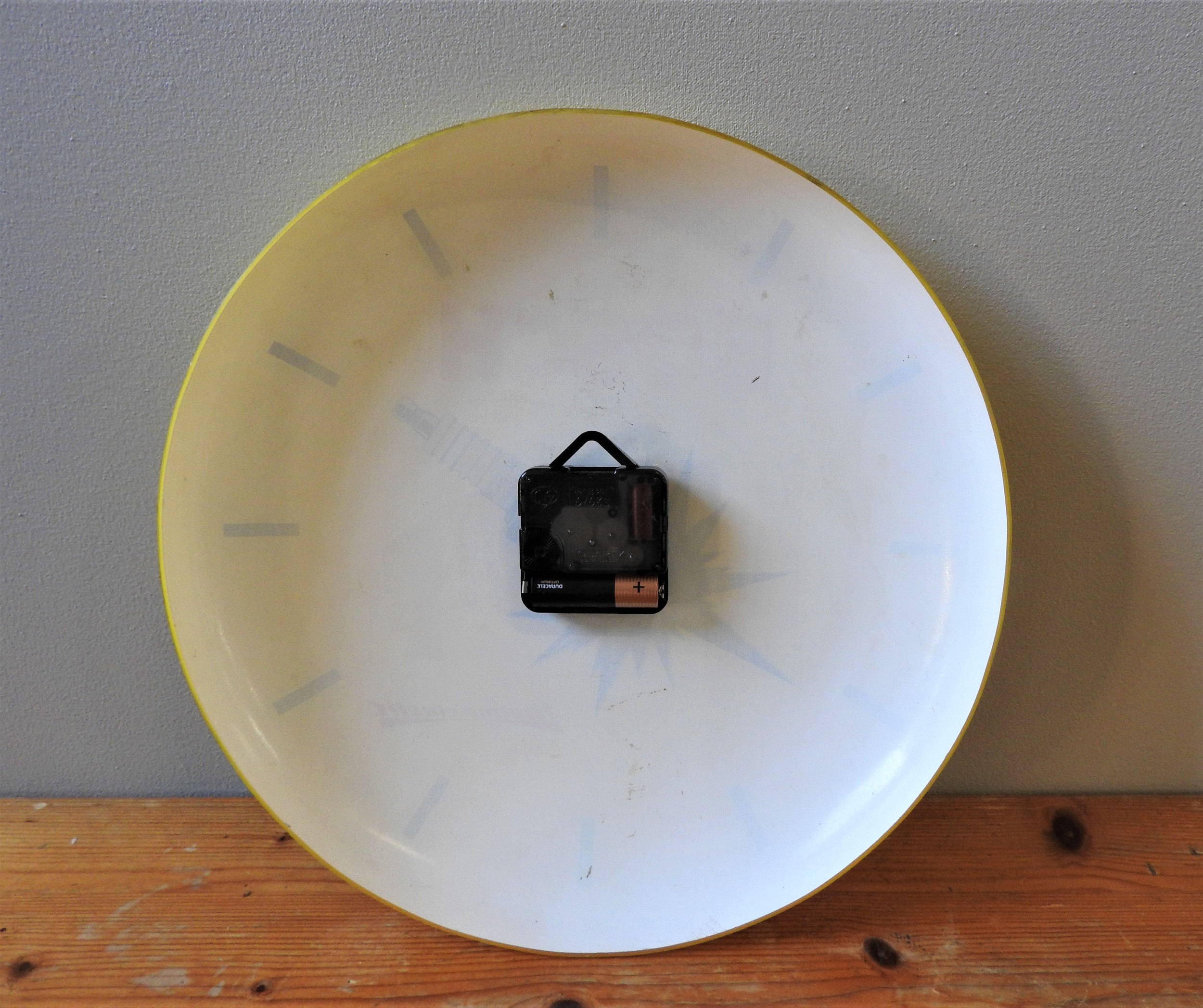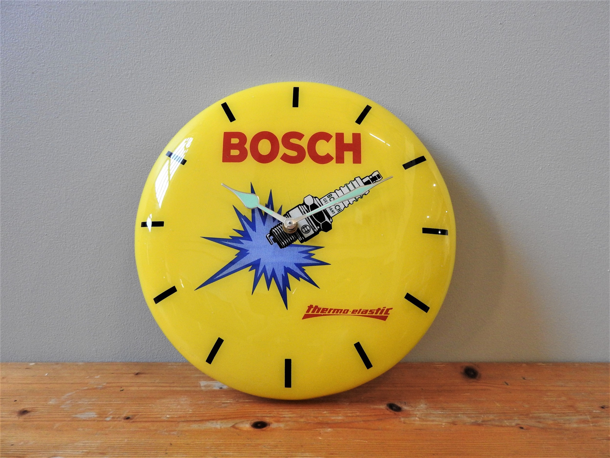 c. 1980s, in plastic, yellow with black baton hour markers and Bosch logo in red.