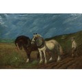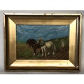 Work horses pulling a plough, signed, contained in a deep cushion gilt frame.