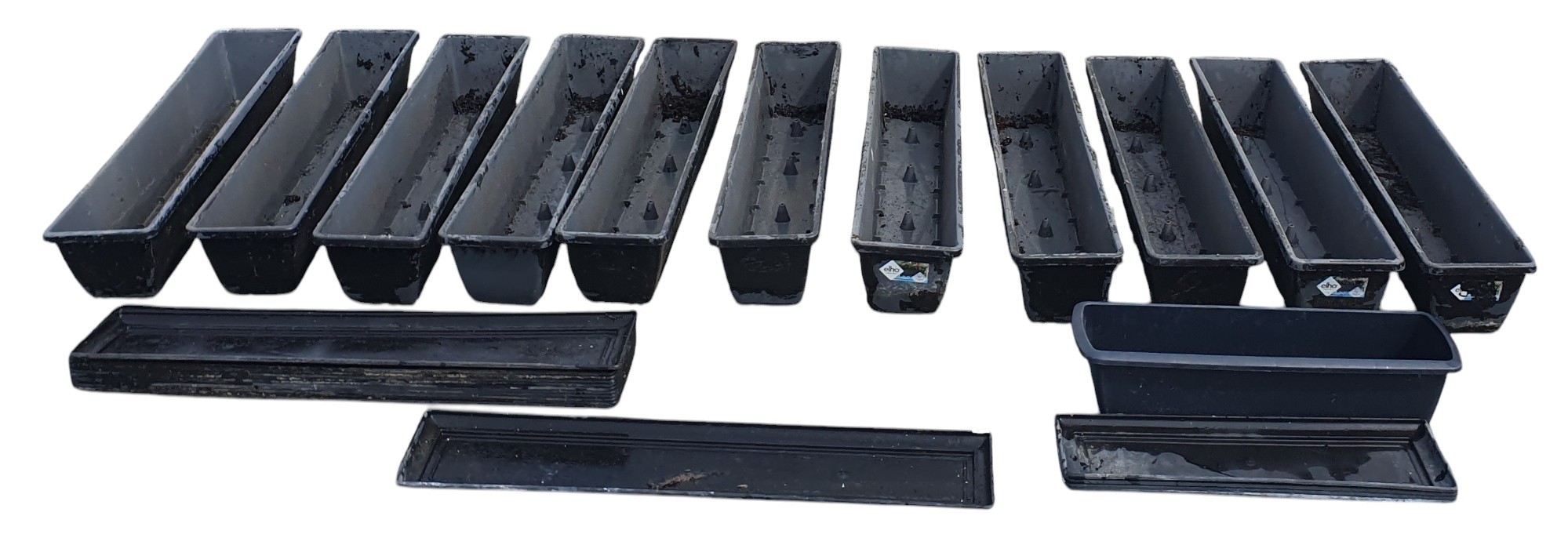 Sold on behalf of Charity, a group of 12 plastic window box Planters along with drip trays.