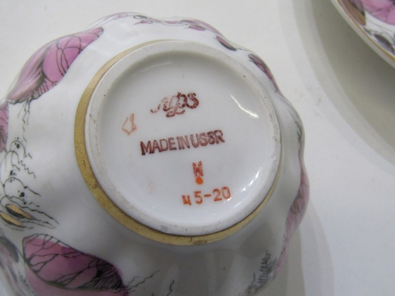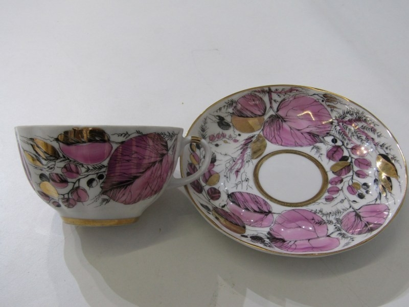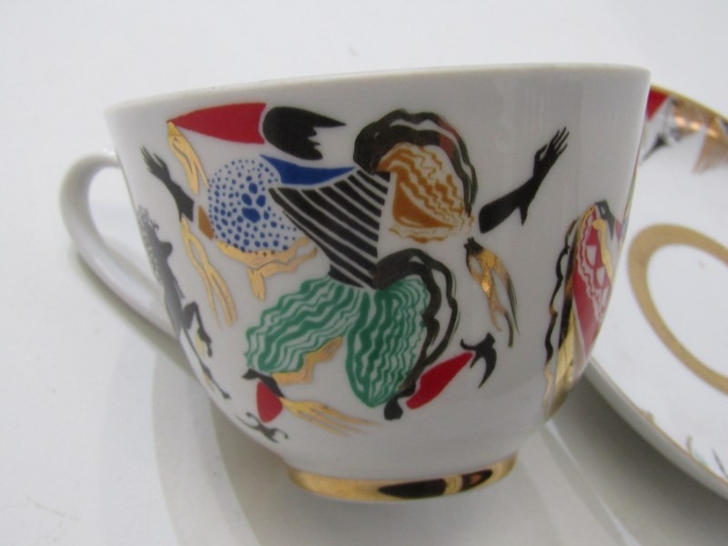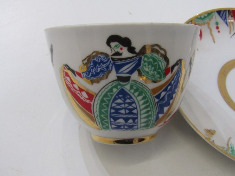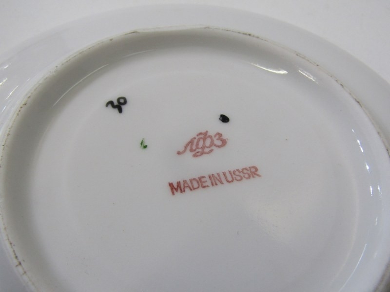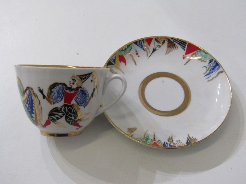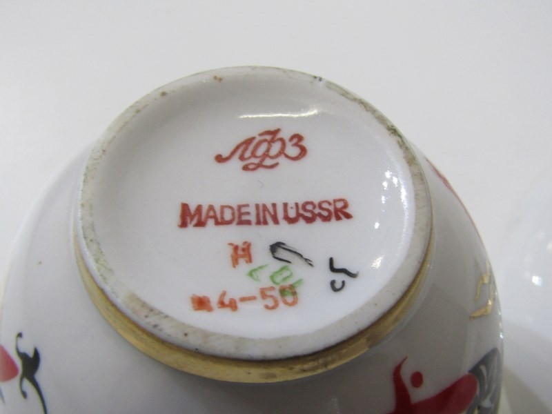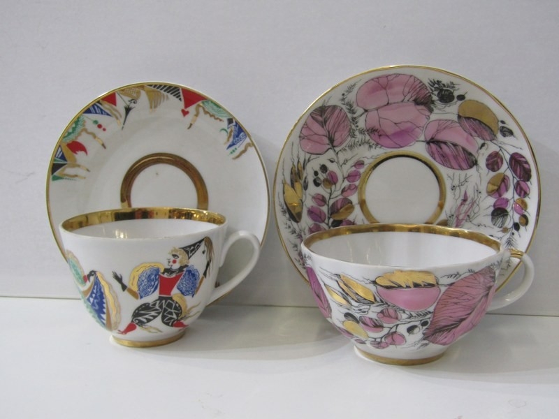 RUSSIAN PORCELAIN, 2 Lomonosov porcelain cups and saucers, 1 depicting Russian dancers, other floral decoration