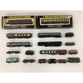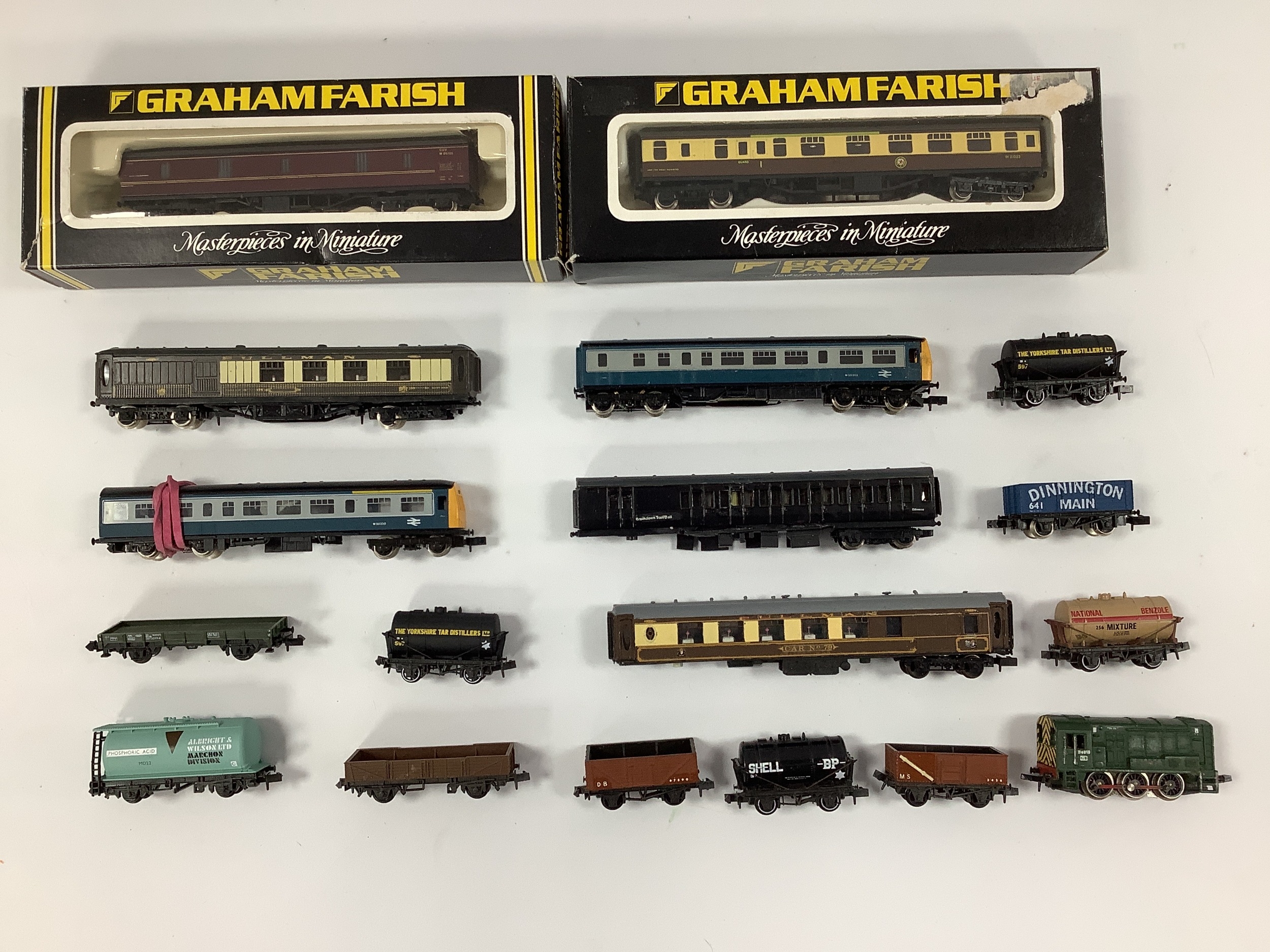 An N gauge class 08 diesel shunter in BR green with a Graham Farish two-car DMU in blue-grey (both untested, DMU trailer car has loose bogie), ten wagons, and five coaches (two boxed, others missing wheels).