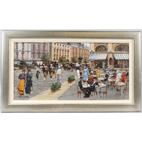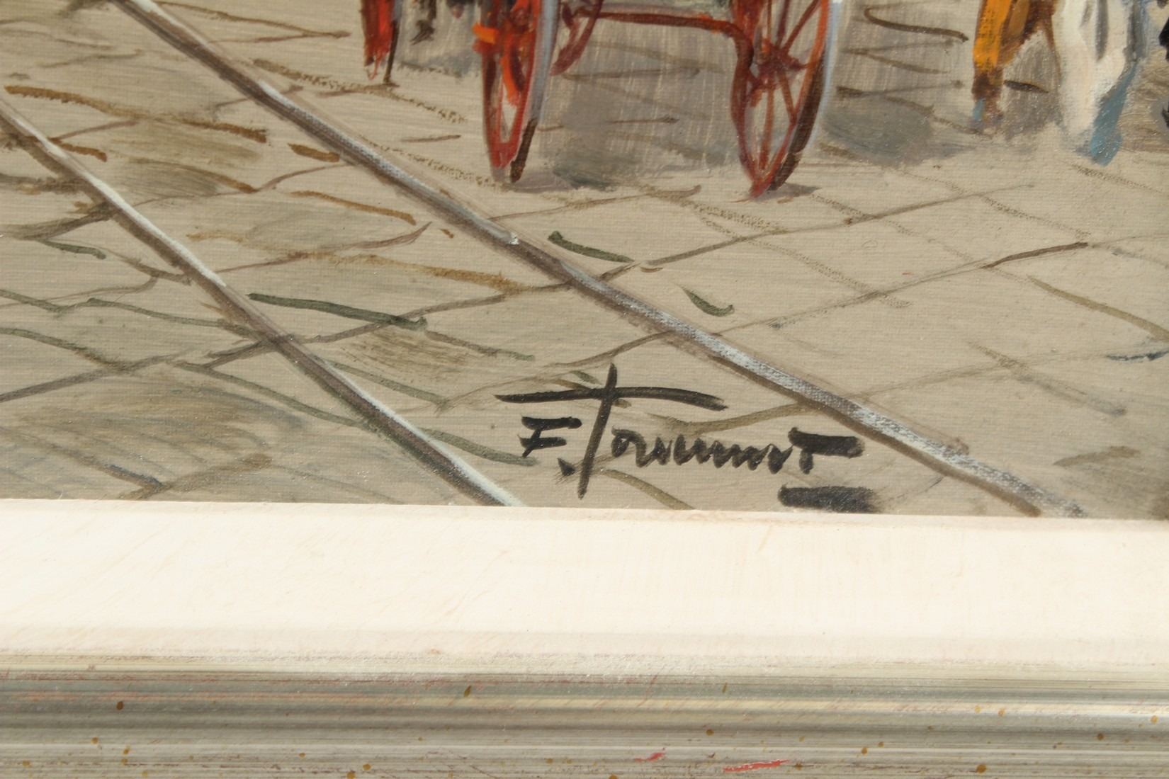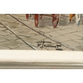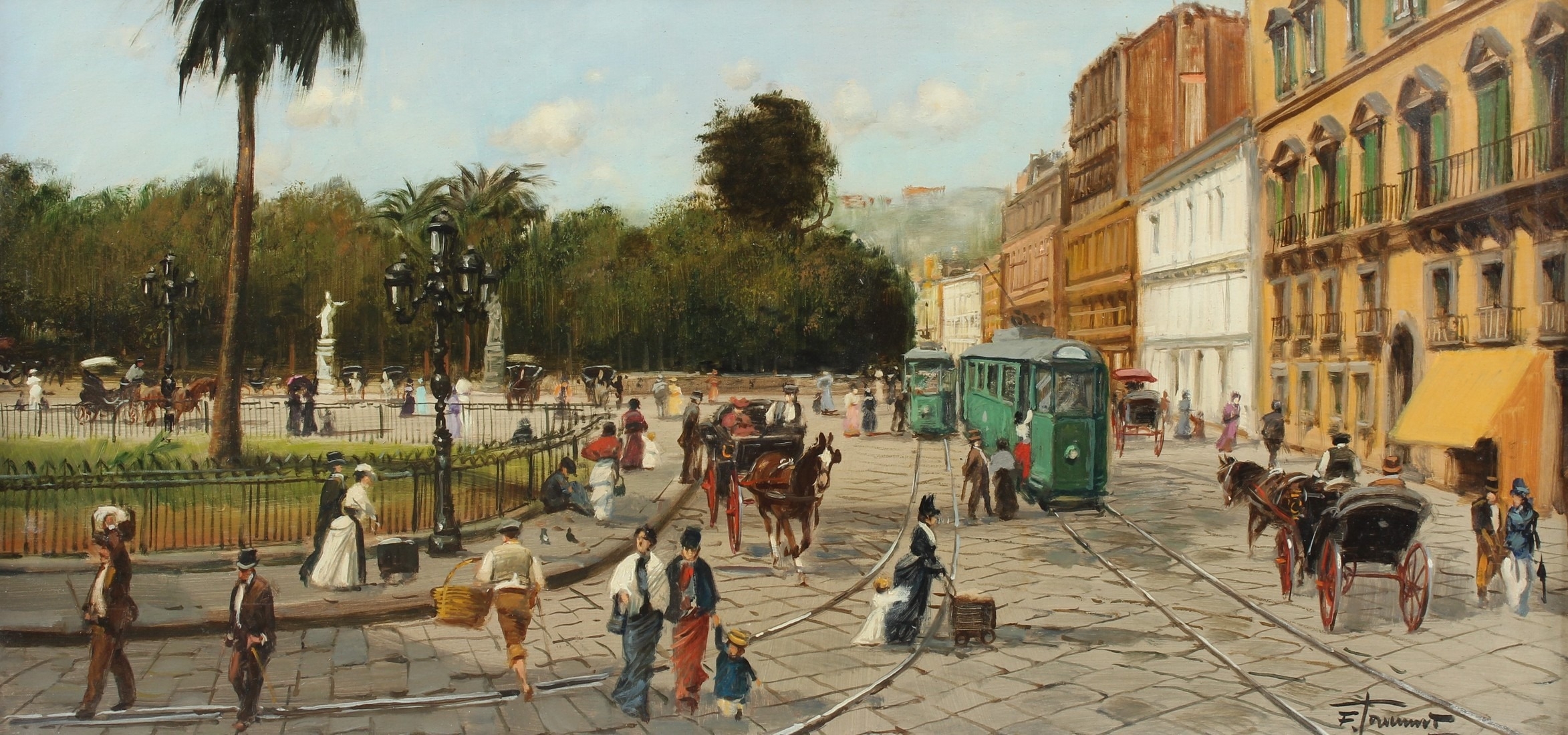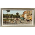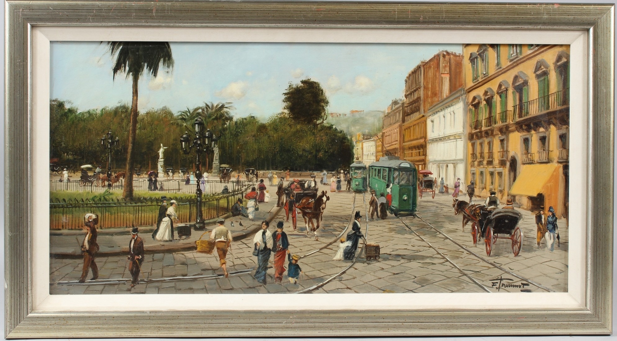 CONTINENTAL SCHOOL Street scene with carriages and trams oil on board signed indistinctly 28 x 58cm