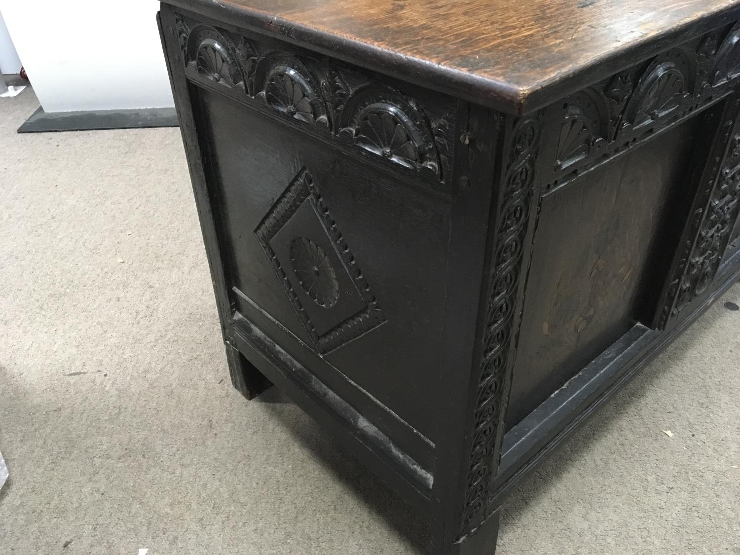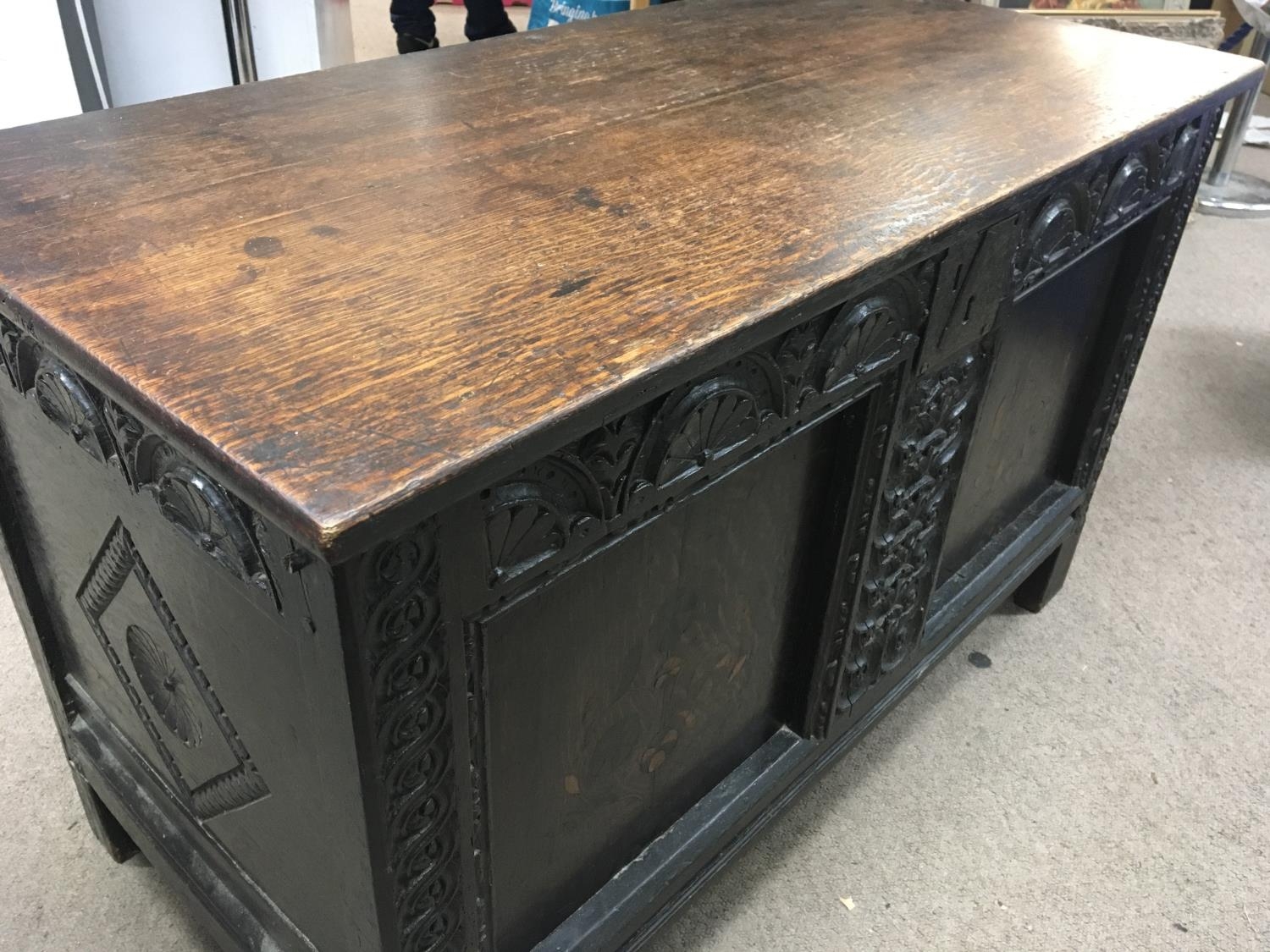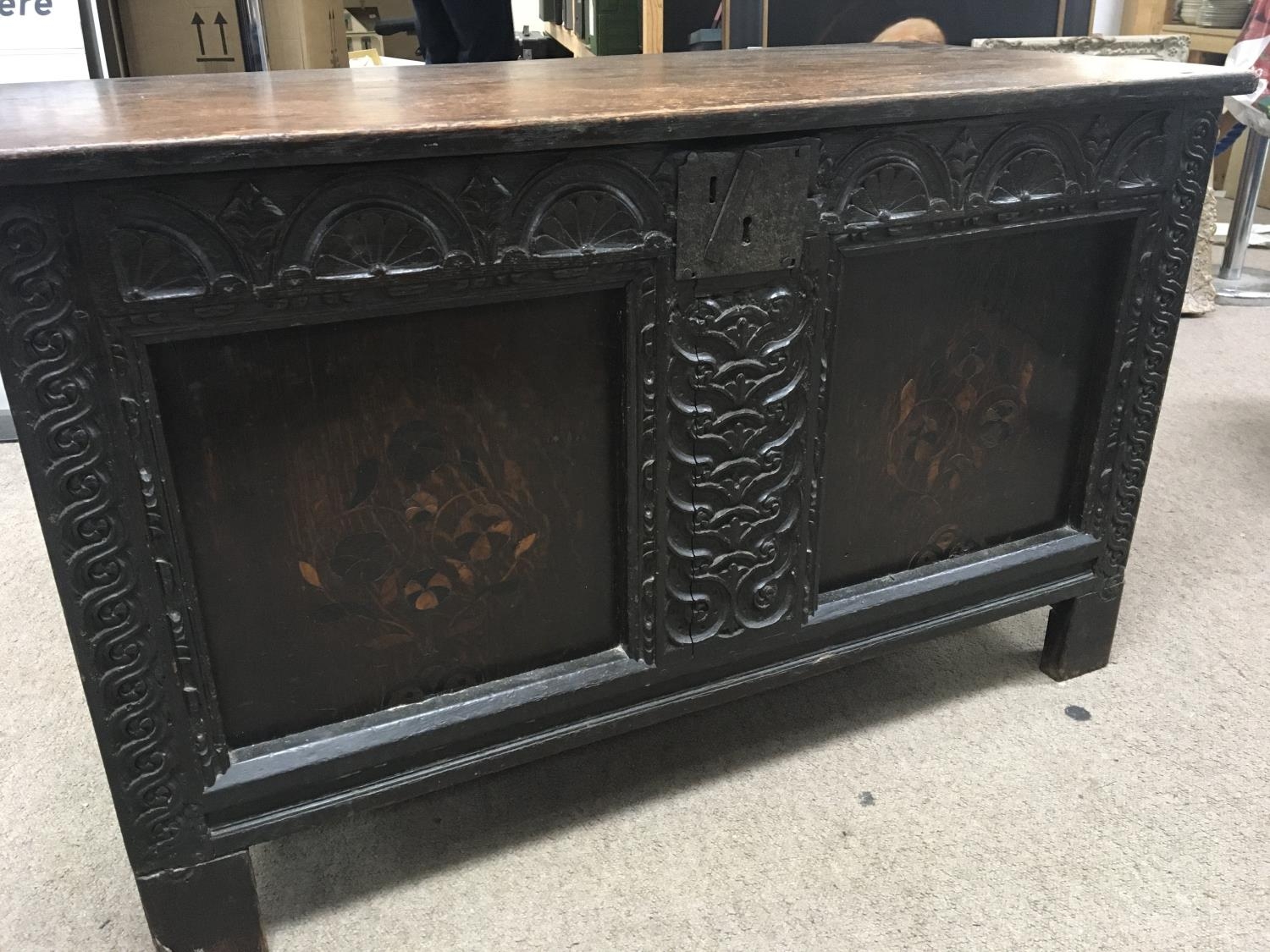 A late 17th or Early 18th Century chest coffer with a hinged top above inlaid and carved panels. Some later alterations. 108x53cm