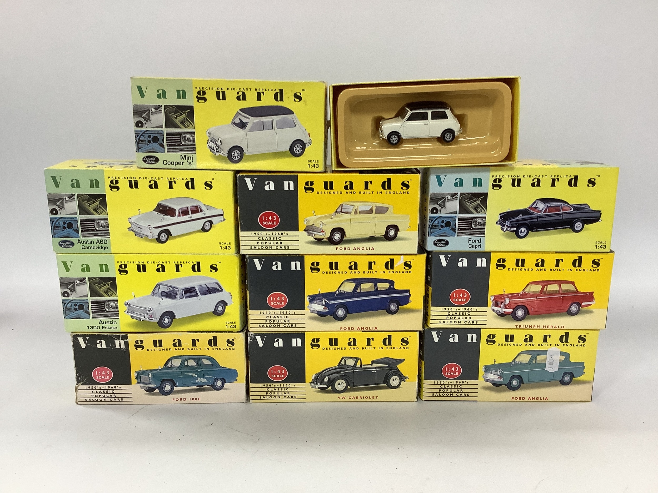 Ten Lledo Vanguards 1:43 Scale Diecast Model Cars to include Ford Capri, Mini Cooper 'S', boxed. Some wear to boxes, inner packaging to VA21002 missing.