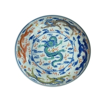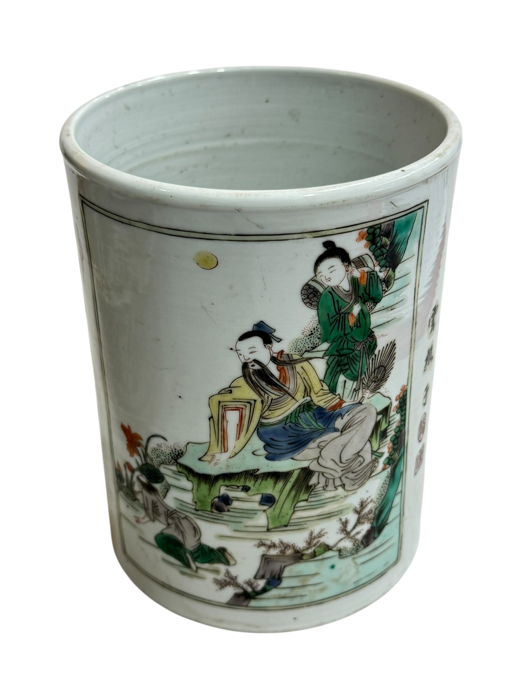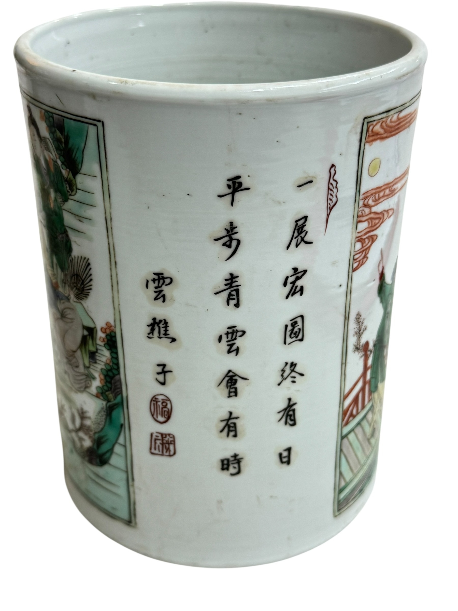Chinese brush pot decorated with figures and verse, and Chinese pierced pottery basket.