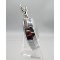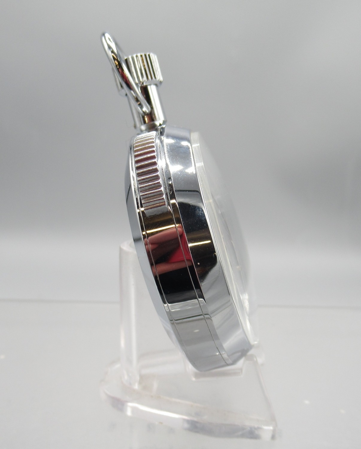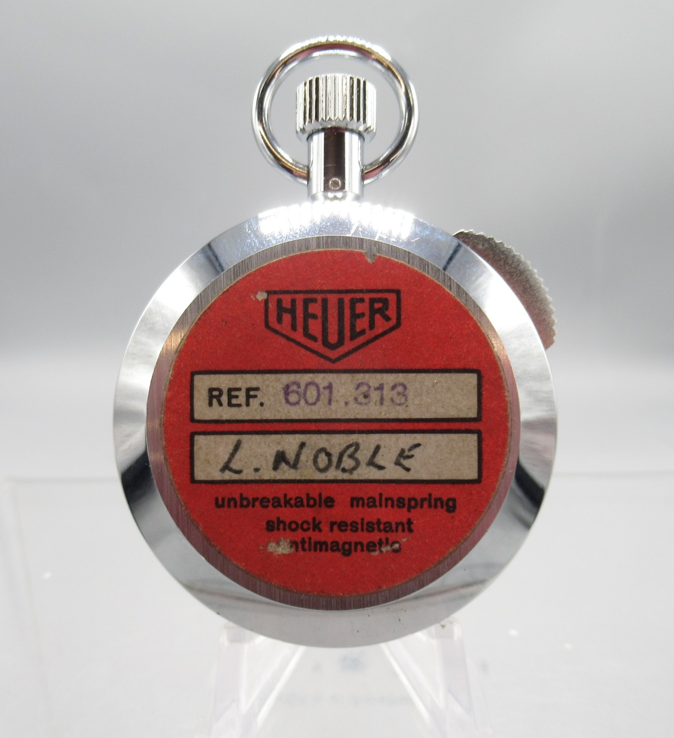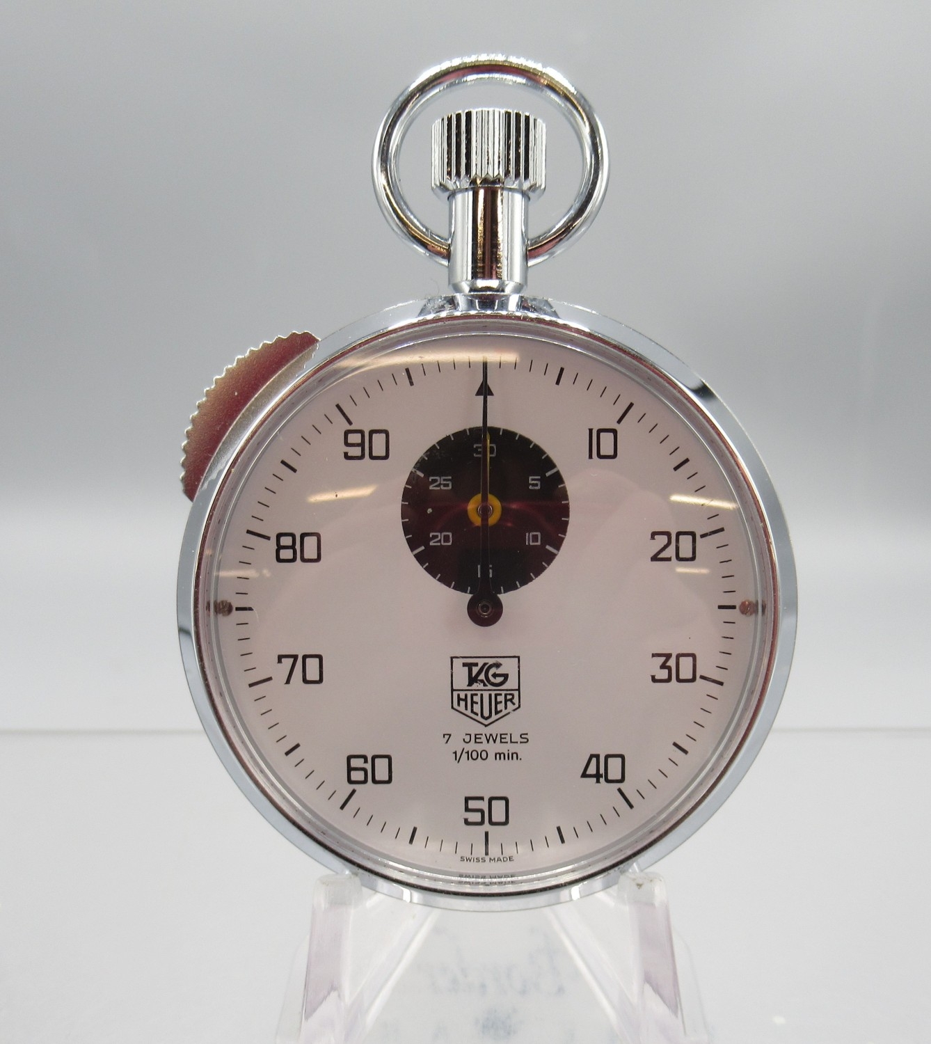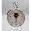 Tag Heuer chrome 1/100min stopwatch, signed white Arabic dial with 30 minute subsidiary dial, snap on case back, 7 jewel movement, D53.4mm