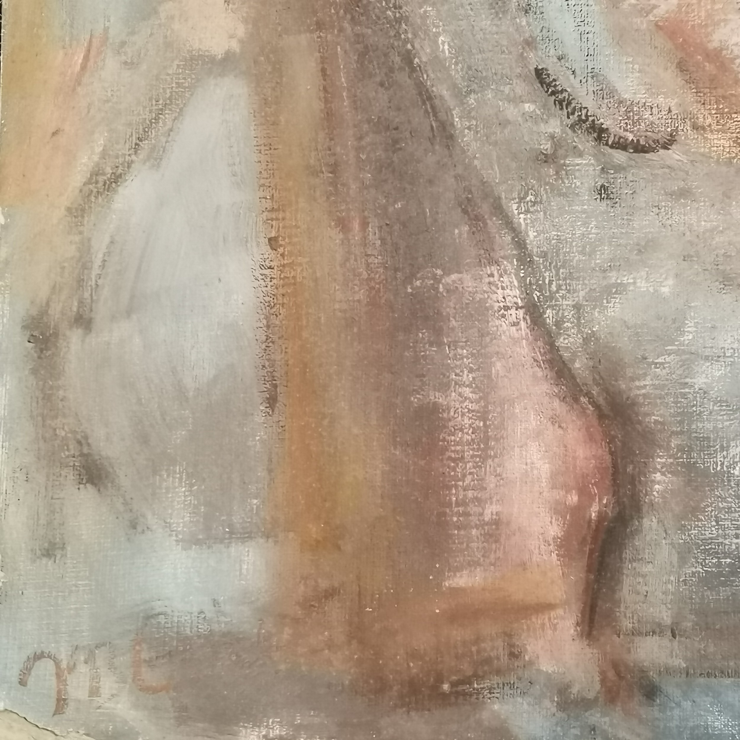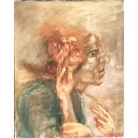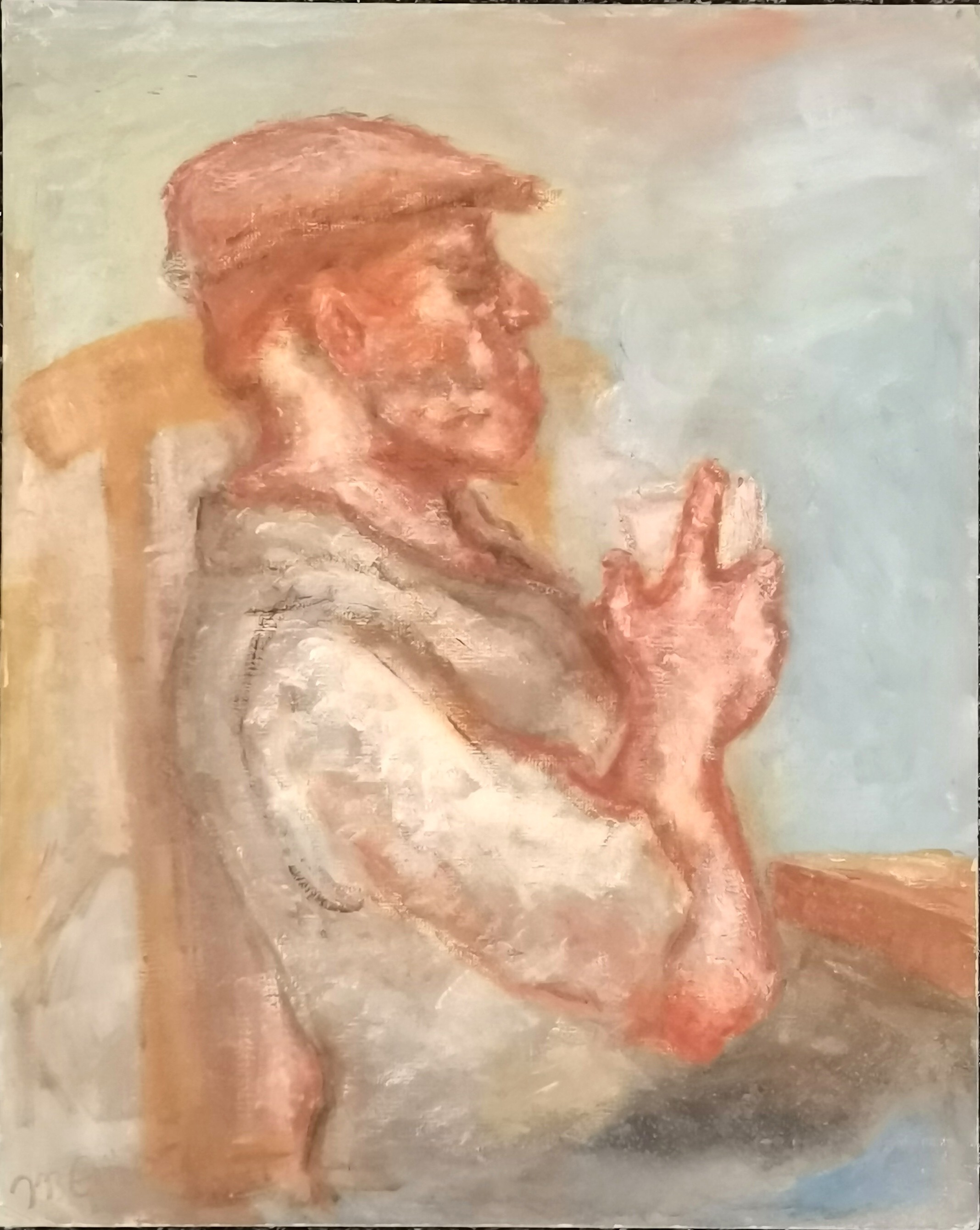 Jim Gilbert (1933-95) oil painting on board of a seated gentleman drinking - 51cm x 41cm ~ slight losses to paint finish in the corners