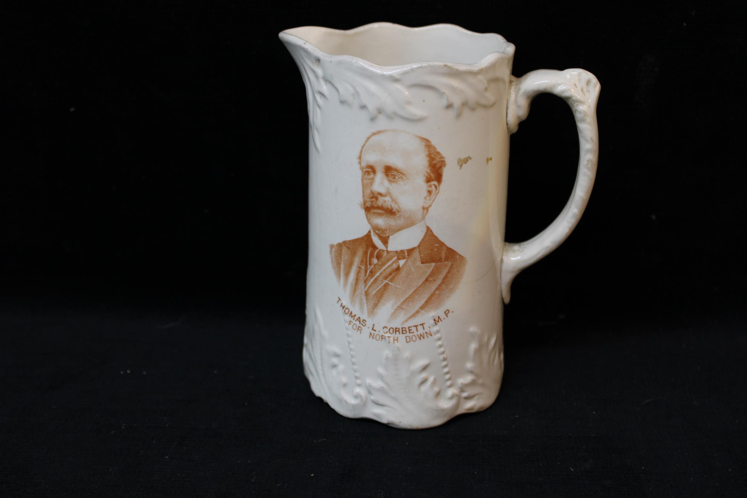 A Victorian jug depicting Thomas L. Corbett MP for North Down 16mcH