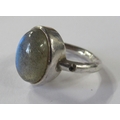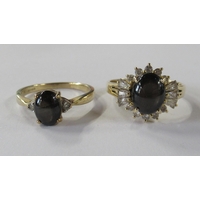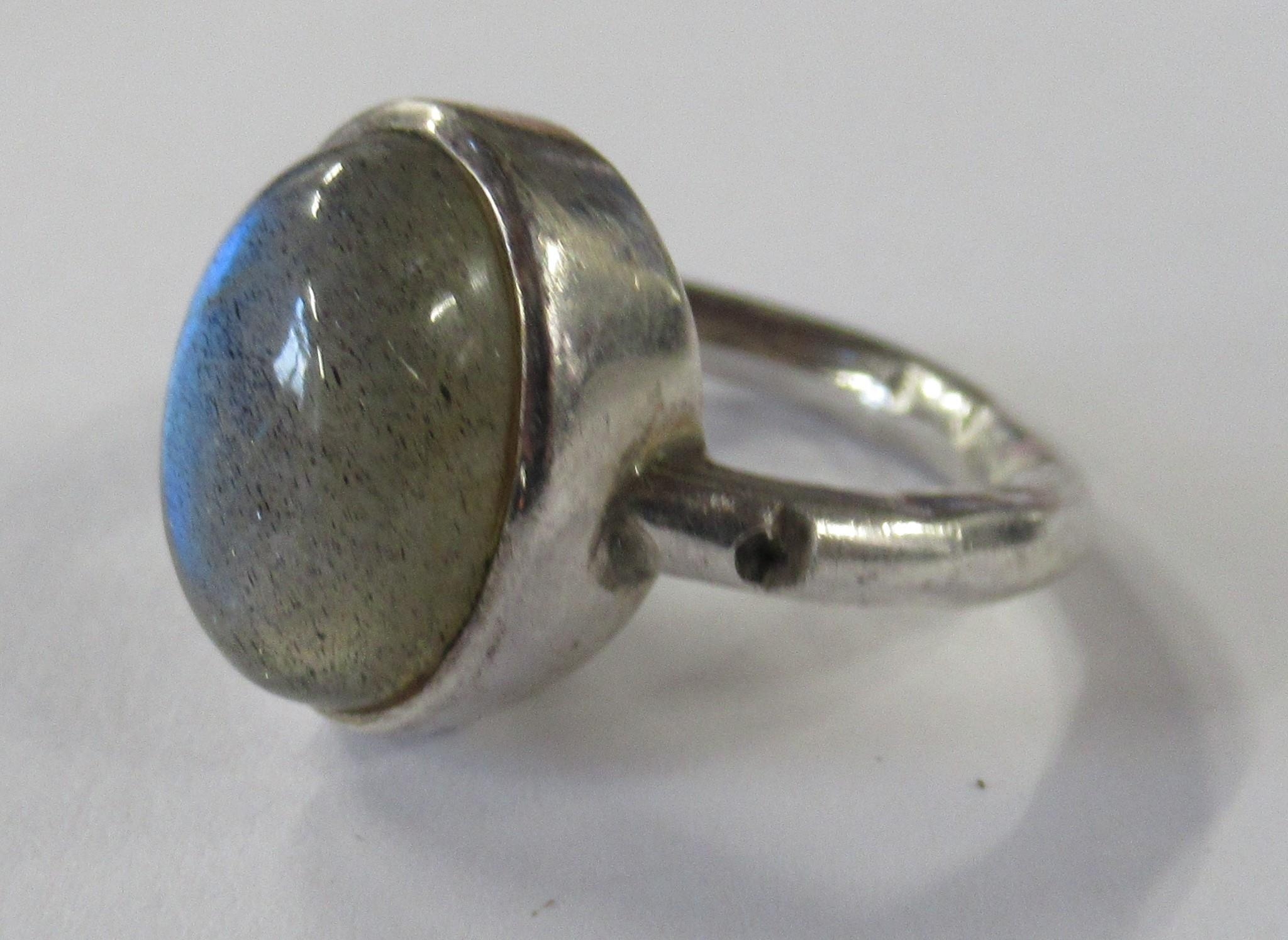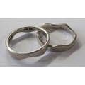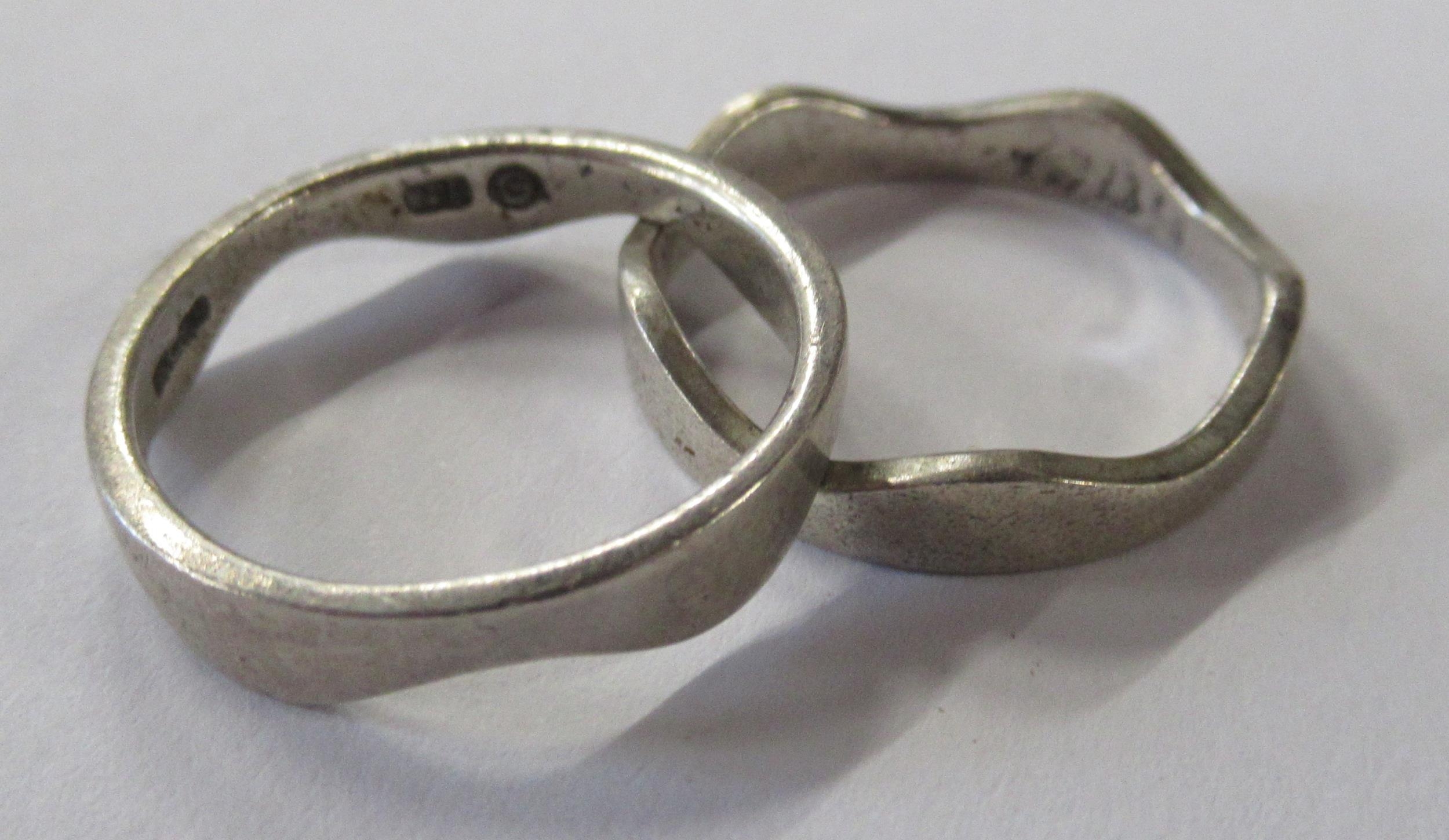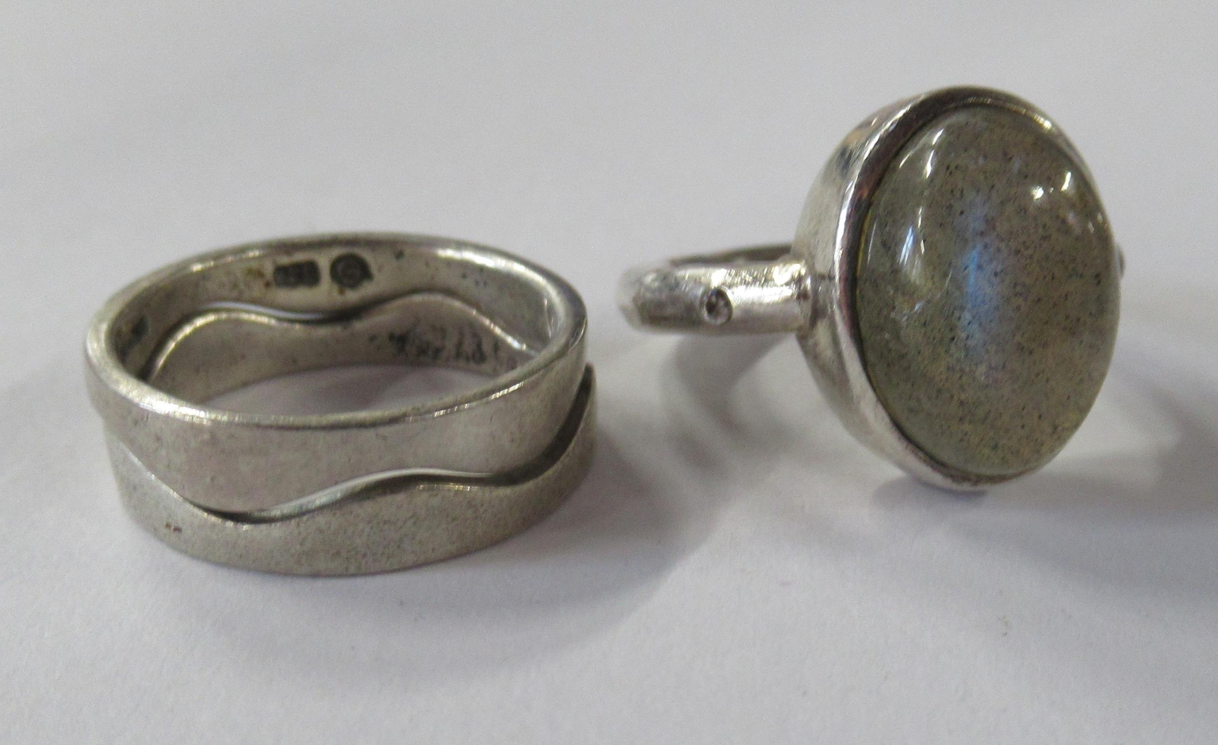 A silver coloured stacking ring, in two sections, together with a stone set ring